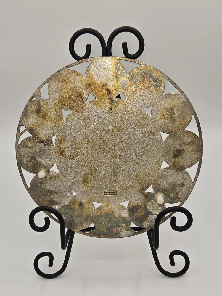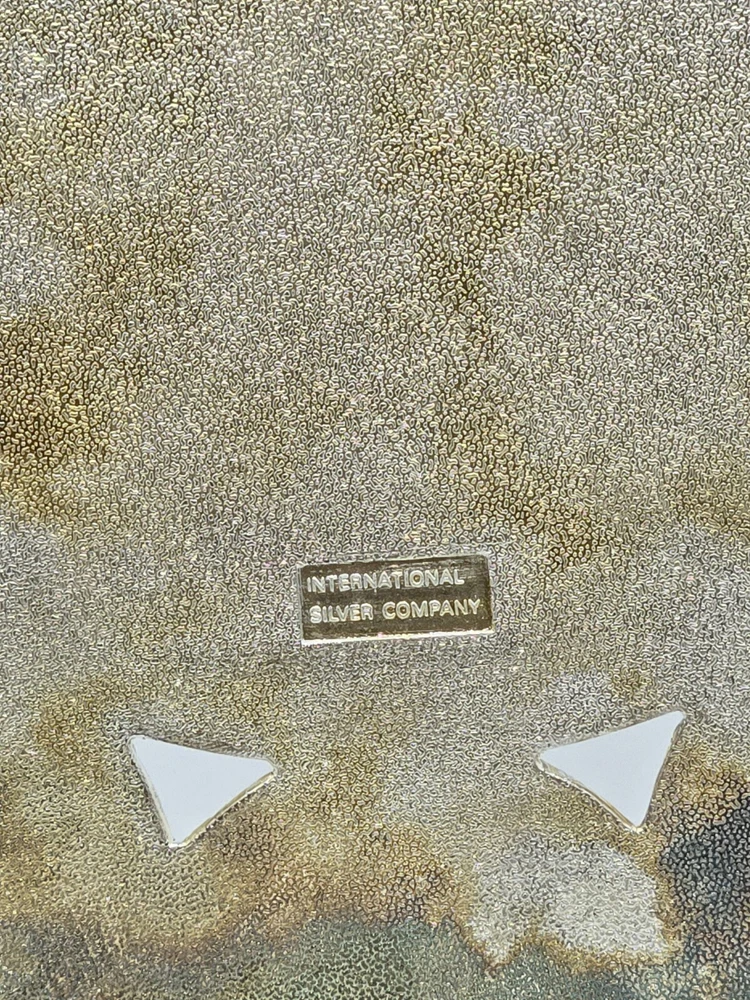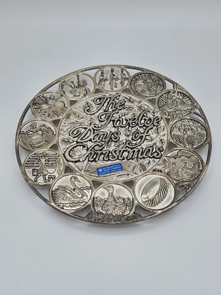 This International Silver Company trivet features a 12 Days of Christmas design in silverplate metal, perfect for holiday decor or serving. Made in 1995, this collectible piece adds a festive touch to any Christmas celebration. The trivet is a functional and decorative item that commemorates the classic holiday song in a timeless silver finish by the international Silver Co.