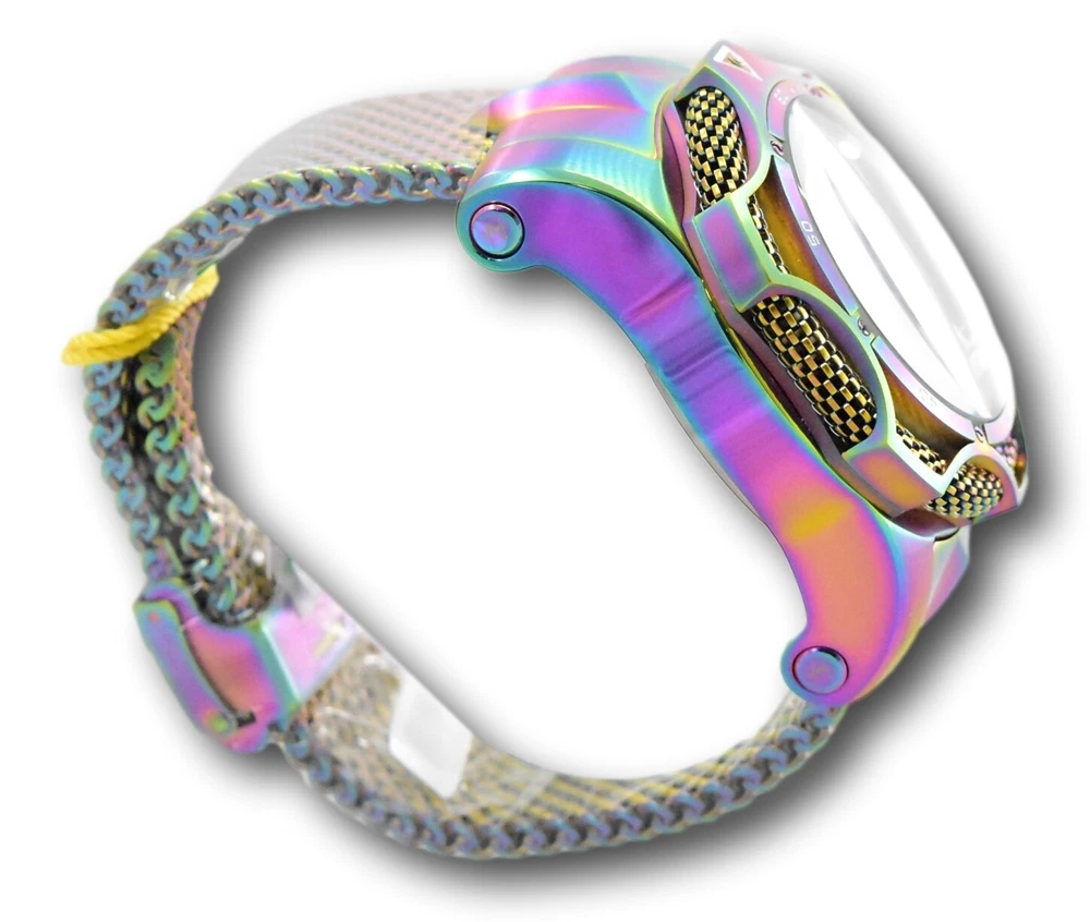 This Invicta Reserve Venom Rainbow Iridescent watch is a stunning timepiece that will complement any outfit. The watch features a 52mm stainless steel case with a polished finish and a unidirectional rotating bezel available in blue, purple, multicolor, or green. The non-numeric hour marks and round indexes on the black dial are luminous, making them easy to read, especially in low-light conditions. In addition to the chronograph feature, this watch also has a water-resistant capability of up to 1000 meters, making it suitable for water activities. The bracelet is also made of stainless steel and metal, with a buckle closure and a 26mm lug width. This watch comes with its original box and packaging, making it a perfect gift for any occasion.