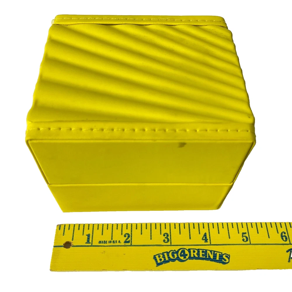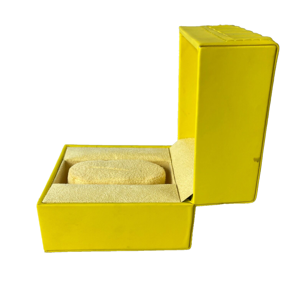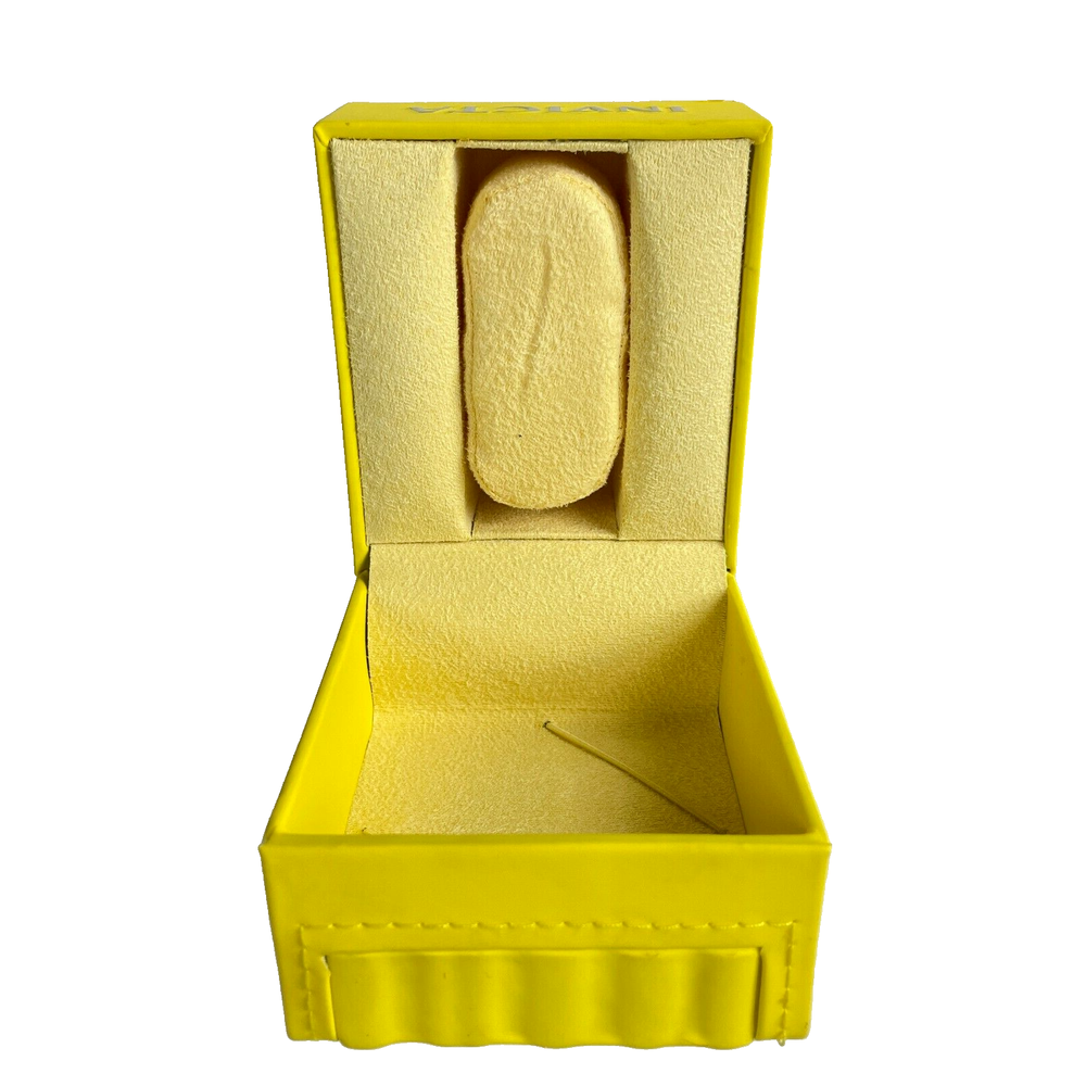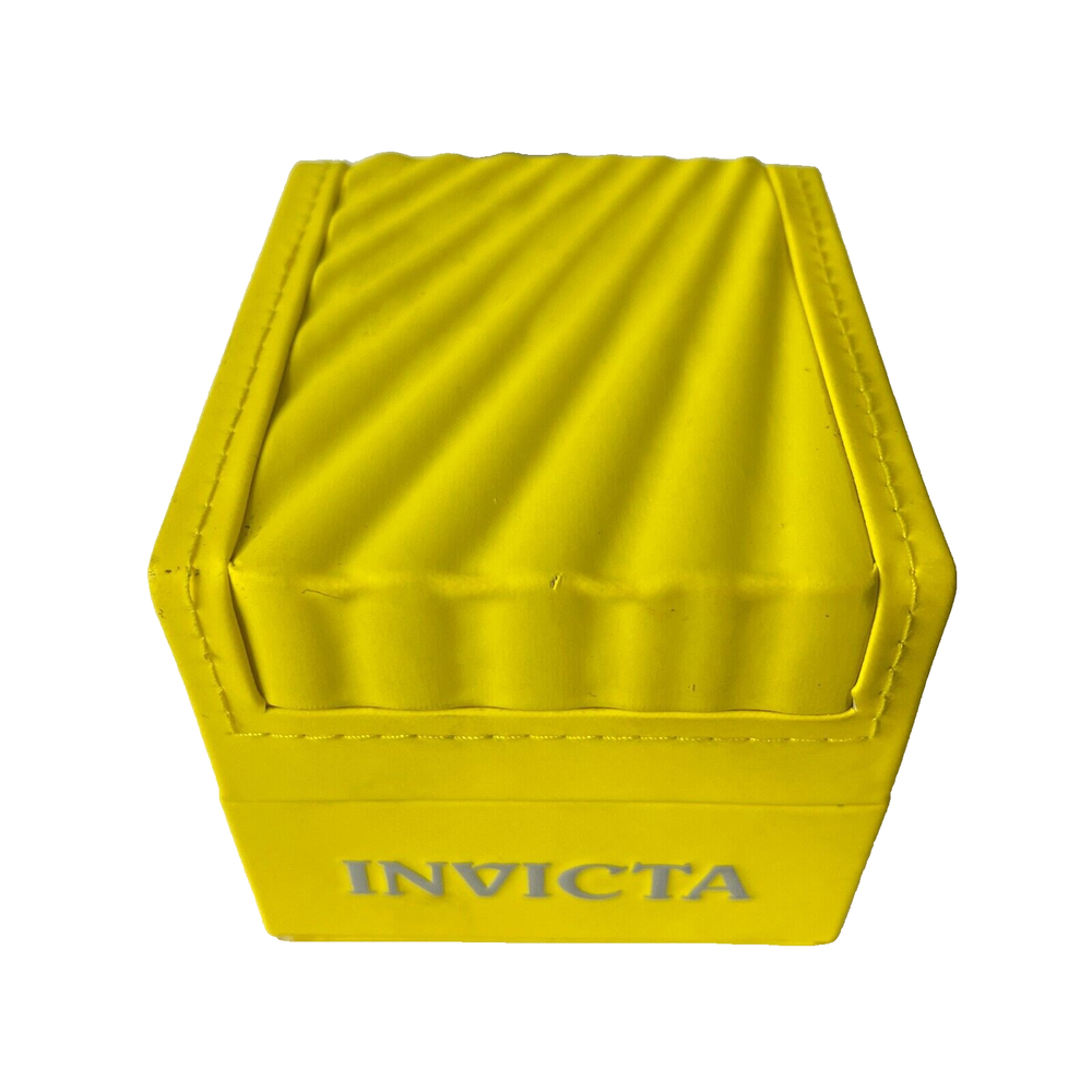 Invicta Watch Empty Yellow Display Box/ Clam Shell Case display box for a single watch (no watches are included) see pics for scale interior foam cushions; exterior stitched faux leather as shown, very minor cosmetic wear