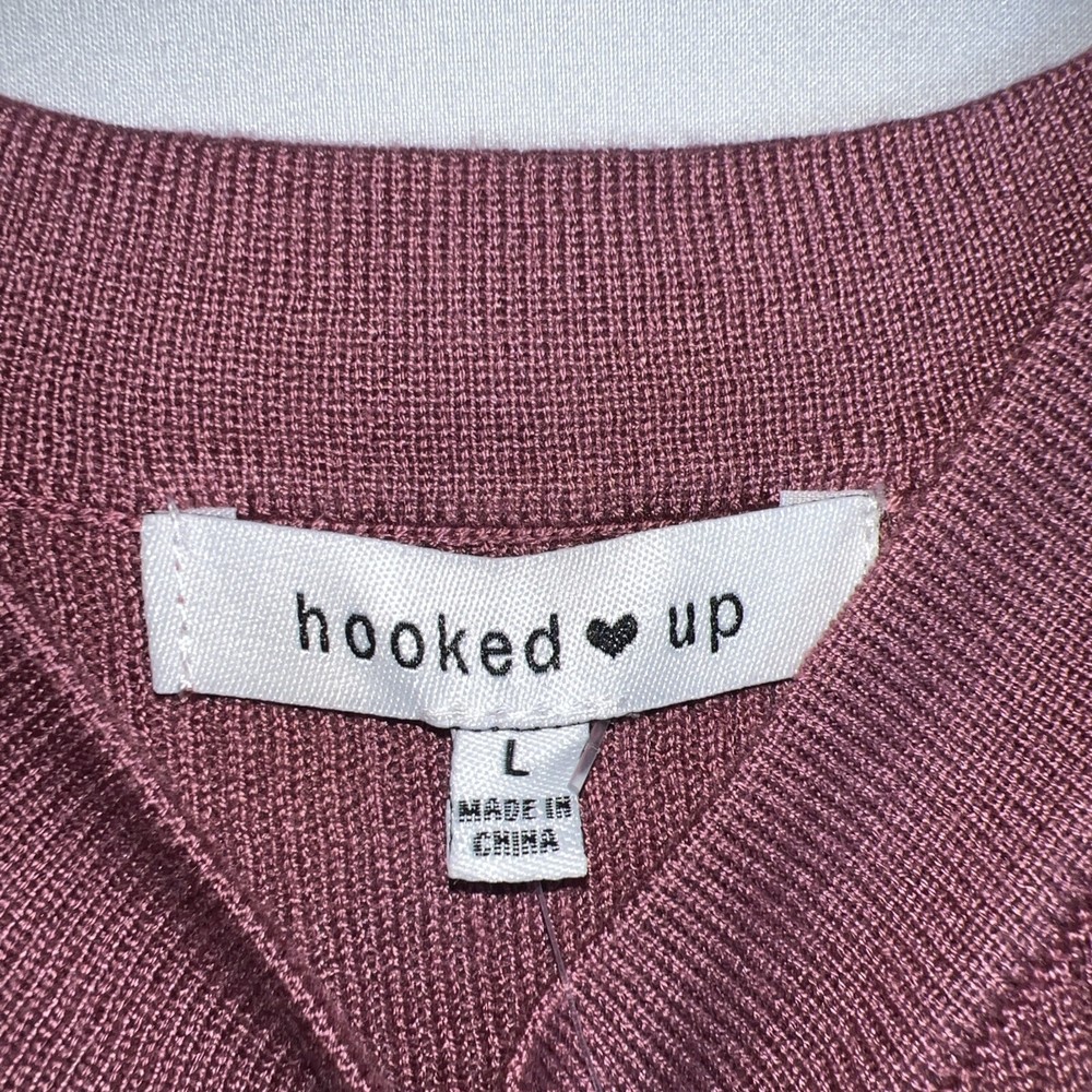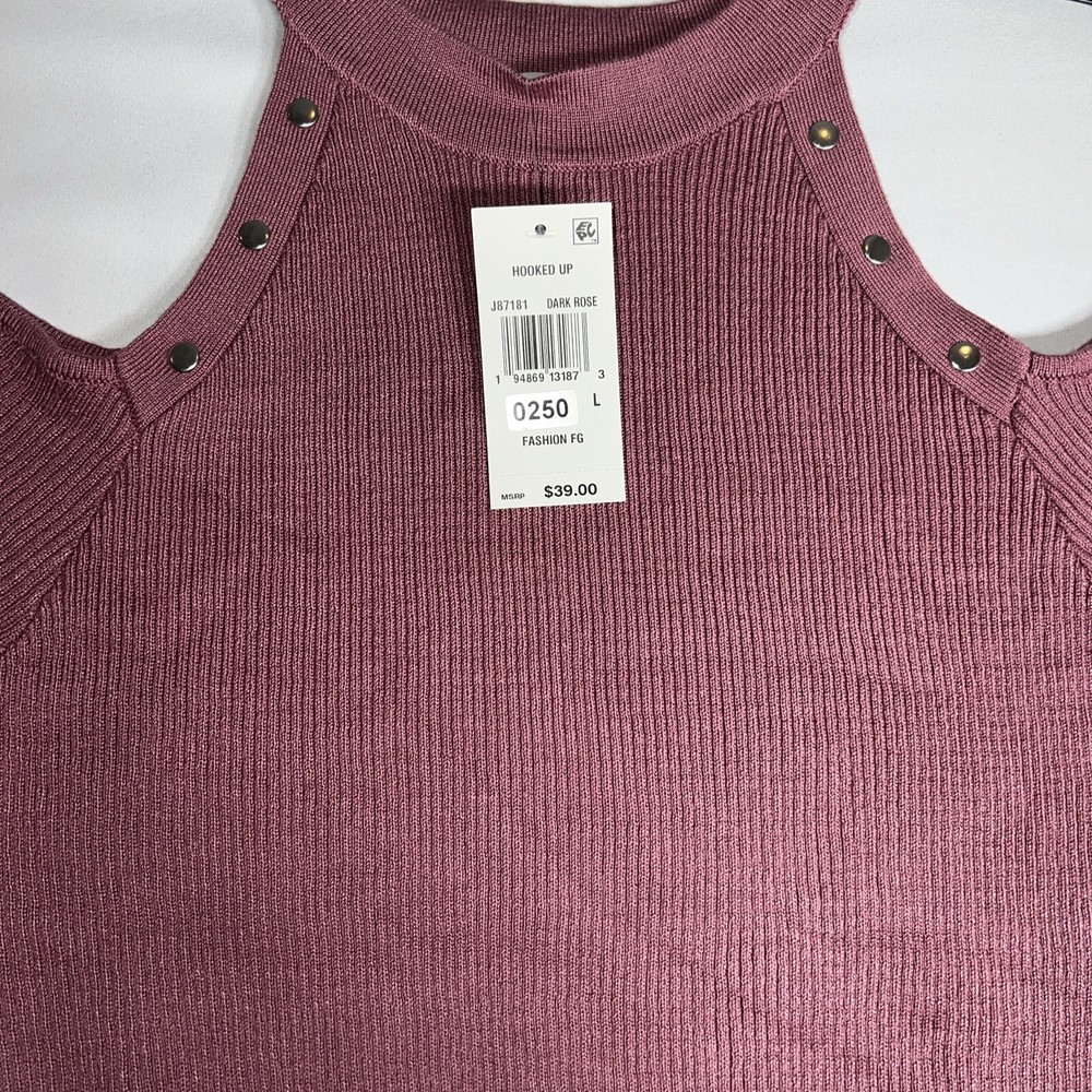 Elevate your wardrobe with this stunning Hooked Up by IOT sweater. The dark rose color and studded accents make it a perfect addition to any outfit. The pullover style and cold-shoulder design add a touch of elegance to this comfortable sweater. Available in size L, it is suitable for regular-sized women. This sweater is perfect for any occasion and can be paired with jeans, skirts, or dresses.
