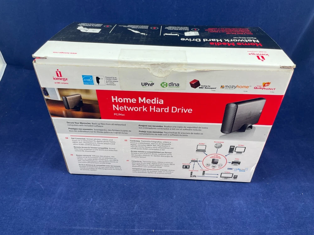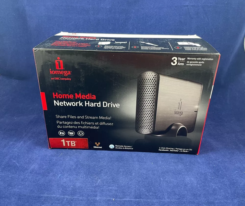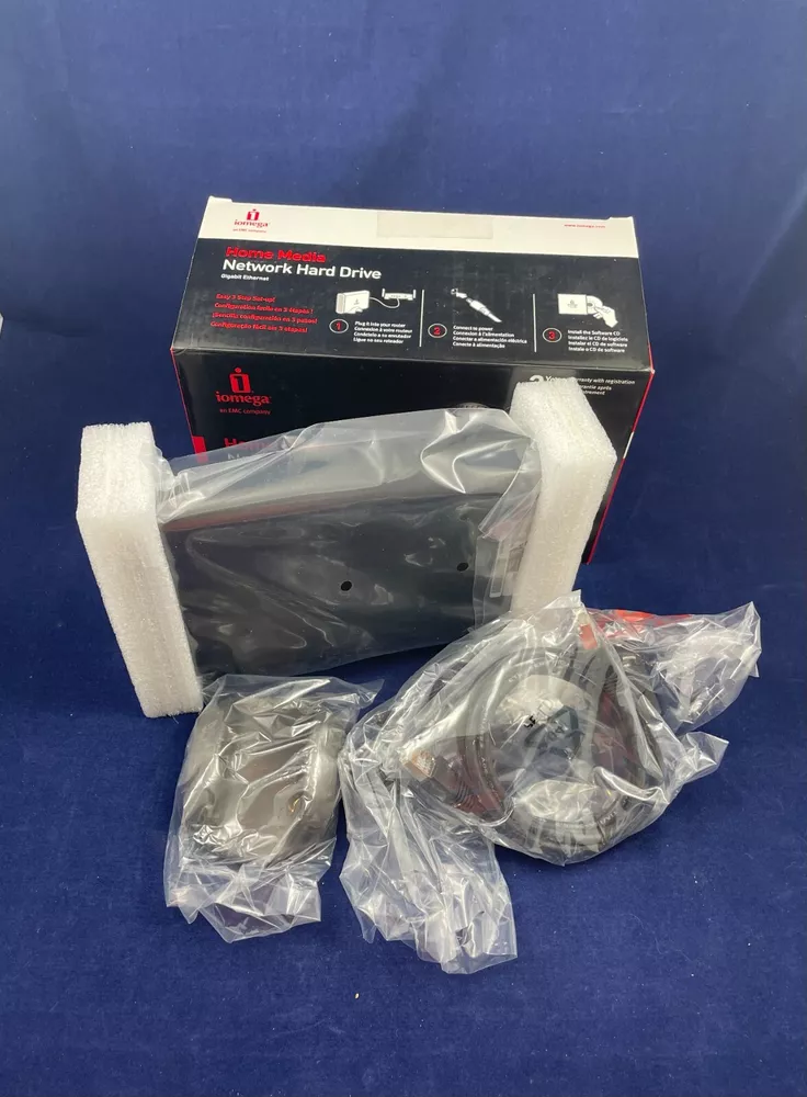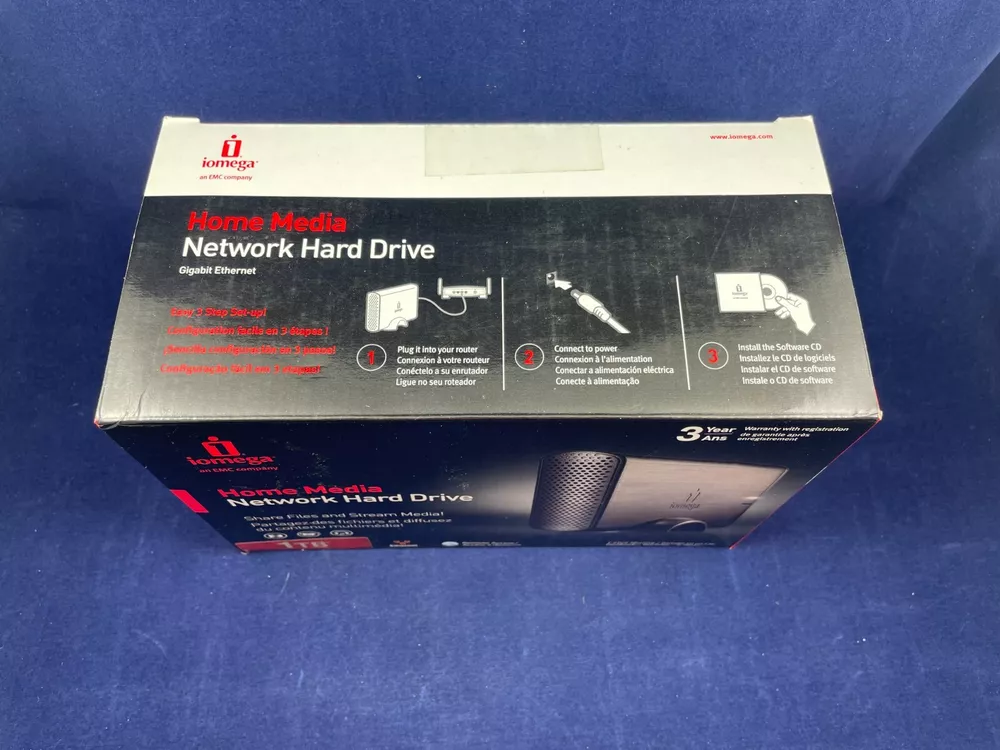 Experience seamless storage and data sharing with the Iomega Home Media Network Hard Drive 1TB. This versatile network hard drive is compatible with both PC and Mac, and boasts a 1TB storage capacity. Its Ethernet interface ensures reliable connectivity, while its sleek black design complements any workspace. Ideal for personal and professional use, the Iomega Home Media Network Hard Drive 1TB is a must-have for anyone looking to streamline their data storage and sharing needs. 3 Easy Steps: 1.) Plug into your router 2.) Connect to power 3.) Install the Software CD For inventory - Bookshelf