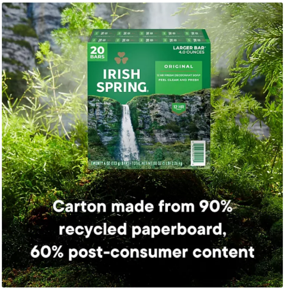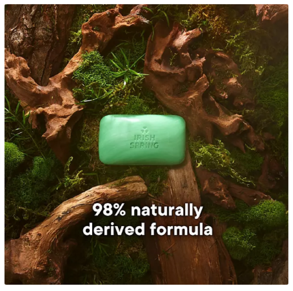 Irish Spring Bar Soap, Original Clean, 4 oz., 20 ct. Description: Smell like you came from a nice-smelling place with Irish Spring Bar Soap. Count on Irish Spring Original Bar Soap to leave your skin feeling clean — our original bar soap for men is made with a 98% naturally derived formula that keeps you fresh for 12 hours. Irish Spring Original Bar Soap has a sudsy lather that washes away bacteria, so you can use it as a hand soap bar and keep the fresh smell going all day long. Plus, this soap bar is mild for skin. It's paraben, phthalate and gluten free and has flaxseed oil. Feel good while washing from head-to-toe with Irish Spring. Specification: Irish Spring Bar Soap in new larger size bars (4 oz. vs. 3.7 oz.) This bar soap for men is mild for skin Sudsy lather
