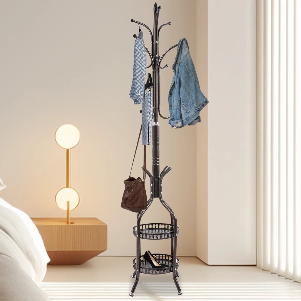 This coat rack is a stylish and sturdy addition to any entryway or bedroom! The bronze iron finish gives it a modern yet classic look, and the free-standing design makes it super versatile. Assembly was quick, and it holds jackets, bags, and scarves without wobbling. The hanging rod is a nice bonus for extra storage. Great value for the price—highly recommend!