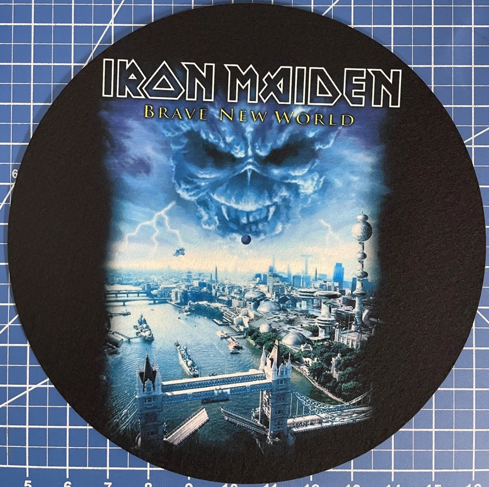 Enhance your vinyl record listening experience with this Iron Maiden - Brave New World Turntable Slipmat. Designed for any 12 inch player, this slipmat is made of high-quality polyester material and features a colorful multicolor design. Its thickness of 1/16 inch ensures maximum comfort and precision while playing your favorite records. This Slipmat King model is compatible with any brand and is perfect for DJs and music enthusiasts alike. Its 11.75 inch diameter and universal compatibility make it a must-have addition to your DJ turntable parts and accessories collection. Made in the United States, this slipmat is a reliable and durable choice for your vinyl records.