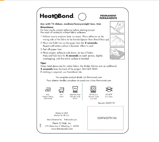 About this item Use for #5 Ribbon, Medium to Heavyweight Lace, Trim and Home Decor items - NOT intended for Hems Heat activated; Permanent; Double-sided solid film adhesive on paper liner For bonding items to fabrics without the need for pinning No Sewing needed Made in the USA