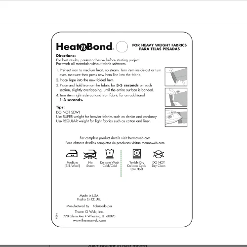 Model 00362Pre-wash all materials without fabric softeners. Pre-test adhesive on materials before starting project. Preheat iron to medium heat, no steam. Turn item inside-out or turn over. Measure & press new hem into the fabric. Place Tape inside the new folded hem. Place iron on fabric and hold with firm pressure for 8 seconds on each section, slightly overlapping, until the entire surface is bonded. Turn item right side out and iron fabric for additional 3 seconds on each section, slightly overlapping, until the entire surface is bonded. Tips: Pre-wash all materials (without fabric softener) you will be using prior to fusing Do not touch iron directly to the Hem Tape. Do not iron directly to your ironing board. There is not a protective paper backing and the adhesive will melt to your iron or your ironing board. You must sandwich this adhesive between the two layers of fabric to be fused before applying your iron Machine wash delicate cycle warm, tumble dry low heat or no heat (and in accordance to garment / fabric washing directions). Avoid repeated or excessive ironing to the area after fusing. DO NOT DRY CLEAN