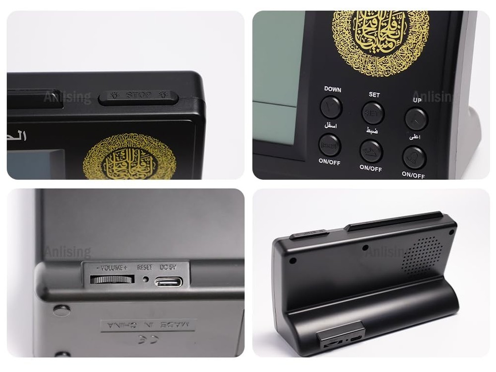 Properties: 1. Azan alarm clock can display current time, date, week. 2. Azan alarm clock can display the Muslim calendar and the Gregorian calendar. 3. Azan alarm clock display world time. 4. Azan time for major cities around the world, there are 1500 cities to choose from, and five groups of prayer times per day. 5. Makkah Prayer Background Music. 6. Any group of prayer time can be set or closed. 7. Remember Azan Time. 8. Display alliance time. 9. Alarm function (one time alarm / time alarm) and can prompt a tick alarm. 10. Snooze function, snooze time is 5 minutes. 11. Muslim Azan alarm clock can freely switch the displayed temperature, degrees Celsius, Fahrenheit. 12. DST display, 12-hour or 24-hour time display. 13. LCD function. Specifications: Material: Plastic Color: Black Display: LCD Size: Approx 5.9in x 3.9in x 2.36in Weight: 239g Power source: DC 6V 300mA 3.5 x 1.35 power supply (not included) Battery type: 2 x AA batteries (not included) Package includes: 1 x Muslim Azan Prayer Alarm Clock 1 x User Manual Note: 1. Please allow a tolerance due to manual measurement. Thank you for your understanding. 2. Monitors are not calibrated same, therefore the item color shown in the photos may be slightly different from the real item. Please take the correct one as the default. ✔Azan Alarm Table Clock: The Azan Muslim Prayer Alarm Clock to prepare time for major cities around the world, there are 1500 cities to choose from, and five groups of prayer times every day. Perfect for home and office. Also makes a great gift for family and friends. ✔LCD Display: LCD function. Islamic Azan alarm clock of the full screen light helps in the dark and shows the current time, date, week and world time, Alliance time, Muslim calendar and Gregorian calendar. ✔DST and Temperature Display: Muslim Azan alarm clock can freely switch the displayed temperature, degrees Celsius, Fahrenheit. Display DST, 12-hour or 24-hour time display. ✔Muslim Prayer Dedicated: Azan prayer alarm clock can display Muslim calendar and Gregorian calendar, remember azan time, display alliance time and have Makkah prayer background music. ✔Advanced Azan alarm clock with preset times for most cities in the world, have Hijri and Gregorian calendars. The volume can be controlled with a selector switch or it can beep 3 times instead of azan. You get a prayer alarm clock and a user manual.