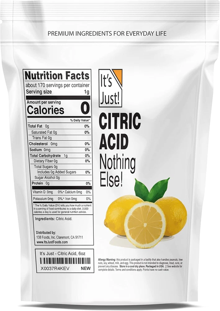 One Ingredient: Sour taste, fine crystal, granular texture; Food grade and Non-GMO, product of Thailand. Premium, high quality stand-up pouch with resealable zipper for maximum shelf life; No junk, no fillers, no preservatives - Nothing else! Kitchen Essential: Flavor enhancer; Use for homemade candies and jams or to dehydrate foods, canning, home-brewing, baking breads or making cheeses; Natural food preservative and core element of balanced taste and flavors along with salty, sweet, bitter, and umami Eco-Friendly Cleaning: Effective homemade cleaner that removes rust, lime, hard water stains or calcium desposits; Natural; Deodorize and clean household appliances, faucets and much more; Remove unsightly buildup easily; Environment friendly Diy Beauty & Gardening: Make bath bombs, beauty exfoliants, or detergents; Aids in minimizing fine lines, brightens skin, and helps with dark spots; Use to balance pH levels around the home or in the garden Product Description Where is the Citric Acid from? The ingredient is sourced from USA-based suppliers and packaged in the USA. The citric acid is from Thailand and 3rd party tested for safety and quality in the USA Can I use this product if I have allergies? This product is not manufactured with wheat, soy, egg, milk, peanuts, tree nuts, sesame, shellfish, or fish ingredients. Packaged in a GMP compliant facility that produces other products containing one or more of these allergens. What is GMP and why should I care? Good Manufacturing Practice (GMP) ensures products are consistently produced and controlled according to strict quality standards. It emphasizes cleanliness, helping to reduce the risk of cross-contamination between batches & maintain product safety. Premium Ingredients for Everyday Life! Add to Cart Add to Cart Add to Cart Add to Cart Add to Cart Add to Cart Add to Cart Customer Reviews 4.7 out of 5 stars 5,948 4.7 out of 5 stars 3,953 4.6 out of 5 stars 14,432 4.5 out of 5 stars 1,316 3.9 out of 5 stars 4,398 4.7 out of 5 stars 5,975 4.7 out of 5 stars 1,267 Price $9.99 $ 9 . 99 $9.99 $ 9 . 99 $11.99 $ 11 . 99 $7.99 $ 7 . 99 $21.95 $ 21 . 95 $8.79 $ 8 . 79 $11.99 $ 11 . 99 Packaged in USA ✔ ✔ ✔ ✔ ✔ ✔ ✔ No Added Sugar ✔ ✔ ✔ ✔ ✔ ✔ ✔ Non-GMO ✔ ✔ ✔ ✔ ✔ ✔ ✔ GMP Compliant ✔ ✔ ✔ ✔ ✔ ✔ ✔ 3rd Party Tested ✔ ✔ ✔ ✔ ✔ ✔ ✔