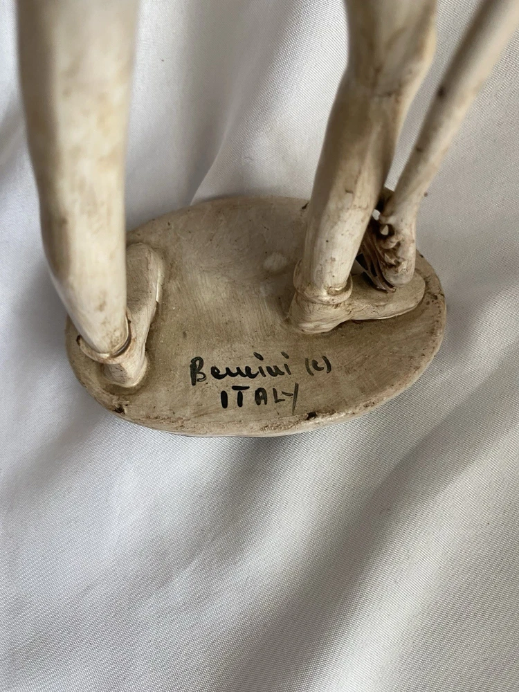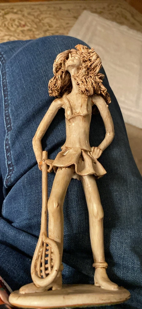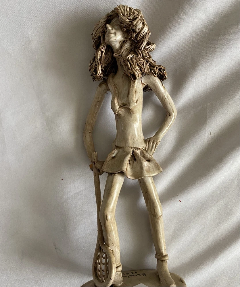 This is a unique, one-of-a-kind sculpture by Italian artist Dino Bencini. The piece features a woman playing tennis and is made of clay using pottery & sculpting techniques. It is a medium-sized, figurative art piece that was produced in the 70’s. This artist made a man playing a piano and when Barry Manilo visited Italy, he bought it and put it on his 1975 album cover, bringing this artist much popularity.
