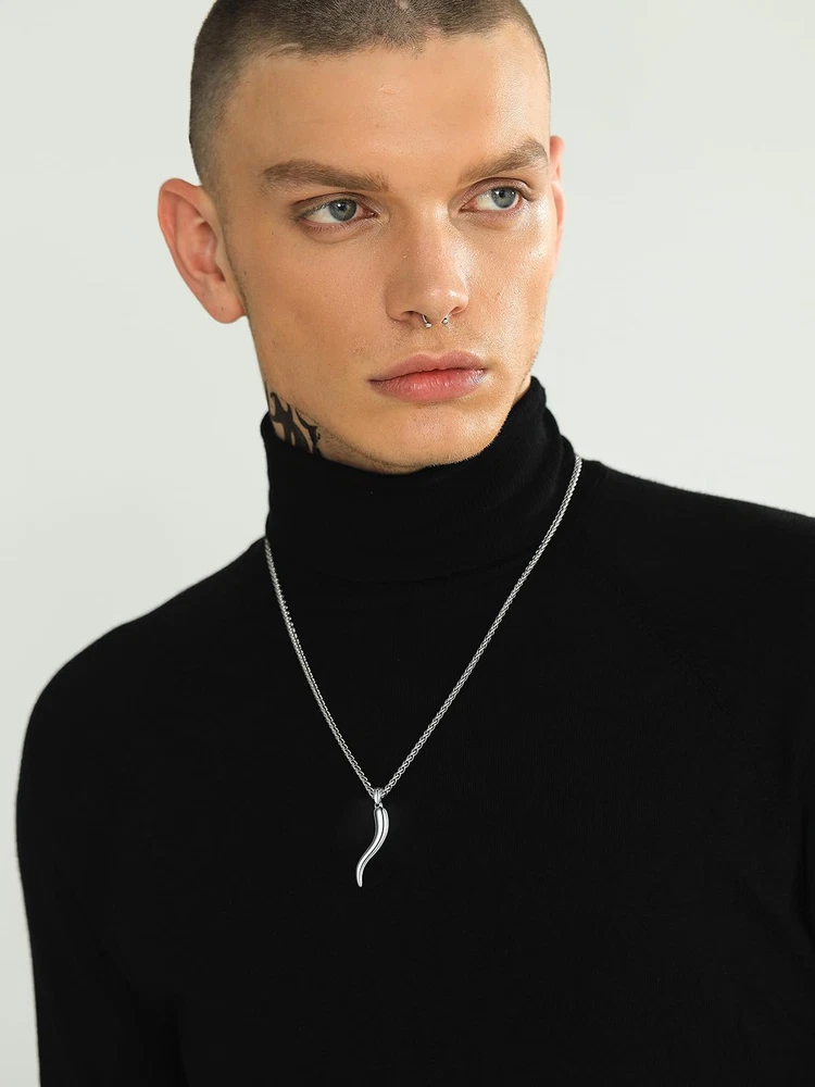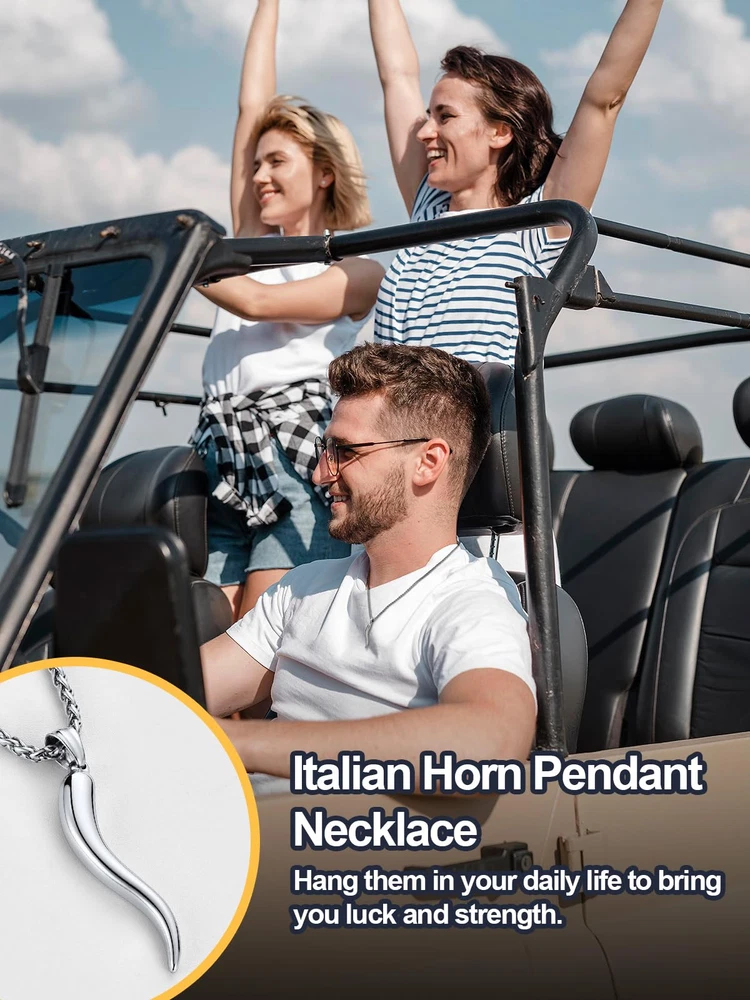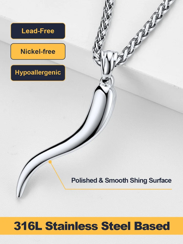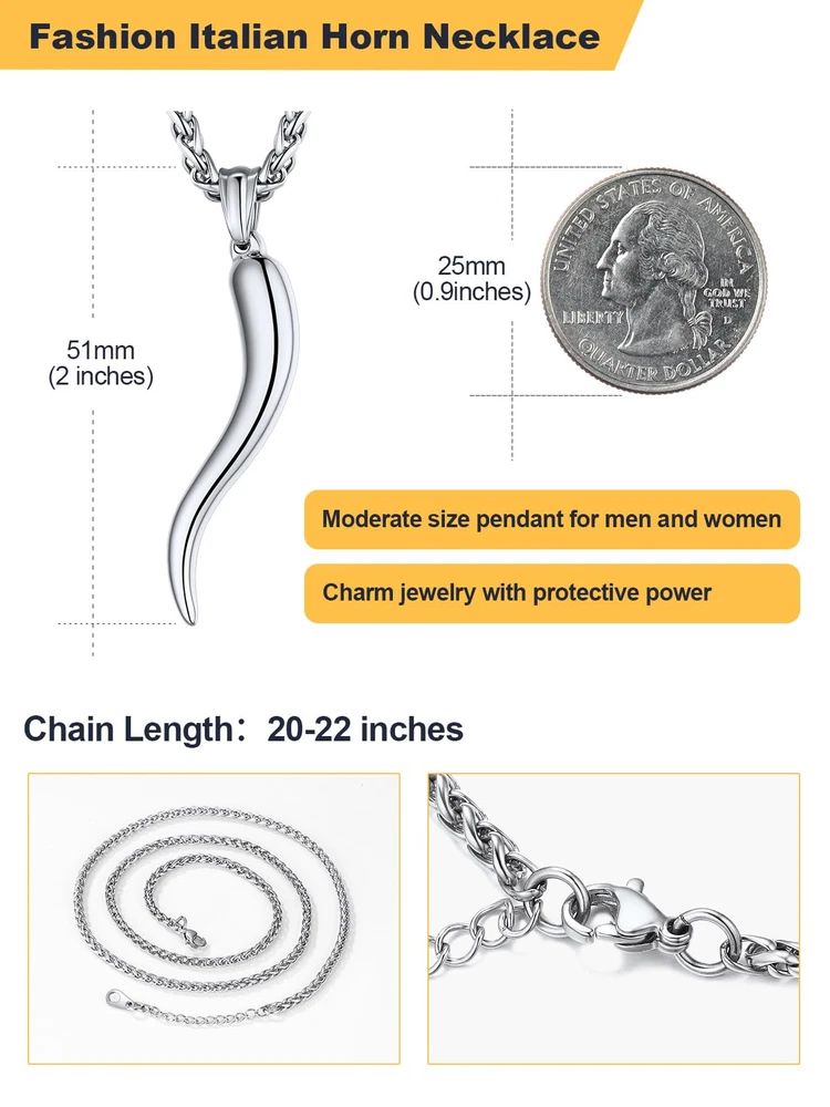 Description Amulet Cornicello Horn Necklace Lucky Italian Horn Pendant Jewelry for Men and Women. Protection charm for men women or hang on the car. An Italian horn, as an amulet and a talisman, popular among Italian and American. Ward off evil, and protect the person in question Pendant length : 2 inches, chain length : 22"+2 inches extender. Material - 316L Stainless Steel made, polished finish, hypoallergenic and nickel free. Inspirational present to mom, lover, friend, family to honor them and protection them from bad luck, or give it to yourself, hang it on your car. Necklace comes with U7 design box and a black velvet pouch.