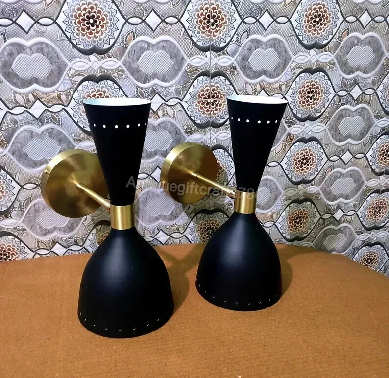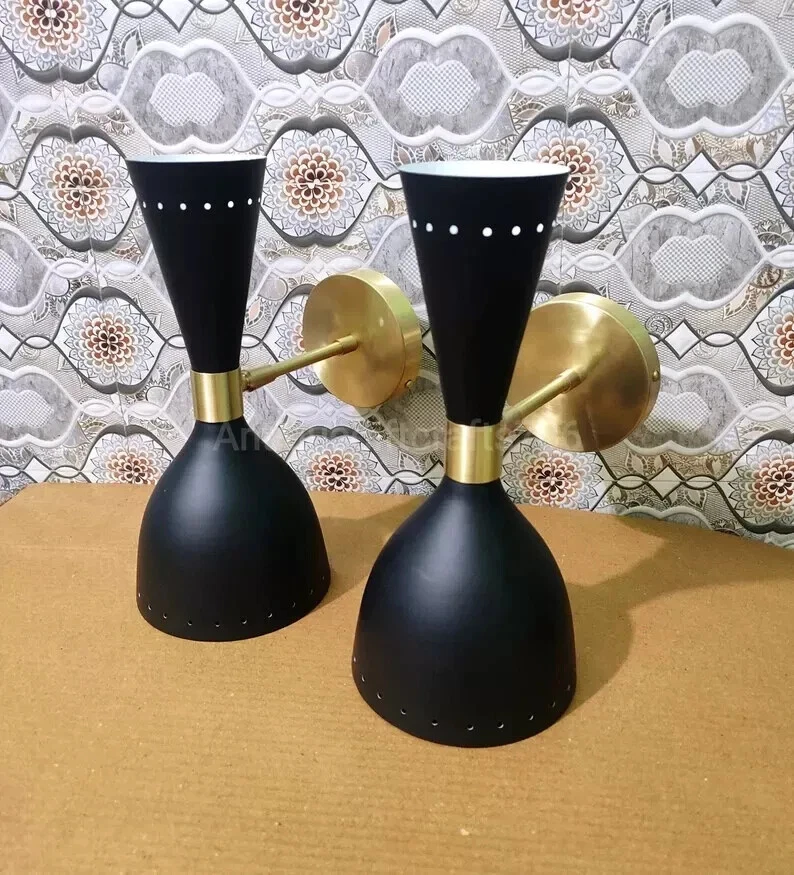 Wall Sconce Diabolo Pair of Modern Italian Wall Lights Marigold Wall Fixture Light . This is Stilnovo Style light fixture is made with UL approved parts. It has 1 arms/lights and measures 5" in diameter without light bulbs. It uses standard chandelabra socket light bulbs. We recommend 15W to 40W max. Light bulbs are not included. Ceiling canopy can be adjustable at different angles so you can hang this We hand craft all of our light fixtures. This chandelier has been made with brass material. minor variations in finish are an inherent characteristic of such material and add to the beauty and uniqueness of the product. Product Specifications: - Premium quality mid-century Wall Fixture. - Made of pure brass brass shiny finish . other brass finishes are available at request. - Measurements is :L x 10.5 inch B x 5'' inch H x 8'' inch Ceiling Wall canopy To Light Socket Edge - Brushed brass - Wall Fixture used standard candelabra E-12/E-14 light bulbs. (not included) - Canopy 4''inch - Reproduction Materials: - Brass, Iron - All Components are UL approved. Bulb Type: - Requires Four (4) 15 watt bulb type A (not included) - E-12/E-14 socket Rated with 125 voltage, 75 watt max. - 7 watt to 15 watt bulbs are recommended. - Incandescent Bulbs, Energy Saying, LED Bulbs.