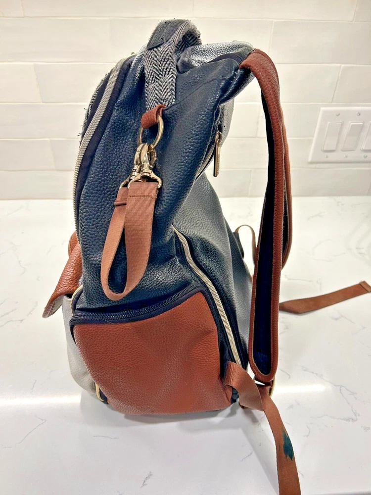 This Itzy Ritzy back pack is the perfect accessory for any parent on the go. With a stylish coffee and cream color combination, this large diaper bag is spacious enough to hold all your baby's essentials. The backpack features a zippered front pocket and two adjustable straps for a comfortable fit.Made from high-quality leather, this designer bag is durable and perfect for everyday use. The Itzy Ritzy brand is known for its stylish and functional baby accessories, and this back pack is no exception. Whether you're running errands or heading out for a day trip with your little one, this backpack is the perfect choice. Note: There is a small ink stain on the bottom of one the backpack straps. It is in the pictures above.
