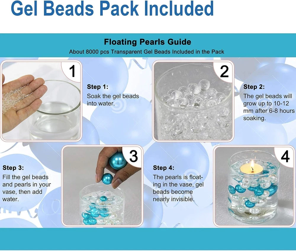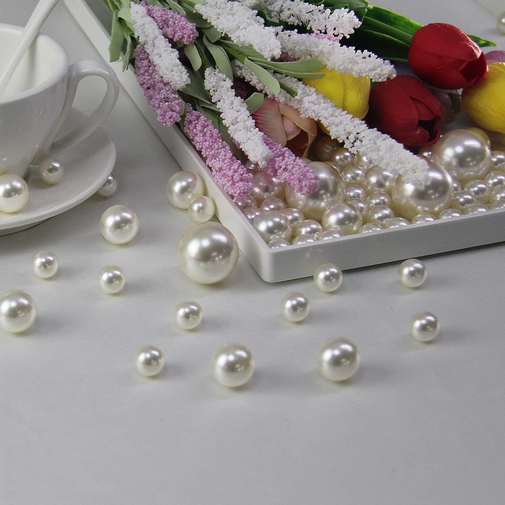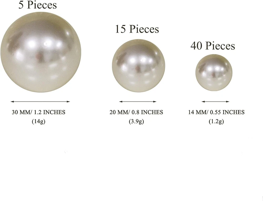 Ivory Pearl Vase Fillers - 120 pcs 14mm 20mm 30mm Assorted 0.75 LB, Product Details Color: Ivory Material: Plastic ABS Size: 14mm 20mm 30mm Assorted 0.75 LB Brand: WELMATCH Shape: Round Item Weight: 14 Grams Number of Pieces: 120 Manufacturer: Match Event Package Dimensions: 6.81 x 4.72 x 1.73 inches Item Weight: 0.494 ounces Item model number: ME01002S Batteries required: No Size: Total 120 pcs pearls and about 3200 pcs water beads in the bag, the pearls including 120 pcs which are 96 pcs 14mm pearls, 18 pcs 20mm pearls, 6 pcs 30mm pearls. Material: Plastic ABS, float effect use with Water Beads together, 3200 pcs clear water beads included in the bag. Use for: Arts & Crafts, Table scatters and vases fillers.