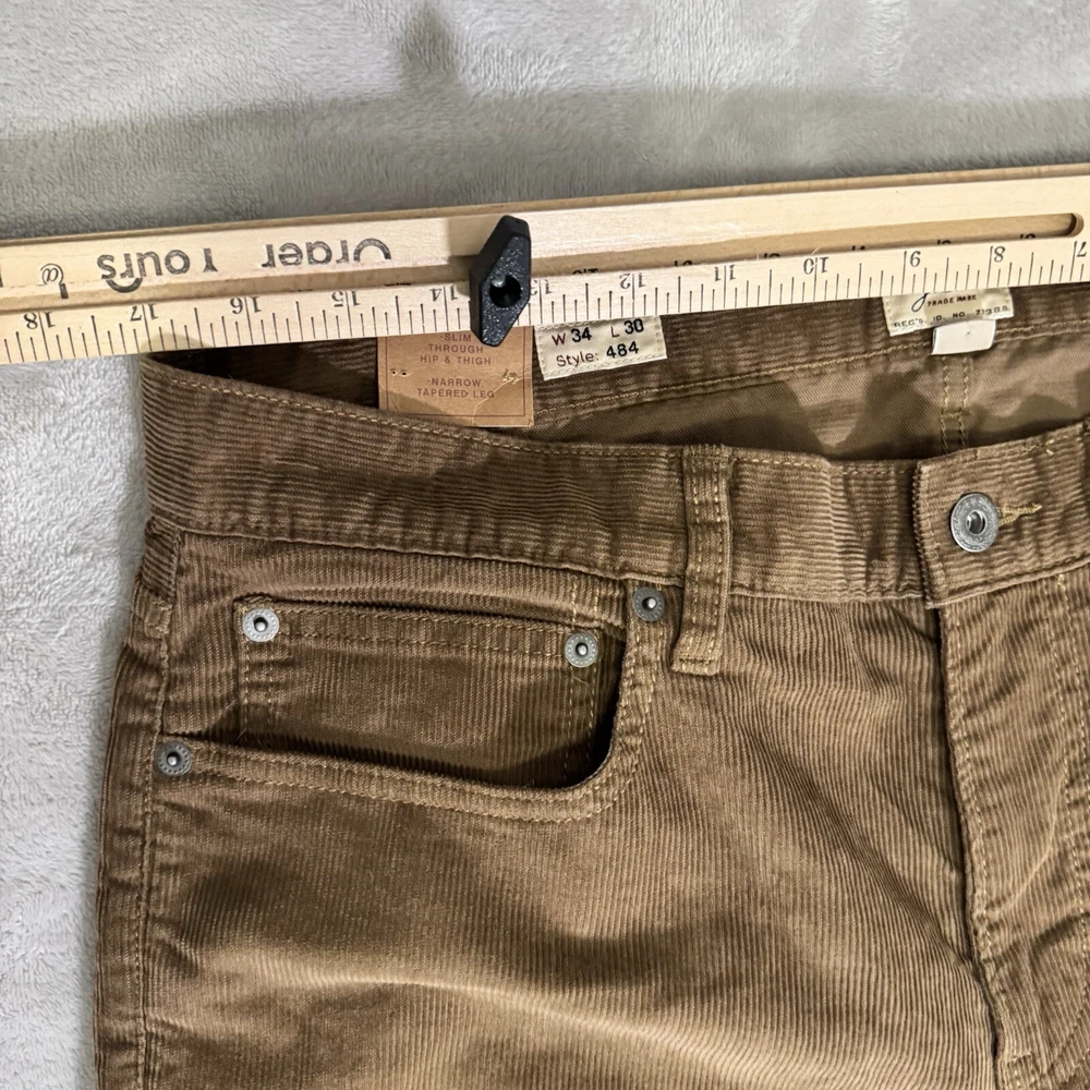 Elevate your wardrobe with these stylish J.CREW 484 corduroy pants in a rich brown color. These pants feature a slim fit design with a mid-rise waistline and a straight leg style. The 5-pocket design with button and zip closure provides ample storage space for your essentials. Crafted from a blend of spandex and cotton, these pants provide stretch and comfort, making them perfect for winter, fall, and spring seasons. The solid pattern and army, USA, and preppy themes add a touch of sophistication to your outfit. These pants are machine washable and are available in size 34 waist and 30 inseam.