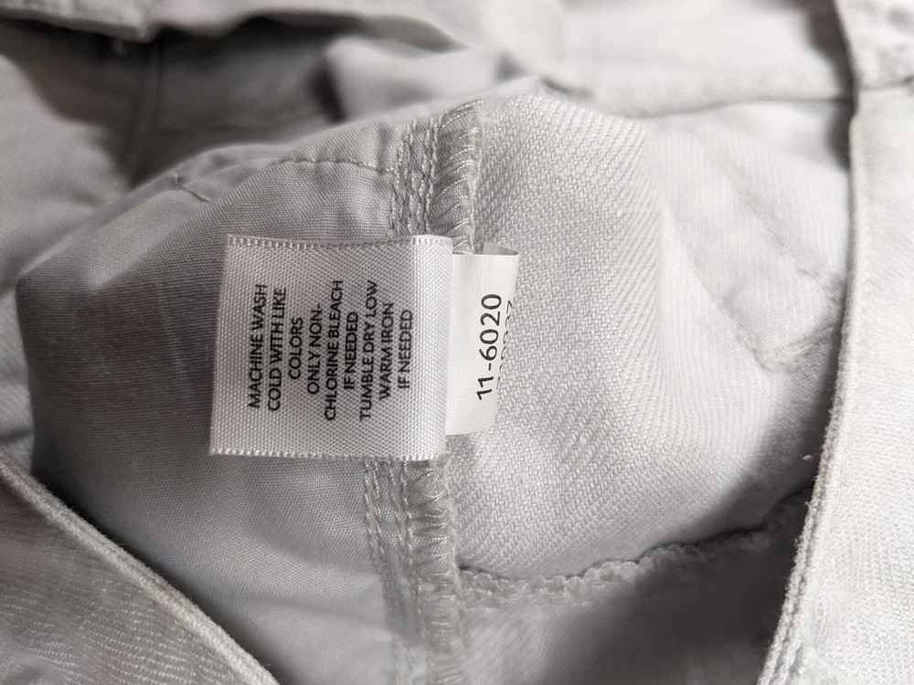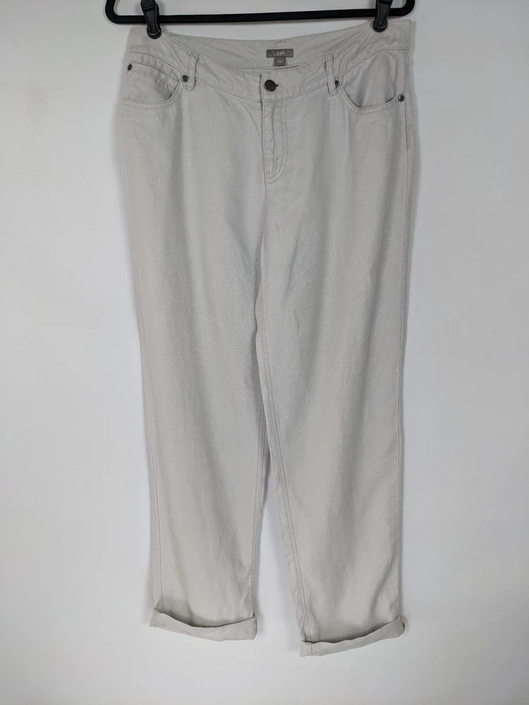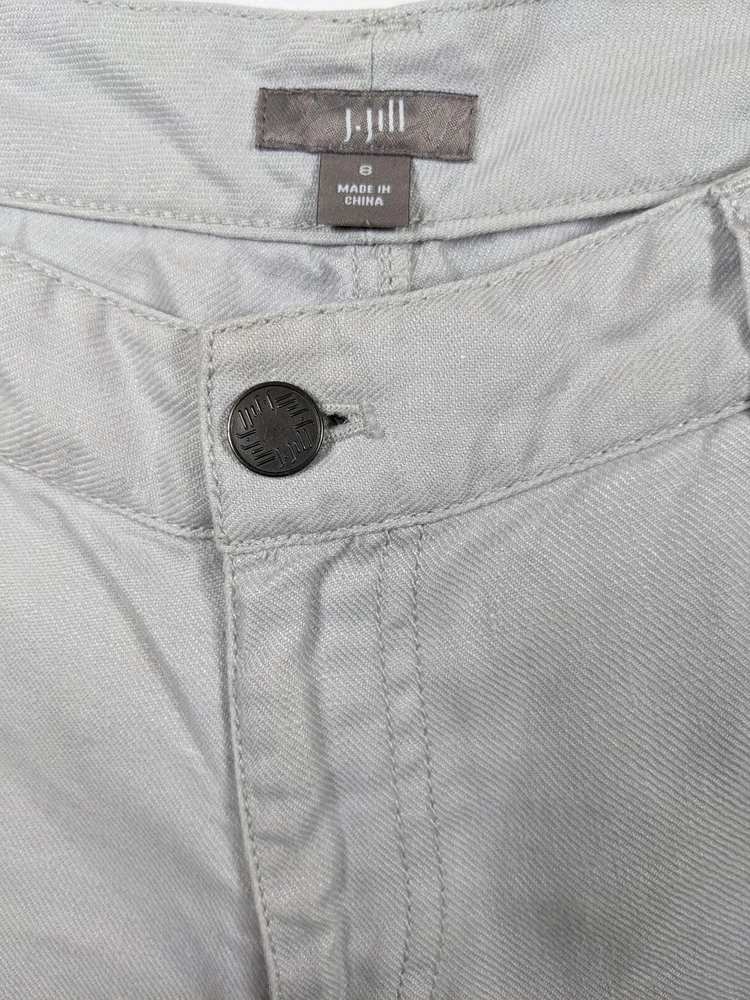 J Jill linen 5-pocket style pants in stone Flat front, button loops, 5-pocket style, slightly tapered leg Fabric Content - 100% linen Care Instructions - Machine wash, tumble dry See photos for condition Size 8 - See photos for measurements - Inseam 30", Waist 32", Rise G2