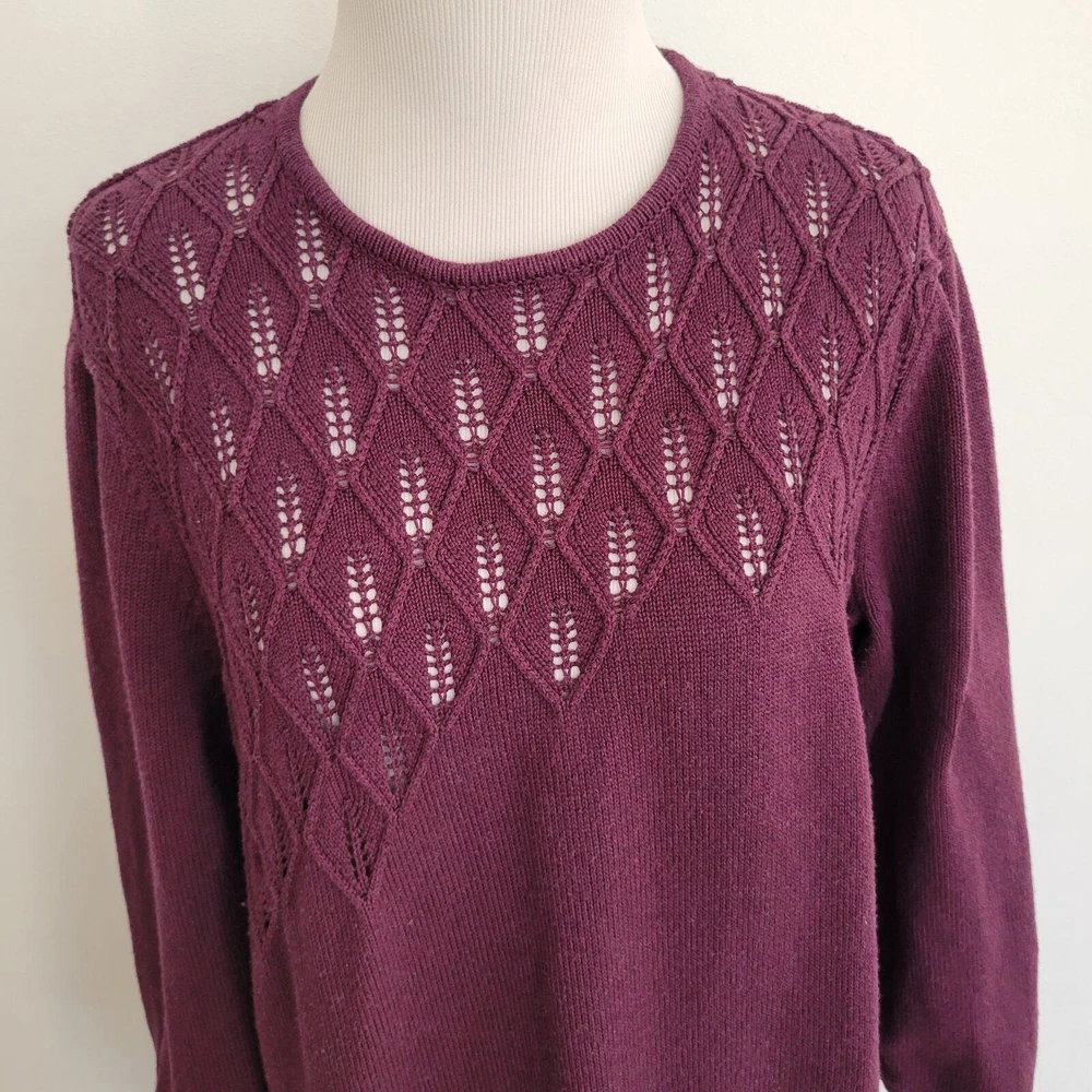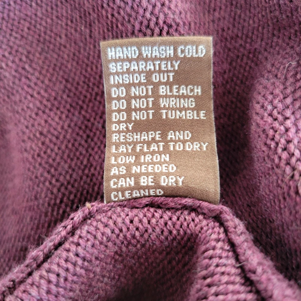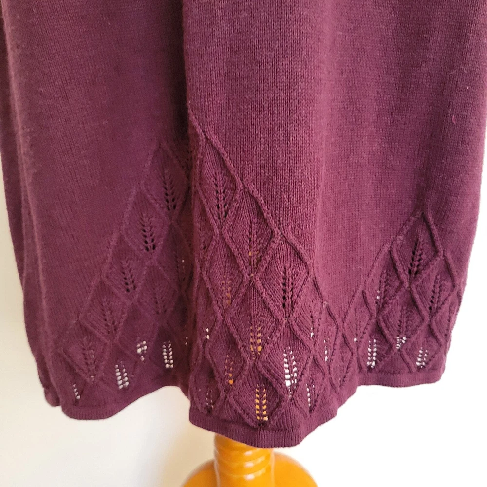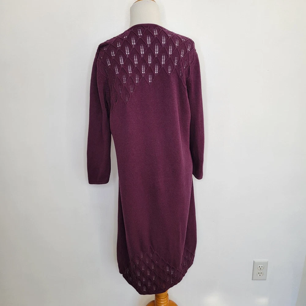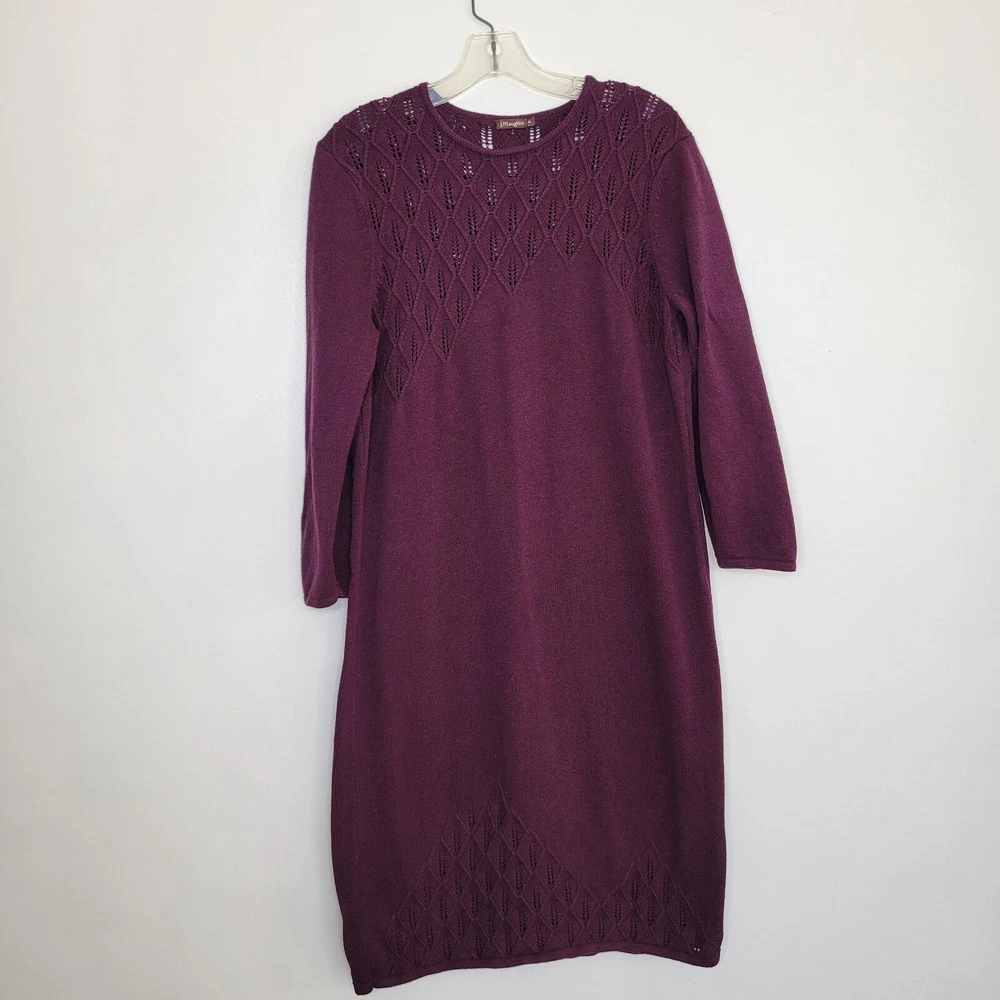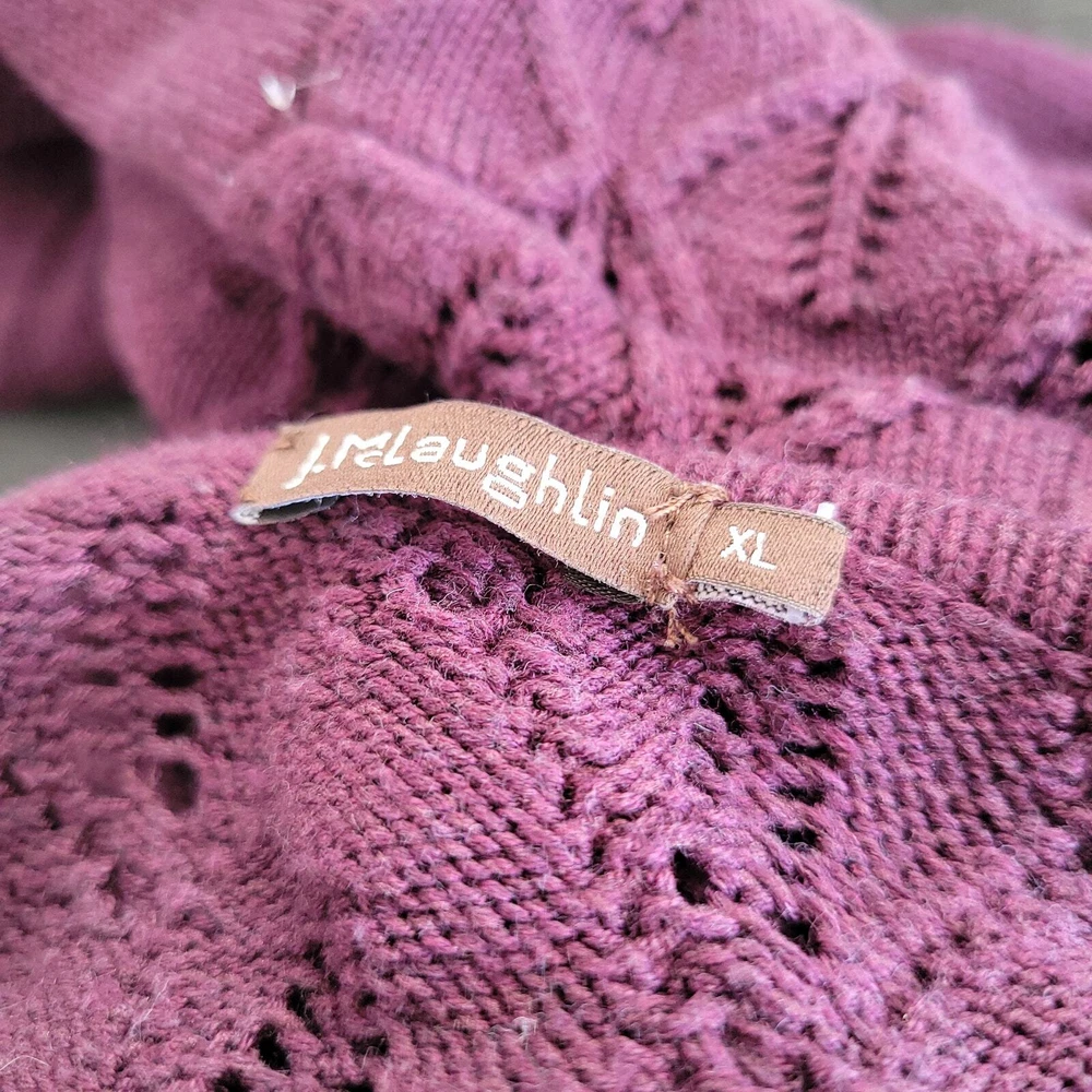 J. McLaughlin knit sweater dress Size XL extra large 54% cotton/44% modal Hand wash Pullover styling Round neck 3/4 sleeves Sangria purple Crochet detail Stretchy No pockets Unlined Approx. lay-flat measurements: Length: ~42.5" Pit to pit: ~20.5" Sleeves: ~19.5" Good pre-owned condition. There is some wash wear, esp. in underarm area, but no holes/stains