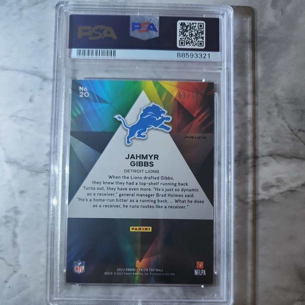 This rare and highly sought-after 2023 Prizmatic Gold sports trading card features the talented football player Jahmyr Gibbs. Limited to only 10 copies, this card is a true gem for any collector or sports enthusiast. The card has been professionally graded by the reputable Professional Sports Authenticator (PSA) and boasts a grade of 9. The card is perfect for fans of Jahmyr Gibbs and football in general. It's a great addition to any sports trading card collection and is sure to impress. Don't miss out on the opportunity to own this rare and valuable card.
