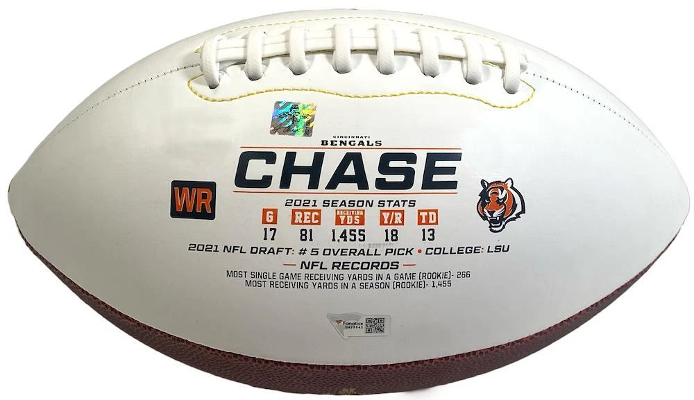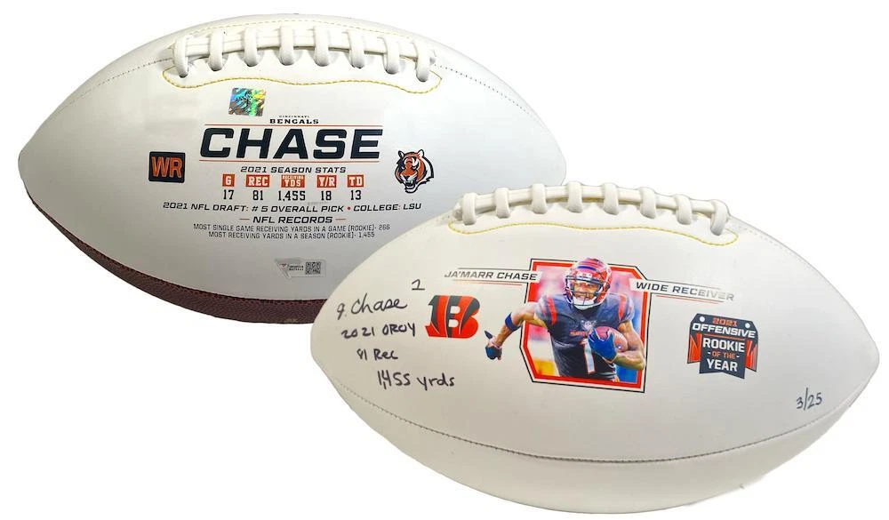 Powered by Frooition See what's NEW! Visit our eBay Store Read more About Us Need help? Contact Us Can't choose? View All Products Fanatics Authenticated Beckett Authenticated Upper Deck Authenticated Steiner Sports Authenticated Panini Authenticated Game Day Legends Authenticated JSA Authenticated TriStar Authenticated MLB Authenticated PSA/DNA Other JA'MARR CHASE Autographed "2021 OROY" Stat White Panel Football FANATICS LE 25 JA'MARR CHASE Autographed "2021 OROY" Stat White Panel Football FANATICS LE 25 Item Description This Bengals Rookie of the Year Commemorative white panel football has been personally hand-signed by Ja'Marr Chase with the added inscriptions: - 2021 OROY - 81 Rec. - 1455 Yards It is officially licensed by the National Football League and comes with an individually numbered, tamper-evident hologram from Fanatics Authentic. To ensure authenticity, the hologram can be reviewed online. This process helps to ensure that the product purchased is authentic and eliminates any possibility of duplication or fraud. This ball is limited to 25 and you are bidding on a random number from the edition. Includes certificate of authenticity and hologram from Fanatics! This signature is guaranteed authentic through the Fanatics hologram system. Officially Licensed MONEY BACK GUARANTEE! If for any reason you are not completely satisfied with the quality or authenticity of your purchase, we will gladly give you a full refund or exchange, whichever you prefer up to 30 days after purchase. Please feel free to e-mail us with any questions. Thank you. Authenticator Pre-Certified Authenticator : Fanatics Authenticated History of item : Ja'Marr Chase has signed this item in the presence of a representative from Fanatics. Describe how you came to possess this item : Game Day Legends is a fully authorized dealer for Fanatics Authenticated About Us About Us Guarantee Shipping Customer Support Returns About Us Game Day Legends is your online source for signed sports memorabilia from Michael Jordan, LeBron James, Peyton Manning, Kobe Bryant and many more athletes. The Company's core focus is not only to provide the best lineup of authentic sports memorabilia available, but also to deliver a first-class customer service experience that can't be found through any other distributor. Since 2000, Game Day Legends has worked hard to establish itself as one of the most trusted and recognized companies in the sports memorabilia industry by providing sports fans with a high-quality investment and a unique piece of history to add to their priceless collections. At Game Day Legends we understand that for many, sports memorabilia is more than just a collection or a hobby, it is an investment that can be handed down from generation to generation. Our knowledgeable staff is committed to providing customers with a full-service buying experience that offers services such as: Exclusive editions from some of the most sought after athletes in the business, including Michael Jordan, LeBron James, Kobe Bryant, Tiger Woods, Derek Jeter, Wayne Gretzky, Peyton Manning, Tom Brady and much more. Unparalleled expertise in Upper Deck's line of authenticated sports memorabilia, as well as other top authenticating companies like Fanatics, TriStar, Panini Authenticated and Game Day Legends Authenticated. Guarantee Guarantee Our Guarantee is simple: Our products are from the most reputable companies in the industry carrying authentication from brands like Upper Deck Authenticated (UDA), Fanatics, TriStar, Panini and Game Day Legends Authenticated. The excellent reputation of each supplier we do business with is the reason we stand behind every item we sell. Since our inception in 2000, we've built relationships with the most reputable memorabilia companies in the business. When you buy from us, you are purchasing an authentic and truly unique piece of memorabilia. Shipping Shipping At Game Day Legends, w e can ship to virtually any address in the world. Note that there are restrictions on some products, and some products cannot be shipped to international destinations. We have contracts with all major carriers to insure the most economical shipping or the fastest shipping is available. Domestic Free Shipping on Ground Orders within the lower 48, U.S.A! We reserve the right to charge a small fee for shipping to Alaska and Hawaii . Orders ship within 1 business day unless otherwise noted. International Please refer to the Shipping and Payments tab for a full list of countries that we ship to. We are not responsible for any customs, duties, or taxes that are incurred upon delivery of item. If you have any questions regarding our Shipping Policy please contact us via the Message Center. Customer Support Customer Support At Game Day Legends, our primary goal is to provide you with the best possible customer service experience. We see excellent customer service as a way to earn a customer as opposed to earn a sale. We encourage you to reach out to us via the Message Center to voice any concerns you may have about your order. If at the end of your order process you are not completely satisfied, then neither are we. Please communicate any feedback to us directly so that we can take the appropriate steps to achieve the ultimate goal, Customer Satisfaction. Returns Returns If you would like to return your product please reference our Return Policy Page here but be aware that we require a Return Authorization # in order to accept the product in our warehouse. We will also be requiring a photo of the item you received, showing any discrepancies, as the reason for return. Please contact us via the Message Center to obtain a RA# and reference your order number. If your product is damaged we require that you notify us within 48 hours of receipt, all claims after this period are not eligible for return. If you are still unsure about our return policy one of our representatives will be able to readily assist you. Please note: All returns must b