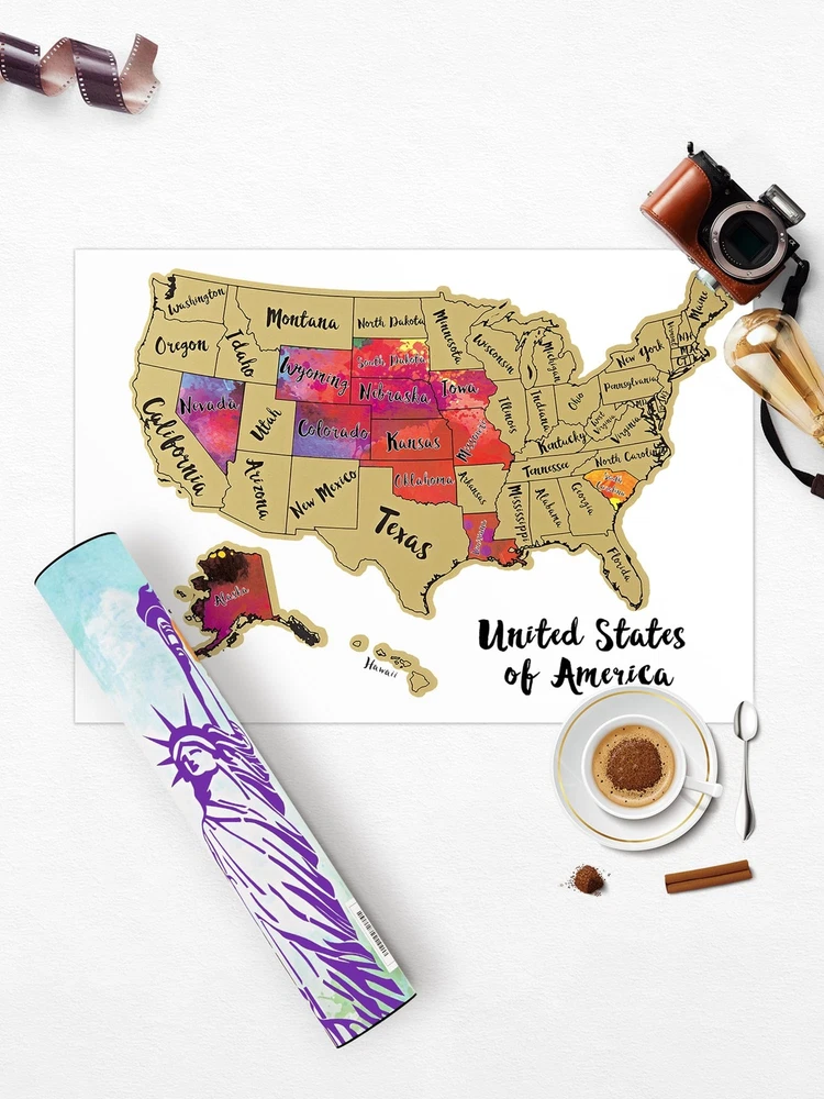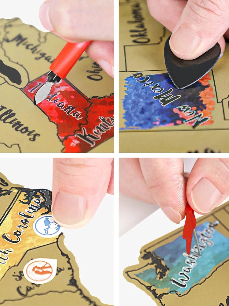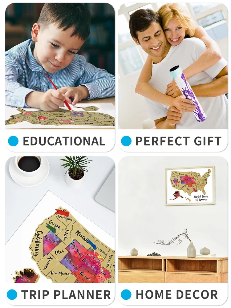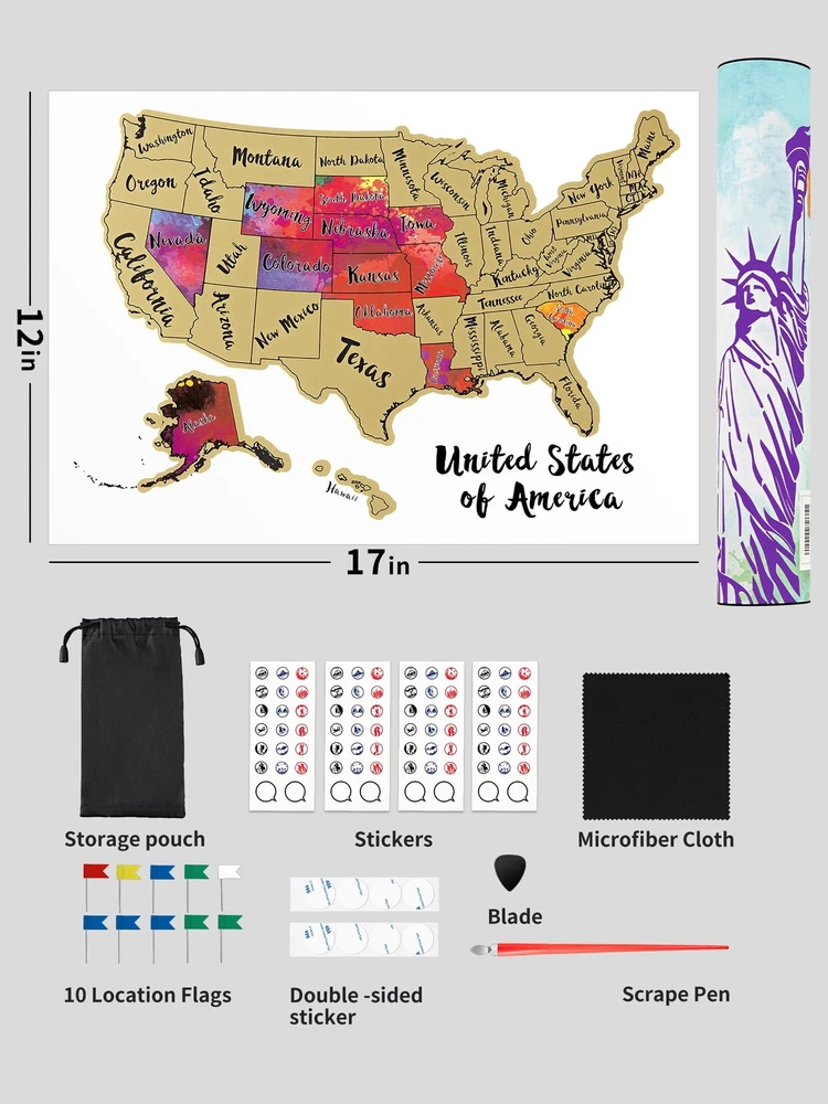 Product Description Plan new explorations with your USA Map! It is easy to scrape the gold foil and reveal a beautiful watercolor painting you have traveled. Easy to Use You could use some tools to scrape your map. Put 12X17" map in a frame (Frame Not Included) over some corkboard and use pins to mark the places where you traveled. Package Included 1 * Map 1 * Scrape Pen 10 * Pins Seller Policy 12 Months 12/24 Online Customer Service Exquisite Gift For Traveling: This is a really fun way to keep track of your travels and scrape more sections. It's a unique gift for any occasion, like a birthday, anniversary, wedding, valentines, Christmas and so on. Easy To Use: Could use multiple tools to scrape map and easily handle edges. Easy to scrape the gold foil and reveal a beautiful watercolor painting you have traveled. Record Your Travel: 12x17 inches map fits a standard US frame (Frame Not Included) and hangs on a bulletin or corkboard. You also could place flags and stickers in some cities already marked on the map! Durable & Portable: Coated with a premium foil material, our map is durable to resist accidental scrape and damage. Cylindrical packaging is convenient to carry, will not add any trouble to your journey. Product Contents: Includes 1 JARLINK scratch off USA map and 25 practical accessories, ideal for exploring and documenting your travels.