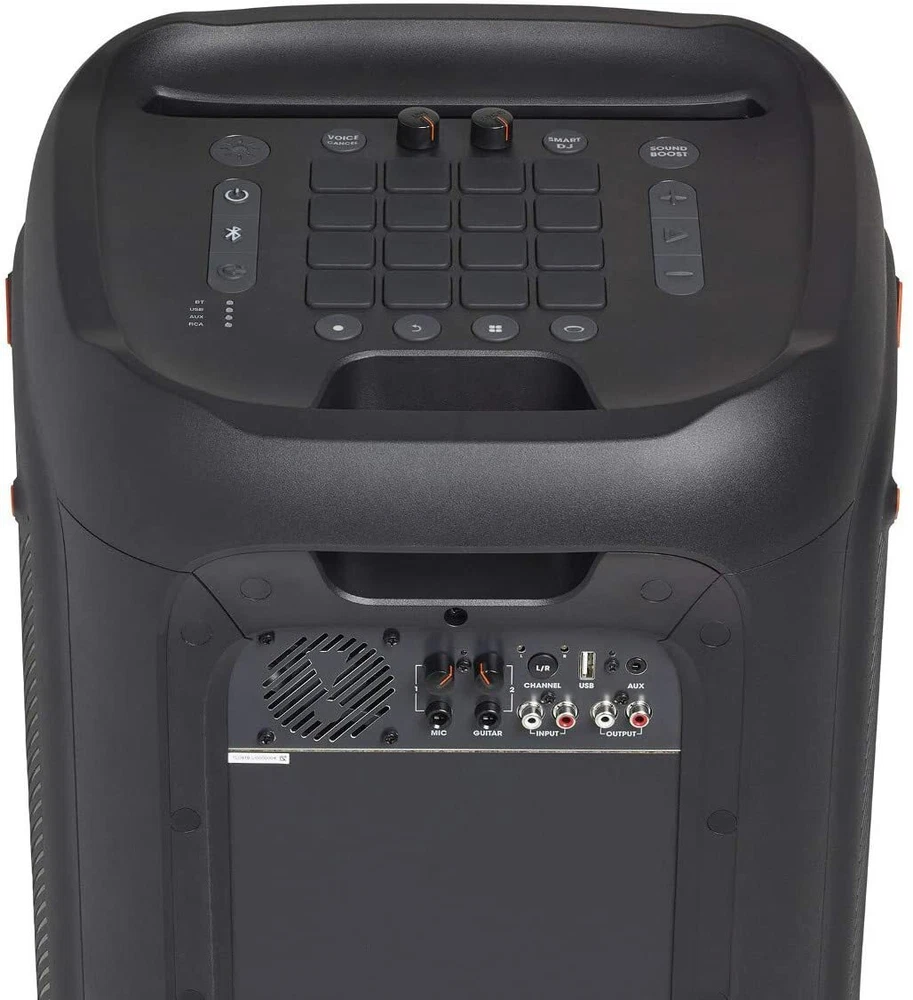 Electronic Express eBay Listing Description JBL PartyBox 1000 Portable Bluetooth Speaker with Full Panel Light Effects The JBL PartyBox 1000 is a powerful party speaker with JBL sound quality and exciting full panel light show. Just plug in your Mic or Guitar and take the stage or stream your playlist via Bluetooth or from a USB stick. The LED lit DJ and Party Band bring concert to your party! Connect two PartyBox speakers wirelessly with the TWS feature or wired from one RCA output to another RCA input. Let's get the party started! What's in the box: JBL Party Speaker Quick-Start Guide Safety Sheet AC Power Cord Air Gesture Wristband Specifications: Power Inputs: 100–240V AC Input Terminals: RCA L/R, USB port, 3.5mm Aux-in, Mic/Guitar with volume control Wireless Connectivity: Bluetooth Technology Output Terminals: RCA L/R Transducers: 1 x compression driver, 2 x 7" Mid-Range, 1 x 12" Down Firing Woofer Output Power: 1100W Frequency Response: 30Hz-20kHz (-6dB) Dimensions (WxDxH): 15.6" x 15.3" x 43.3" Weight: 76.5 lbs. Key Features: JBL Signature Sound: JBL offers unprecedented performance and an authentic audio experiences you will remember for your party! Light Shows: The full panel lighting effect creates a captivating light show to astound your crowd with a lasting visual experience. Air Gesture Wristband: Air gesture wristband brings everyone together! DJ Pad: This DJ launchpad allows you to play drums, keyboard and piano, record and loop on the fly! Mic and Guitar Inputs: Plug in your mic or guitar and take the stage. USB Playback: Pre-program your party or event with your favorite playlist from a USB thumb drive! TWS and RCA: Connect compatible speakers wirelessly via TWS (True Wireless Stereo using Bluetooth connection up to 2 party speakers) or wired via one RCA output to another. USB Charging for External Devices: A USB port on the JBL PartyBox lets you charge other USB devices right from the speaker. So you don’t need an extra charger to keep your devices powered up. Concealed Wheels: A handle and concealed wheels make it easier to transport your JBL PartyBox 1000 JBL Signature Sound JBL offers unprecedented performance and authentic audio experiences you will remember for your party! Light Shows The full panel lighting effect create a captivating light show to astound your crowd with a lasting visual experience. Air Gesture Wristband Air gesture wristband brings everyone together!