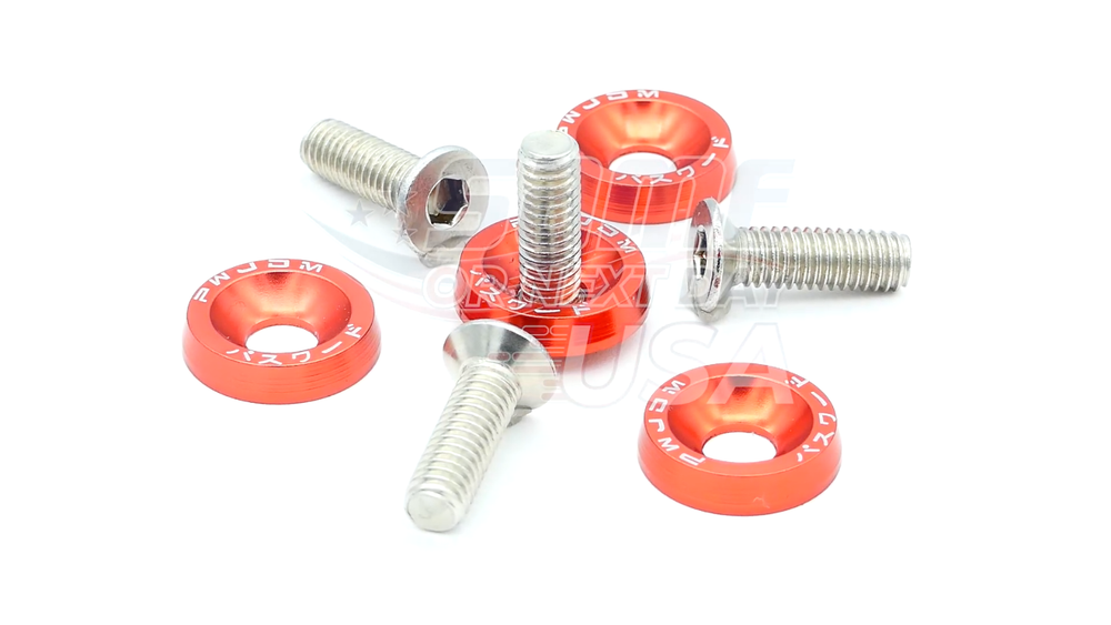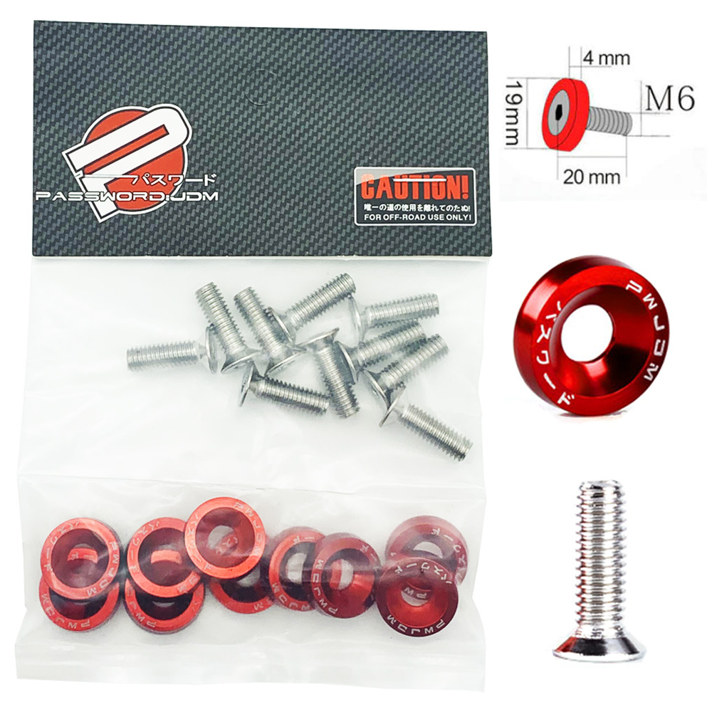 Password JDM RED ALUMINUM Fender bolts & Washers 10 PC Engine bay Dress Up Kit Our PW JDM Dress Up Kits are Compatible with ANY Japanese or European Vehicle that uses Metric Bolts. The sad truth is that factory cars were never designed to look cool when you pop the engine bay. These PW JDM dress up kits go the extra mile to spice things up and give your car a more unique, clean and customized look . A magnetic oil drain plug is the cheapest, most vital modification you can make to ANY vehicle. Using the strongest neodymium magnets available, our drain plugs remove harmful metal shavings from your oil during normal operation of your engine. This drastically reduces normal wear and tear on your pistons, valves, rods, crank and all other moving engine parts. With each oil change these metal shaving deposits can easily be removed from the magnet, ensuring your oil is impeccably clean. As a result your engine will last tens of thousands to over 100,000 miles longer, saving you thousands of dollars in maintenance over the life of your vehicle! © Copyright 2024 Same or next day USA - All rights reserved. Included: M6 x 20mm Stainless Steel Bolt Qty 10 18-20mm Aluminum Washer Qty 10 Specifications: Compatible Brands Acura, Honda, Infinity, Isuzu, Lexus, Mazda, Mitsubishi, Nissan, Suzuki, Subaru, Toyota Bolt Material Stainless Steel Washer Material Anodized Aluminum