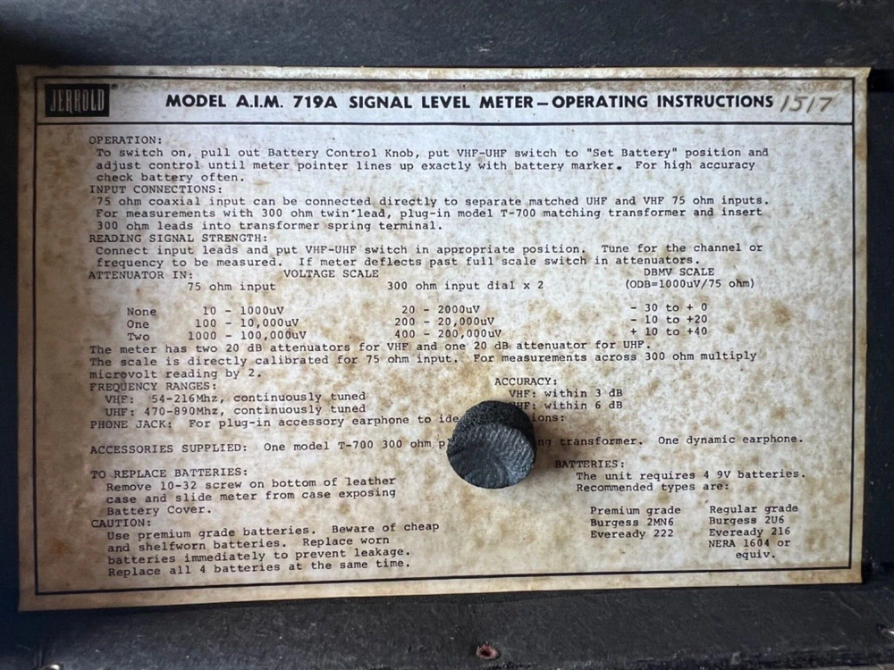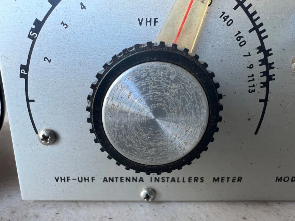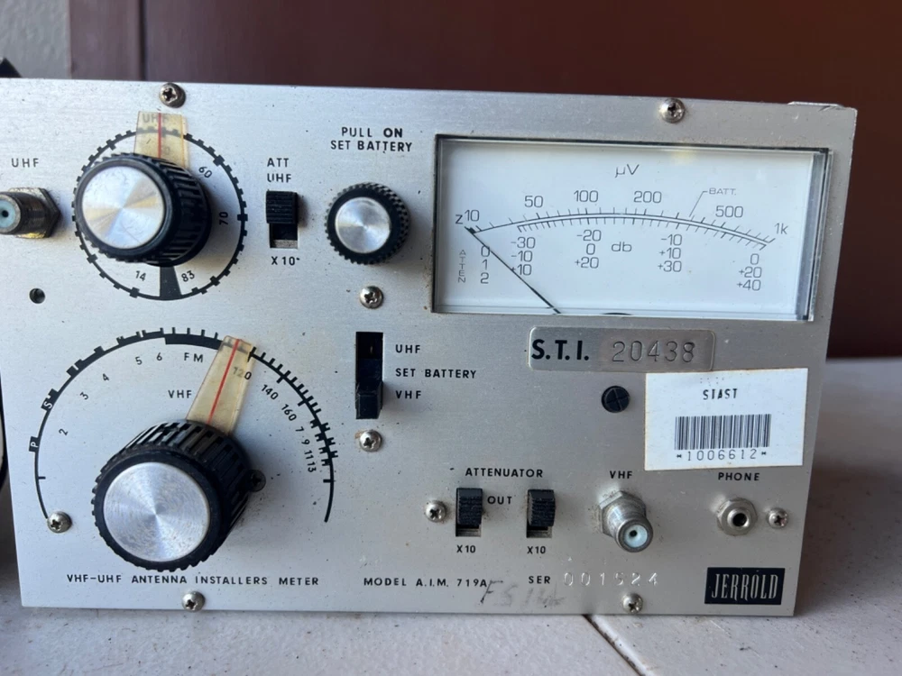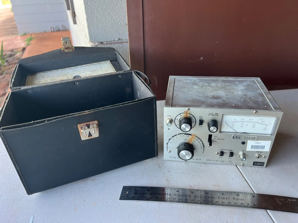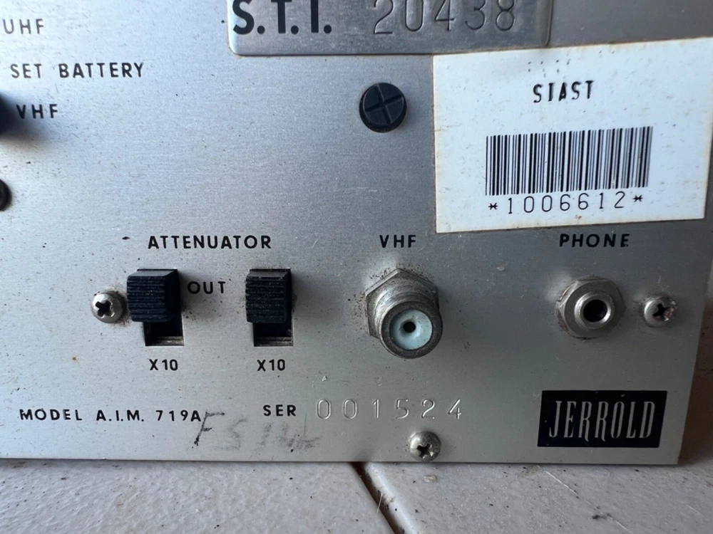 Please see the pictures for the condition of a piece of radio equipment. This is part of what was left at an old radio station belonging to an electrical engineer who was a collector and HAM Radio enthusiast and operator. There were three massive antennas here. VHF-UHF Antenna Installers Meter Model A.I.M. 719A Serial #: 001524 JERROLD S.T.I. 20438 Not tested. In a case, with info on lid. Some kind of bar code sticker. Shipping from Hawaii, USPS Flat rate med box.