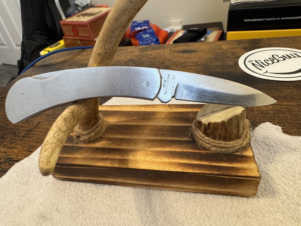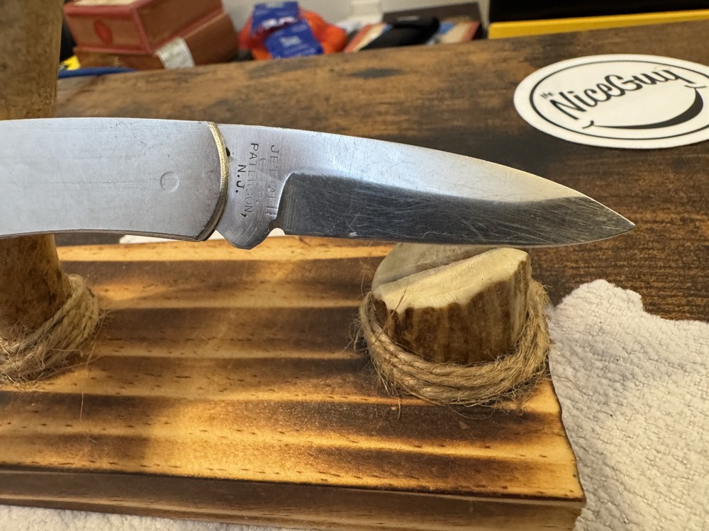 This is a vintage JET-AER Corp pocket knife, the Futura G-96 Model No. 6002, made in Japan in the 1980s. It features a stainless steel drop point blade under 2.75 inches, with a plain edge and a lockback mechanism. The handle also made of stainless steel, includes a moose inlay design. The knife is a manual opening type, ambidextrous, and has a single blade.