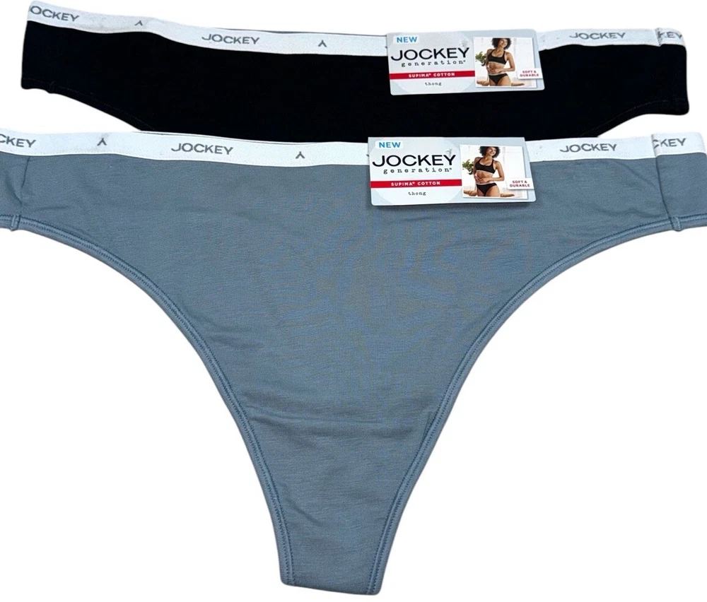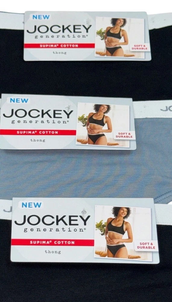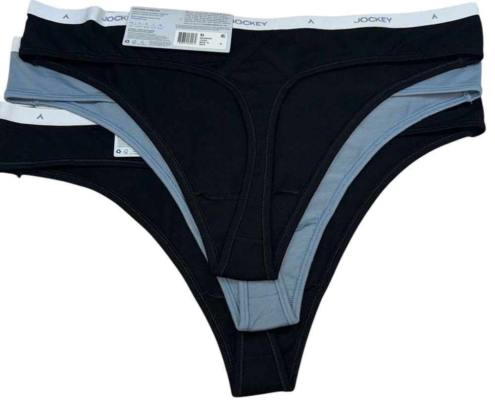 JOCKEY Women’s 3-Pair Thong Underwear Panties Supima Cotton Blend 2 Black 1 Blue Size XL New With Tags 3-Pair Women’s Size Available: X-LARGE Body: 92% Supima Cotton 8% Spandex Color : 1 Blue (044) / 2 Black (001) Style# 5406 Machine Washable Imported
