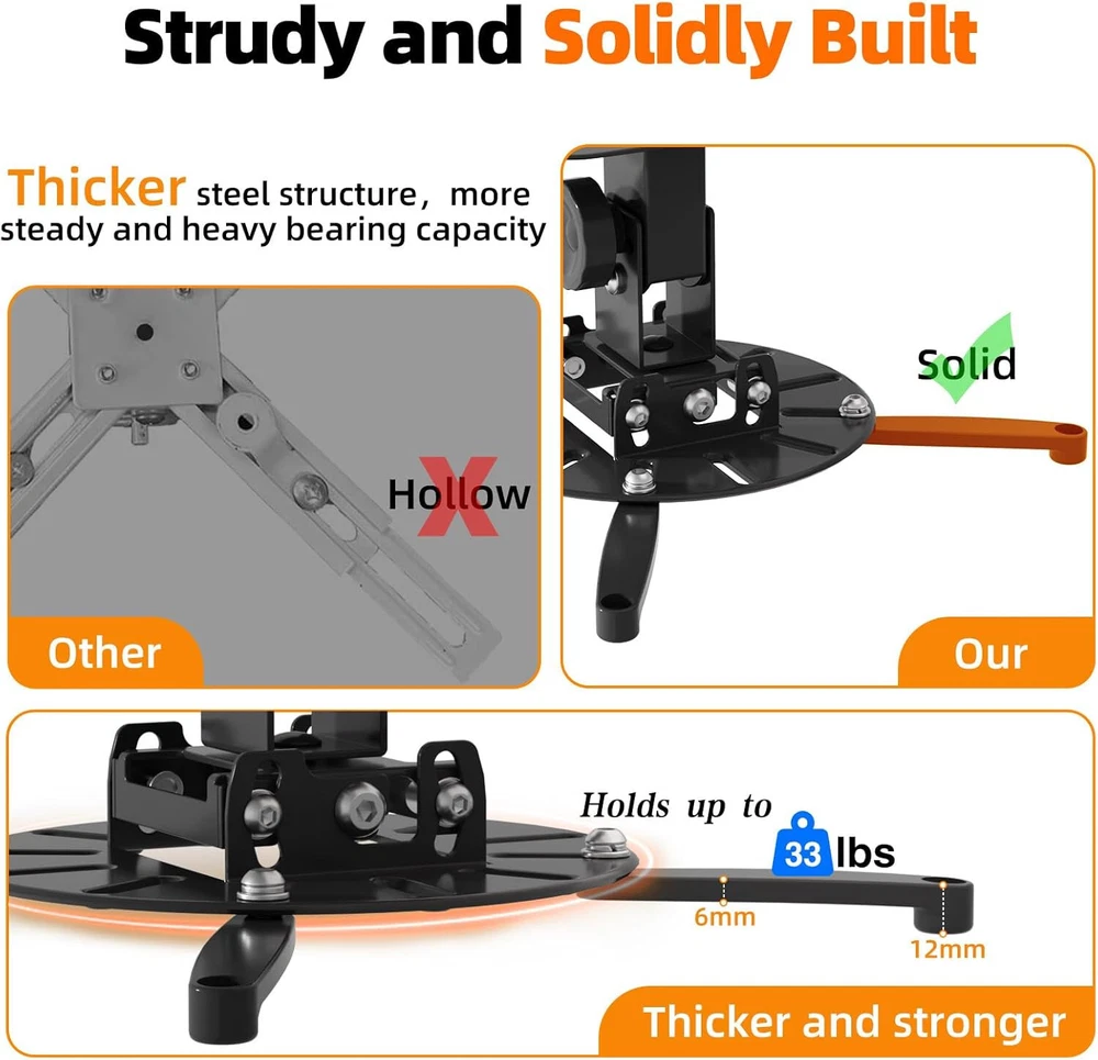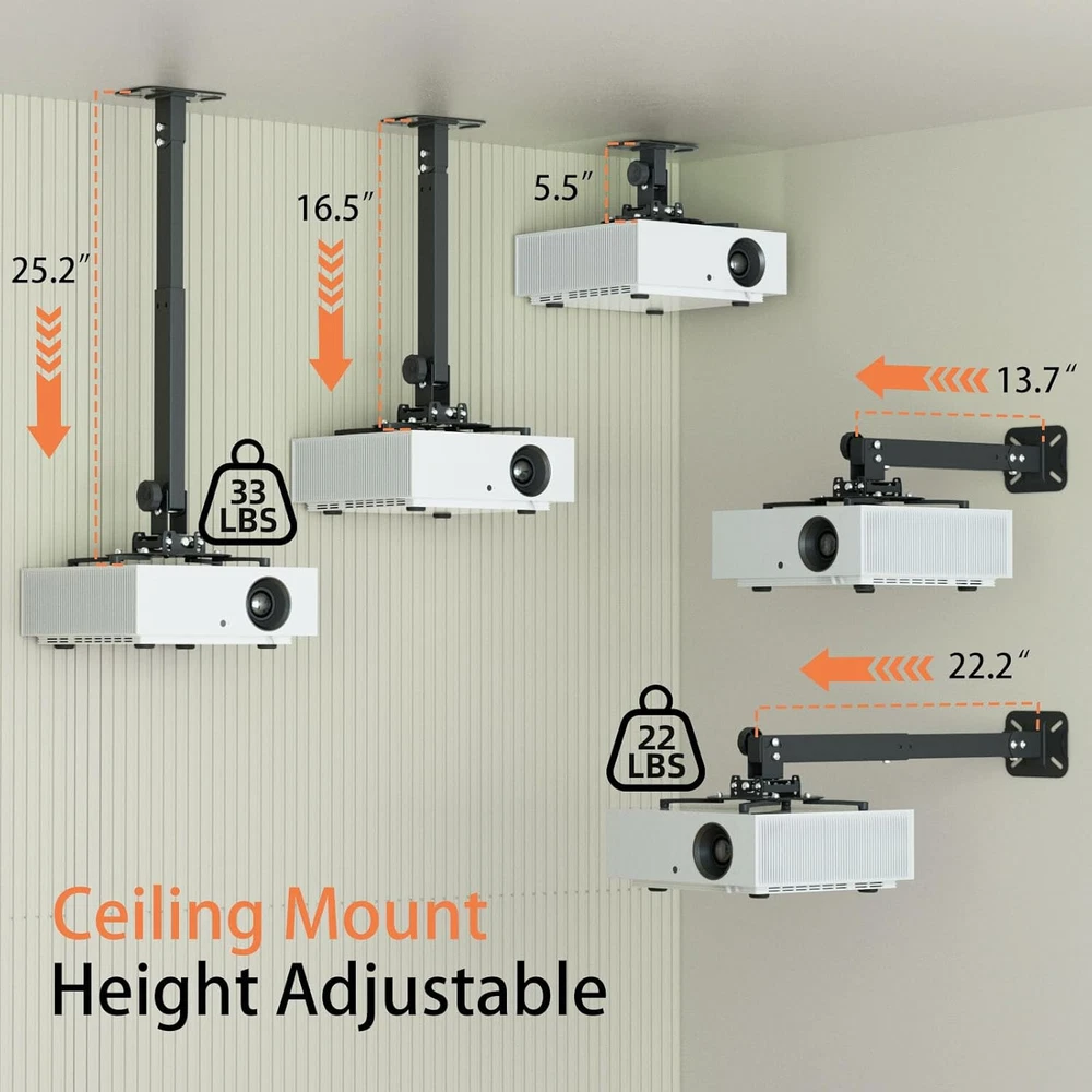 Size: long Brand JOY worker Color black Compatible Devices Projectors Mounting Type Ceiling Mount,Wall Mount Special Feature Adjustable About this item High Quality: Crafted from premium quality and heavy duty steel to provide a reliable projector mount with maximum strength and support up to 33 lbs, so your projector can be better protected and fixed 3-In-1 Projector Wall/Ceiling Mount: Three installation: 1. Flush Ceiling Installation, 2. Telescoping Arm Ceiling Installation, 3. Wall Installation Projector Wall Mount with Adjustable Length: Our projector mount could meet your different needs. The low profile projector mount is adjustable in length from 5.5 inches to 25.2 inches, and can be adjusted to any length you want Full Motion Adjustable Mount: The projector mount direction is fully adjusted with 30-degree tilt, 30-degree swivel and 360-degree rotation, hitting all the right viewing angles Universal Compatible Mounting: This projector ceiling mount supports most projector on the market with distance between the mounting holes on back 12 inches or less. This mount can be used on flat or sloped ceiling Package includes: A pre-assembled projector ceiling mount and all necessary hardware and instructions booklet. If our product is not suitable for your projector, or if you have any questions, please do not hesitate to contact us