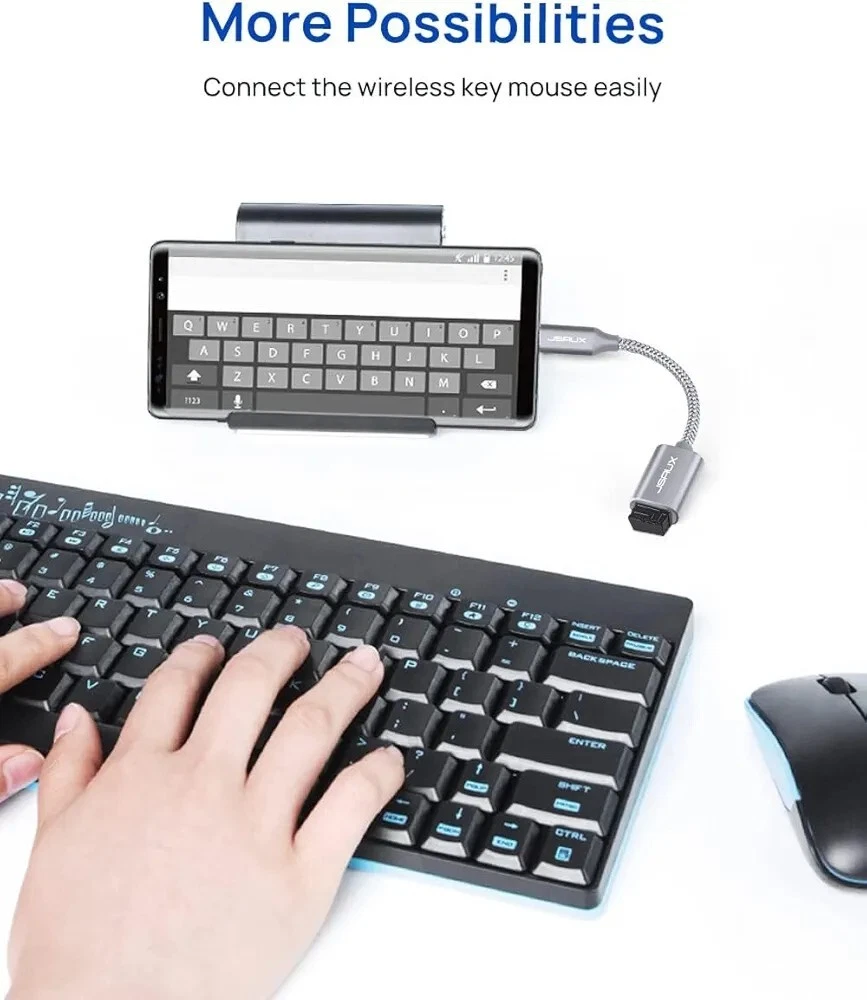 JSAUX USB C to USB Adapter 2 Pack USB Type C Male to USB 3.0 Female OTG Cable 【USB On-The-Go】: Plug in and use computer peripherals, such as flash drive, keyboard, hub, mouse, and more, makes your USB-C devices compatible with USB drives and any other USB devices that support USB On-The-Go. 【USB 3.0 Super Speed Transfer】: Full USB 3.0 super speed data transfer up to 5Gbps, 10x faster than USB 2.0. Transfer files, HD movies, and songs to your USB-C devices in seconds. 【Nylon Tangle-free Design】: Tangle-free Nylon Braided Design, this USB 3.0 Cord is far more dependable than others in its price range. Premium nylon braided cable adds additional durability and is tangle-free. 【Durable Aluminum Body】: Made out of durable aluminum alloy, innovative engineering ensures durability and a long life span. 【What you get】:Compatible with all USB C devices, Samsung Galaxy Note8 S9/S9 Plus S8/S8 Plus, Apple New Macbook Pro, LG G6 G5 V20 and More.