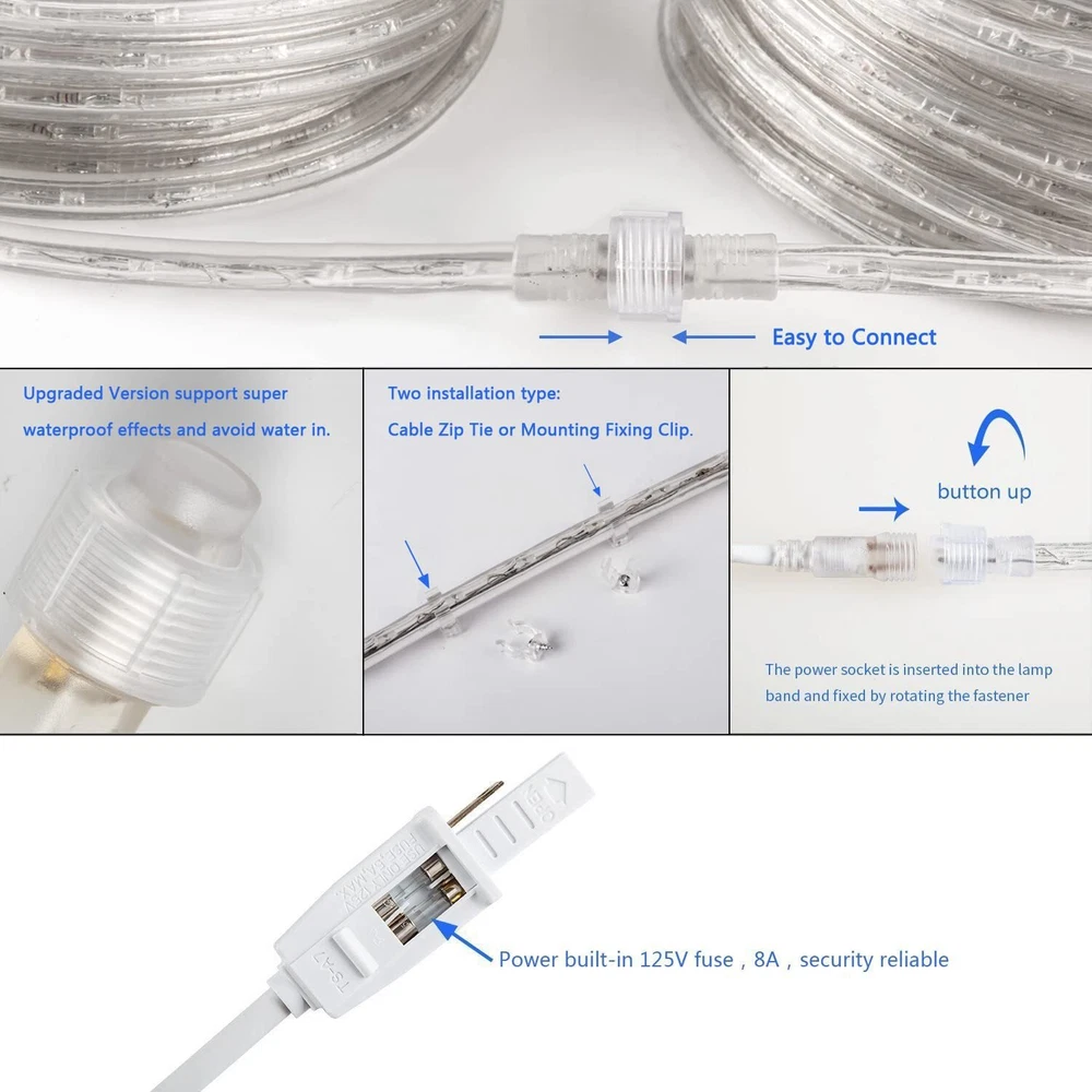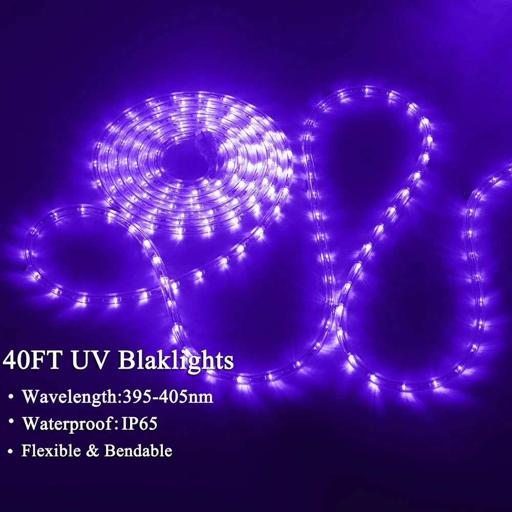 [ Notes ] It is blacklight rope lights. Why feels like a little bluish. Due to PVC material's refraction of light, the blacklights rope lights looks like bluish, but it is really blacklight in fact [ Blacklight Rope Lights Outdoor ] The IP65 grade has excellent water resistance which will live in any rainy and snowy days, especially suitable for outdoor use, such as Patio/Lawn/Eaves/Trees [ Safe to Use ] Two built-in fuses in the power plug as shortcircuit protection, more reassuring and reliable. With mounting fixing clip to firm the rope lights when you decorate anywhere you want [ Colorful Home ] Come with premium quality 432units LEDs. A colored rope light adds great ambiance to your room. With strong flexibility, you can DIY any different modeling, perfect for bands, clubs, dance, performance stage, theatrical productions, DJ light show, gym, studio, bar, churches, galleries, disco, KTV [ Connectable ] It can be extended, so you can only extend the rope lamp length of the project. For better waterproof effect, we have updated the process, and cannot cut