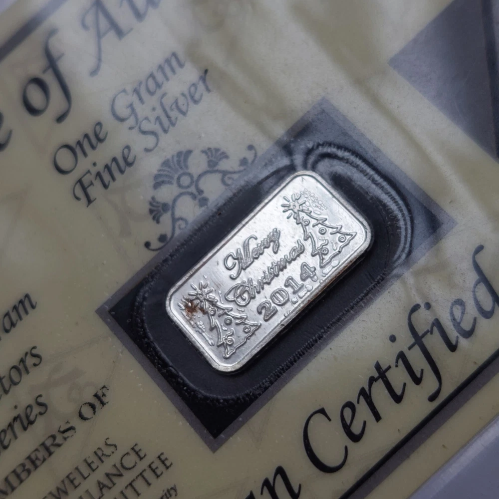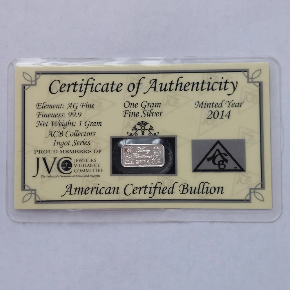 For sale: JVC 2014 Merry Christmas One Gram .999 Fine Silver Bar w/ COA Certified Bullion as pictured. -In great condition with some slight overall wear, see pictures for detail. Please note condition may vary from photo slightly. Let us know if you have any questions, thank you! :)