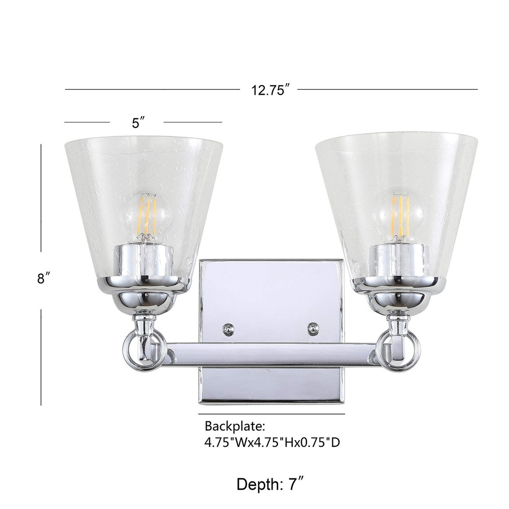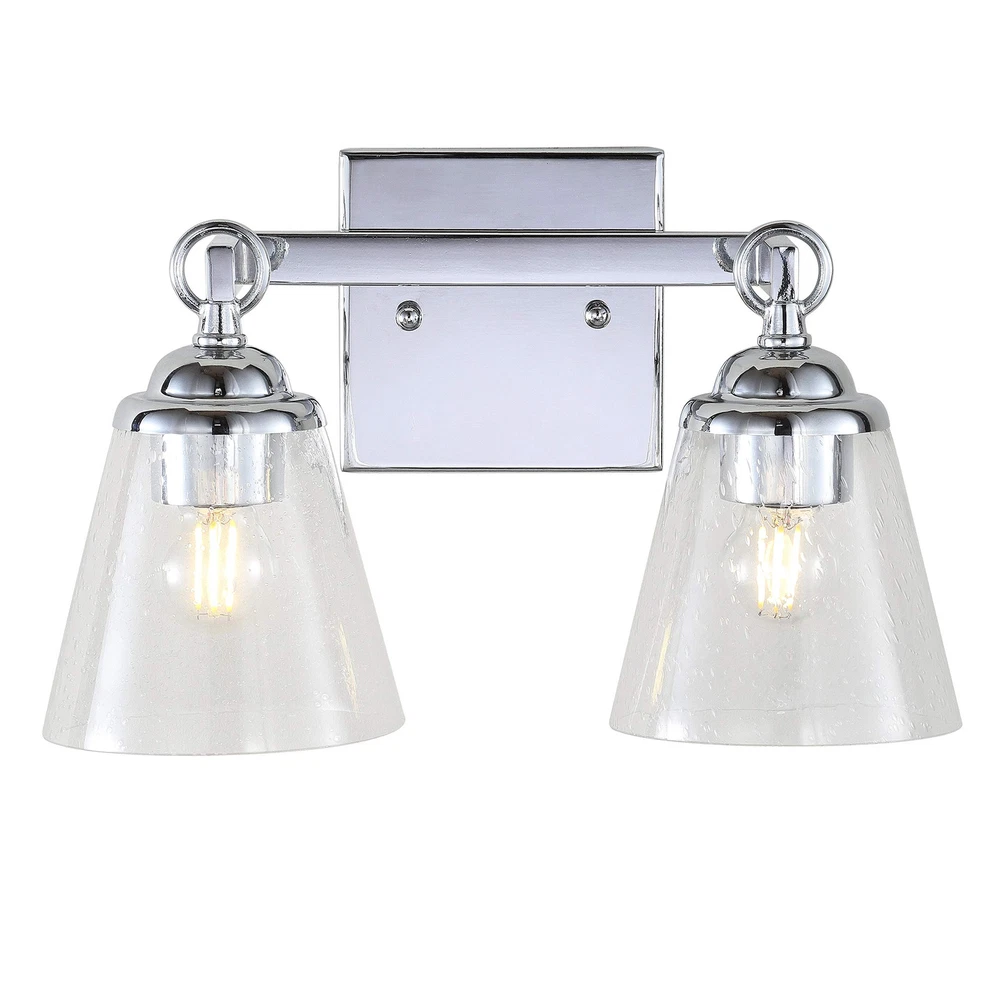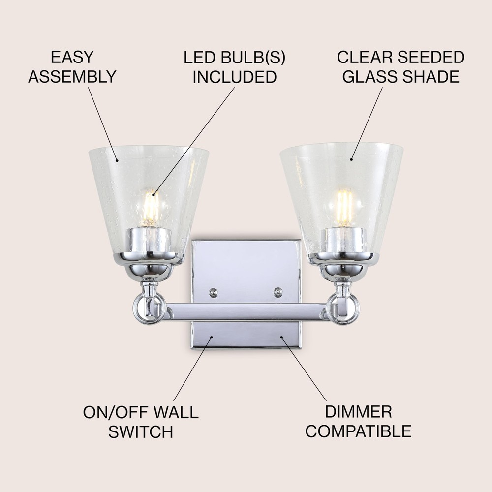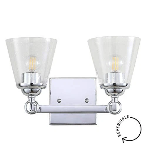 A beautiful upgrade for the vanity, this 2-light sconce delivers an elegant polished chrome frame finish. Two hurricane-style seedy glass shades offer detail and style, while allowing maximum light to illuminate your daily rituals. Also reversible, you can select to hang this light in either north-south orientation, creating versatility for any space. QUALITY CONSTRUCTION: Wall light fixtures are used as general lighting; Available in amazing variety; Replacing old, outdated wall lights is a fast and affordable way to update your home design ENERGY-SAVING LED BULBS INCLUDED: LED bulbs are included with every light fixture; All of our lighting is ETL Listed and meets 120-volt UL standards for safety and quality; Professional installation is recommended for all wall light fixtures SATISFACTION GUARANTEED: Every design is created with uncompromising attention to detail, using only the highest quality components; Based in Soho, New York, designer Jonathan and his talented team create affordable high-end home decor Featuring glass shades with tiny glass bubbles, this hurricane-style bathroom light fits any style of décor Fully reversible, you can choose to hang the sconce in either North-South orientation