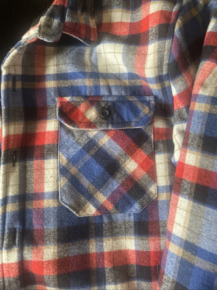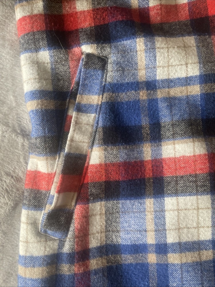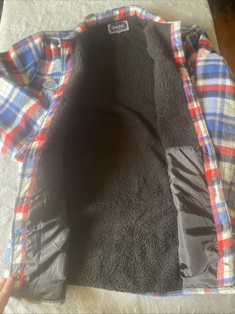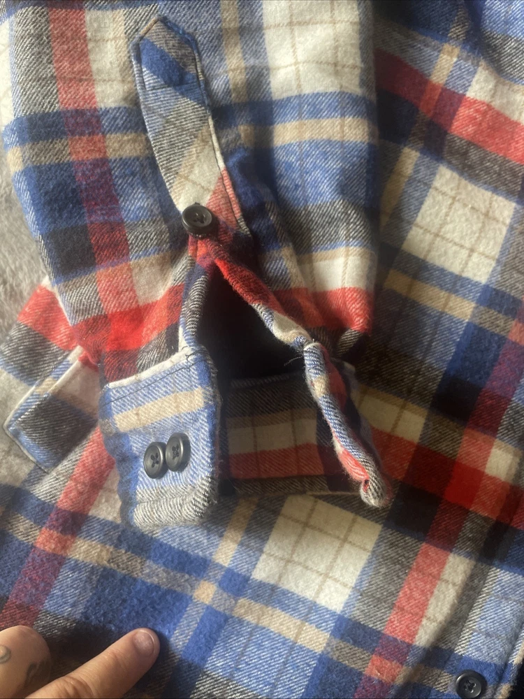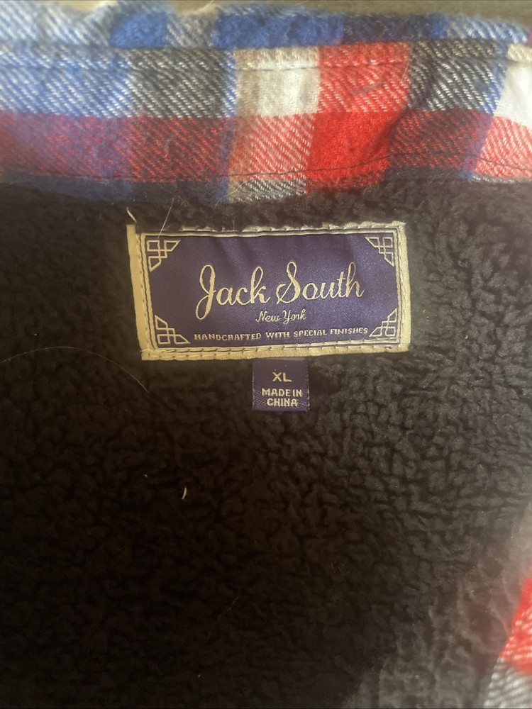 The Jack & South Men’s Lumber Jack Plaid Shirt Jacket in size XL features a classic blue, red, and cream color scheme, making it versatile for various occasions such as parties, casual outings, workwear, and business meetings. Made from a comfortable cotton-poly blend with a flannel fabric type, this mid-length jacket provides both style and warmth. With a spread collar, button closure, and regular fit, this lightweight jacket is perfect for fall, winter, and spring seasons, offering a touch of retro, hipster, or cowboy flair to your wardrobe. Made in the United States, this jacket also features pockets for added convenience.