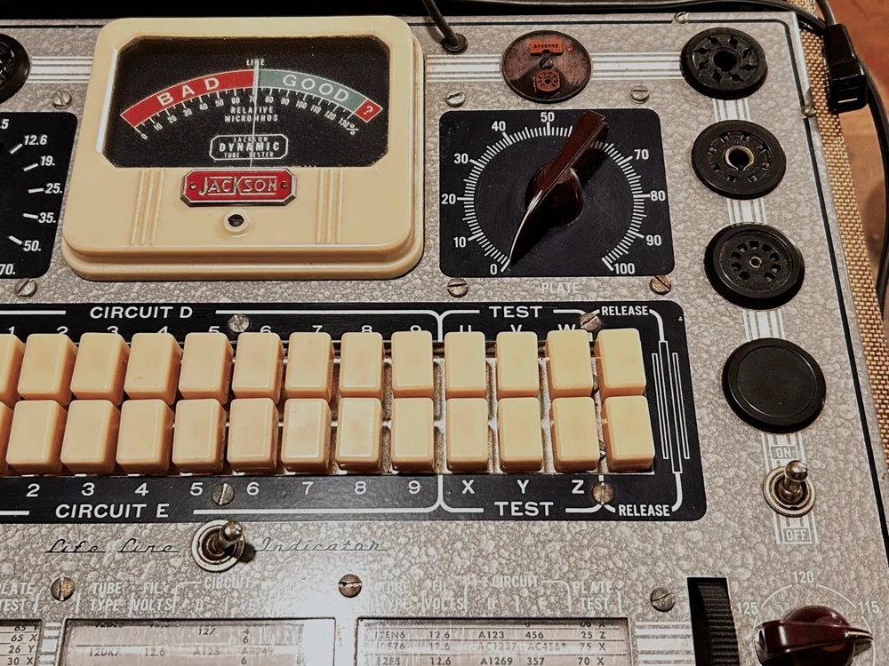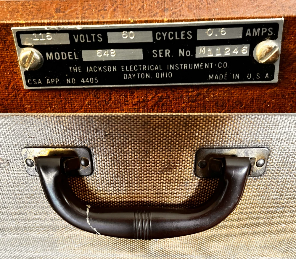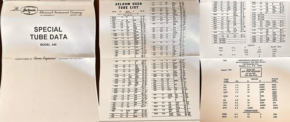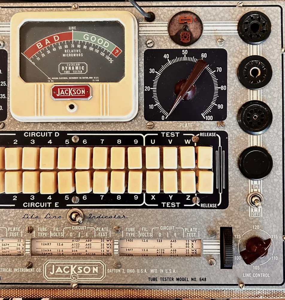 Jackson Tube Tester model 648 Used it for many years never had a problem with it. clean - scrolls smooth - push buttons and switches click into place nice - cord in good condition - wood cabinet tight - new rubber feet exterior cloth comes with scratches and gouges - glued down all the cloth edges - handle was repaired before I got it and its lasted all these years - For the most part the photos depict cosmetic condition. Need more photos? Questions? Please contact me for specifics otherwise it's considered that you have all the information needed to make your purchase determination. Thanks Much