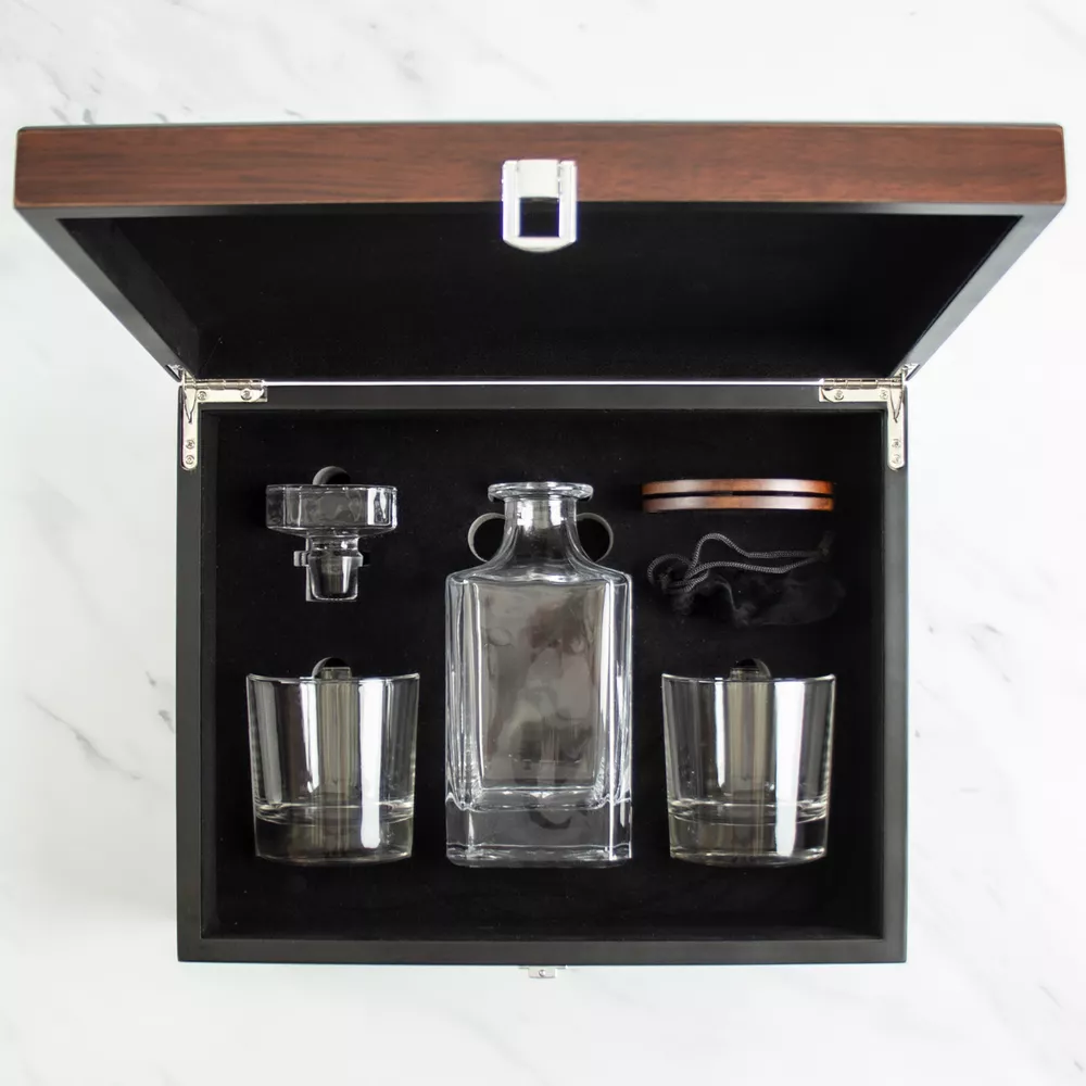 This beautifully engraved decanter set is perfect for all occasions. Made in the United States with high-quality glass, this 750 ml decanter comes with two 10oz glasses and a spill-proof lid/stopper. The set features the Jacksonville Jaguars football team and comes in a stylish wood box for easy storage.In addition to the team logo, the decanter can be personalized with your own initials, name, date, or design. Simply add your instructions in the personalization section and feel free to message us with any questions. The glasses are dishwasher safe, making clean-up a breeze. Impress your guests with this unique and practical addition to your bar tools and accessories collection.
