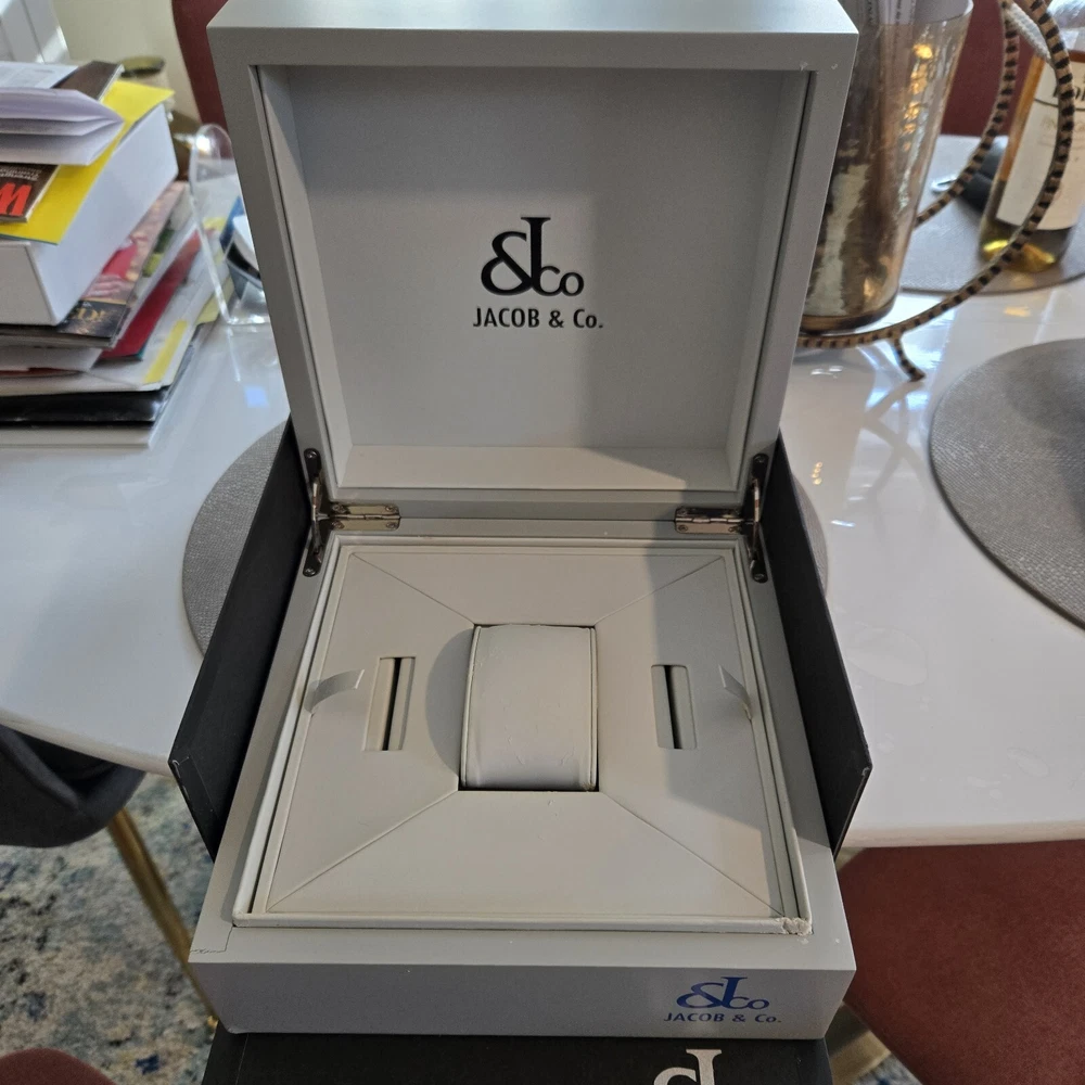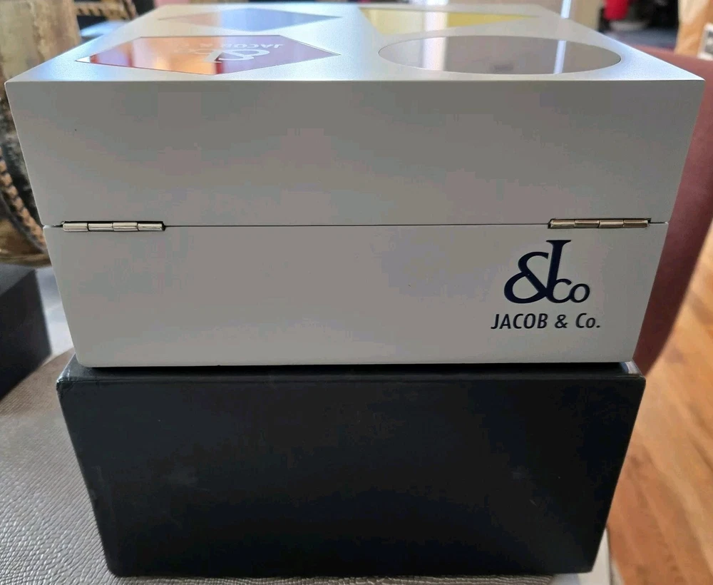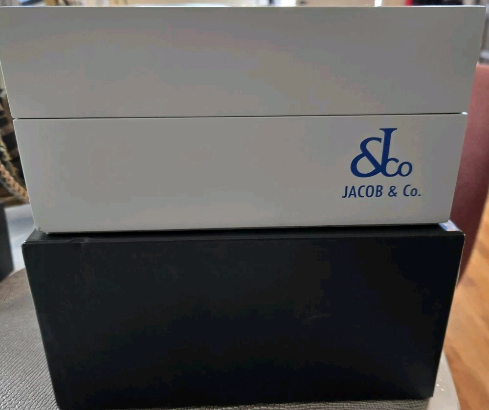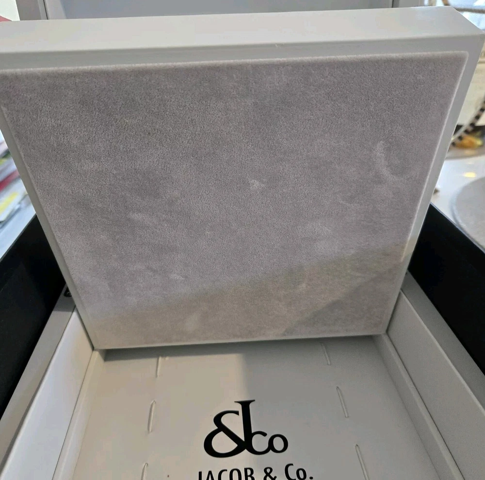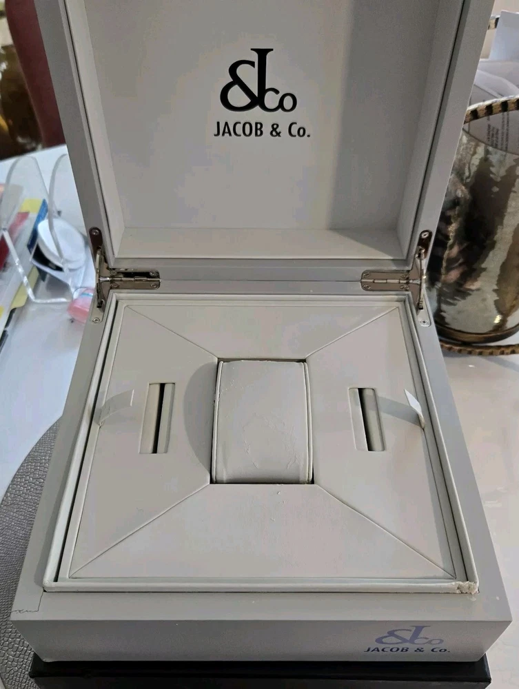 You are viewing a: ■ A RARE light gray color Jacob & Co. Wooden watch box in EXCELLENT CONDITION. It looks like it has a crack on the right side. It is a must-have for any luxury watch collector. The five time zones Naldi design is eye-catching and unique, making it a perfect addition to any watch collection. The box is sturdy and comes with a key, making it easy to open and store your prized timepieces. The multicolor design is perfect for those who appreciate style and elegance. ■ Jacob & Co. Gray wooden watch box, Jacob & Co. inside piece of watch box, Jacob & Co. Watch pillow and Black Jacob & Co. Outer protective box. Thank you, and please check out our other listings and auctions. Thank you.