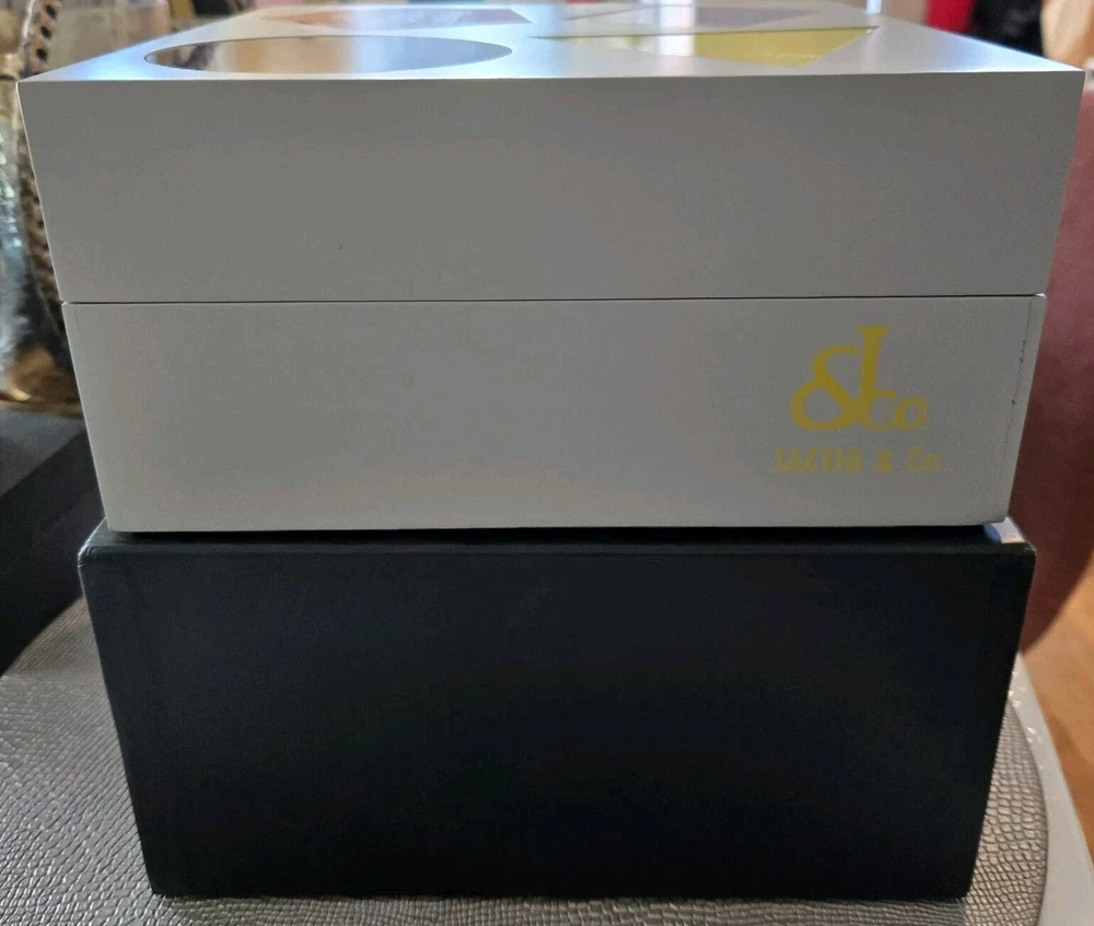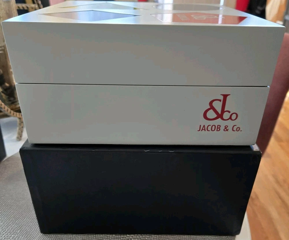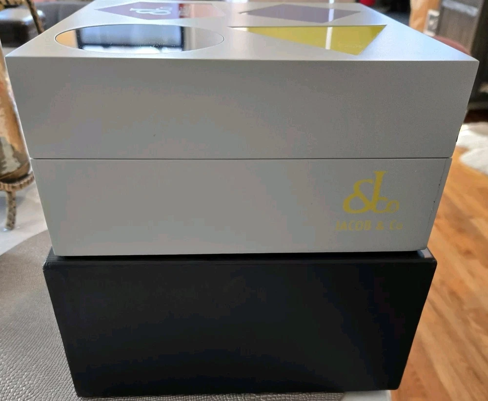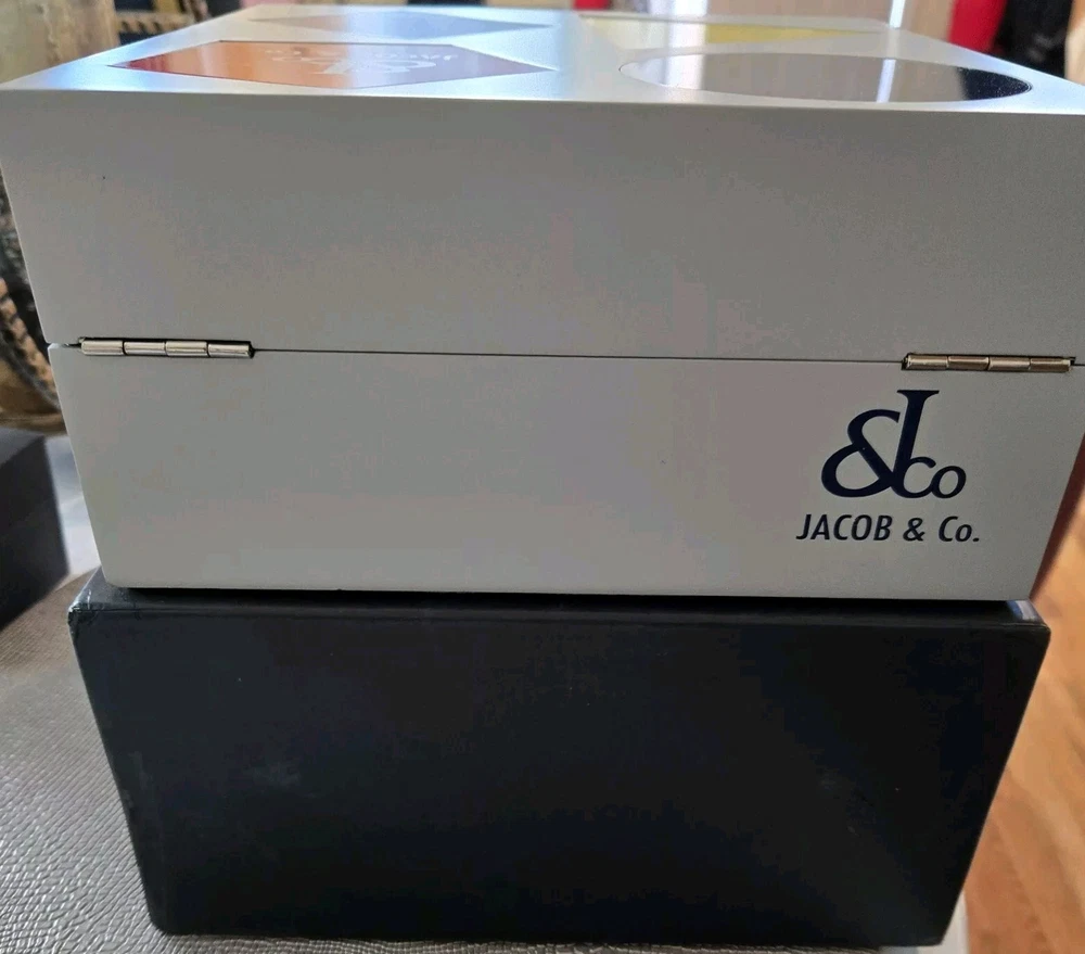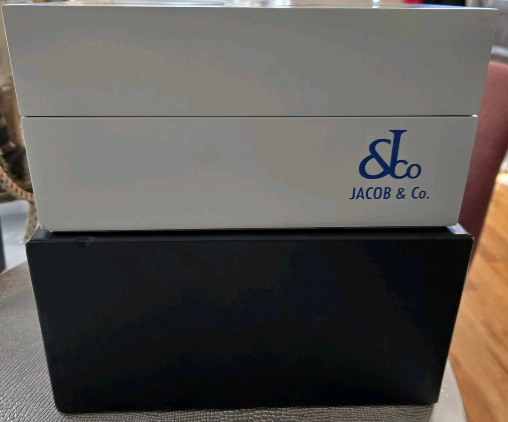 You are viewing a: ■ A RARE light gray color Jacob & Co. Wooden watch box in EXCELLENT CONDITION. It looks like it has a crack on the right side. It is a must-have for any luxury watch collector. The five time zones Naldi design is eye-catching and unique, making it a perfect addition to any watch collection. The box is sturdy and comes with a key, making it easy to open and store your prized timepieces. The multicolor design is perfect for those who appreciate style and elegance. ■ Jacob & Co. Gray wooden watch box, Jacob & Co. inside piece of watch box, Jacob & Co. Watch pillow and Black Jacob & Co. Outer protective box. Thank you, and please check out our other listings and auctions. Thank you.