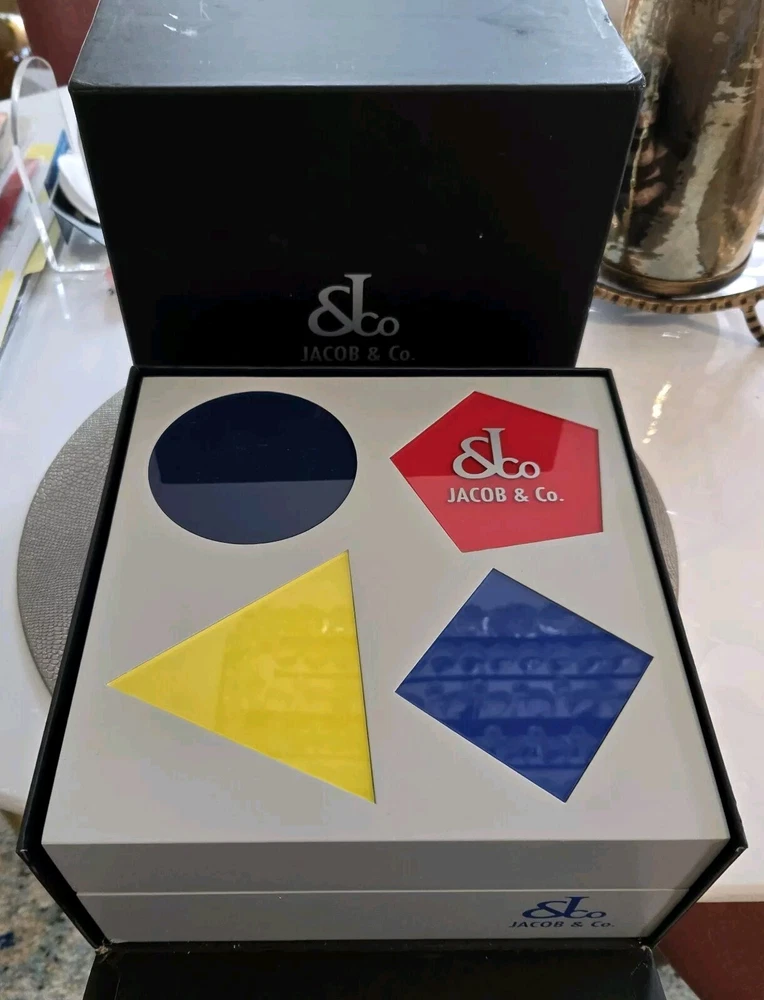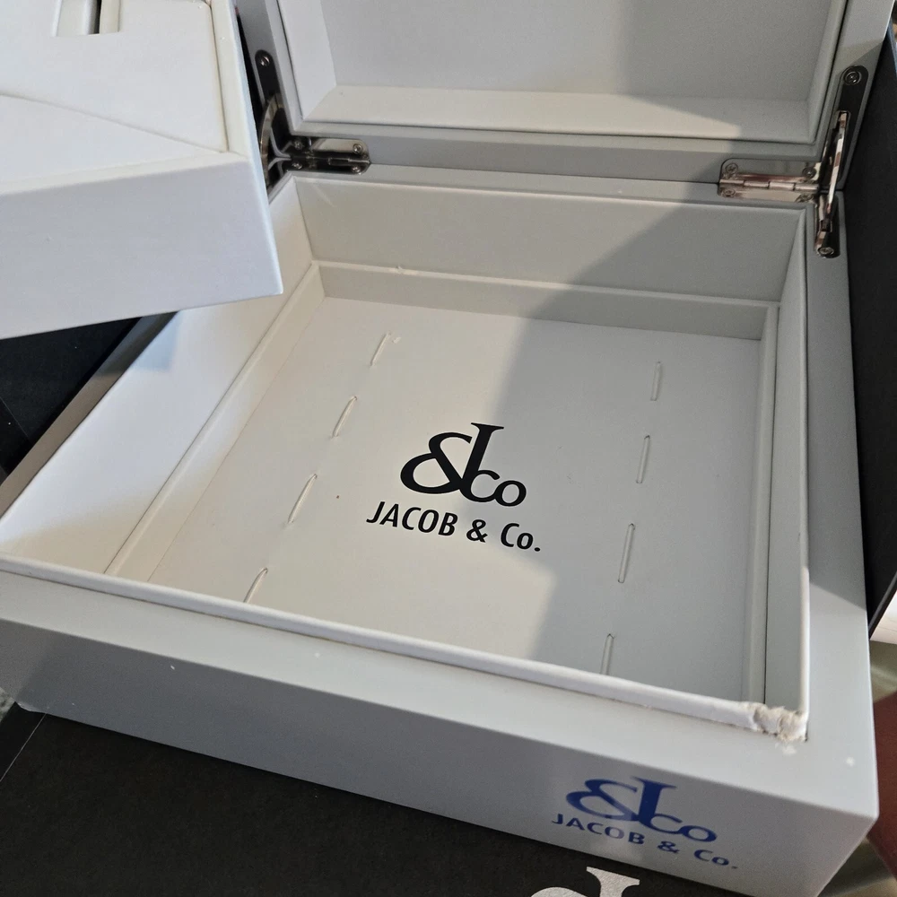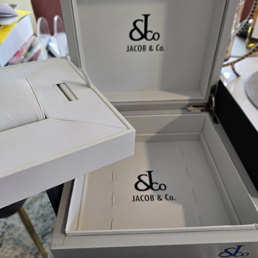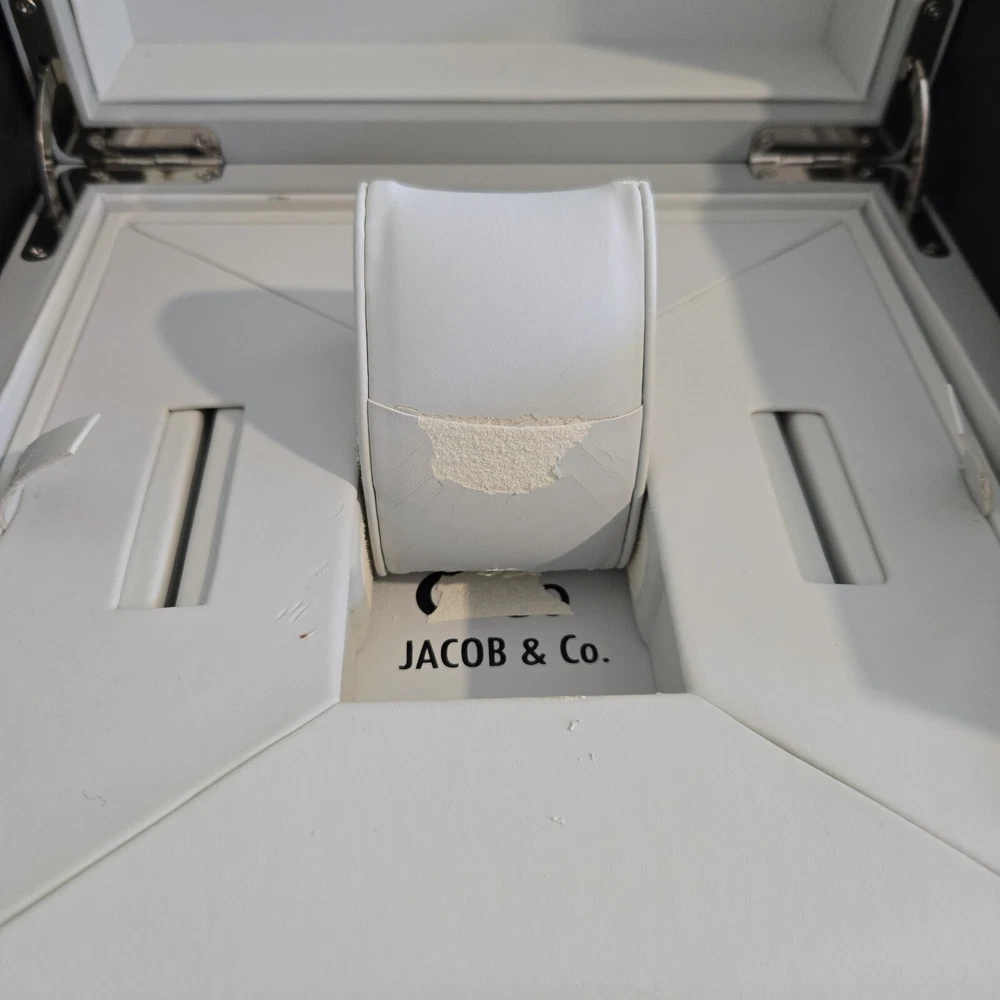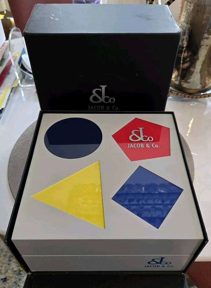 You are viewing a: ■ A RARE light gray color Jacob & Co. Wooden watch box in EXCELLENT CONDITION. It looks like it has a crack on the right side. It is a must-have for any luxury watch collector. The five time zones Naldi design is eye-catching and unique, making it a perfect addition to any watch collection. The box is sturdy and comes with a key, making it easy to open and store your prized timepieces. The multicolor design is perfect for those who appreciate style and elegance. ■ Jacob & Co. Gray wooden watch box, Jacob & Co. inside piece of watch box, Jacob & Co. Watch pillow and Black Jacob & Co. Outer protective box. Thank you, and please check out our other listings and auctions. Thank you.