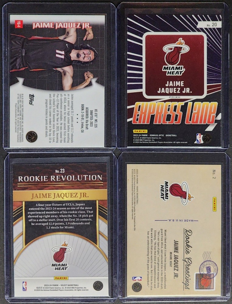 Elevate your basketball card collection with the $4 Jaime Jaquez Jr. Lot, featuring 4 rookie cards from the 2023-24 season. Each card showcases the promising talent of Jaime Jaquez Jr. in his Miami Heat gear, capturing the excitement of the NBA with vibrant, holographic designs and rare, short print inserts. The lot includes premium cards from top manufacturers such as Panini, ensuring a high-quality collectible that celebrates the athlete's first year in the league. Crafted in the United States, the cards come in standard size and are printed on sturdy card stock, guaranteeing their longevity as collectibles. With features like parallel and all-star inserts, these cards are original prints that are not autographed, maintaining the authenticity of the collectible. This lot is a must-have for fans and collectors alike, providing a unique snapshot of Jaquez's inaugural NBA season.
