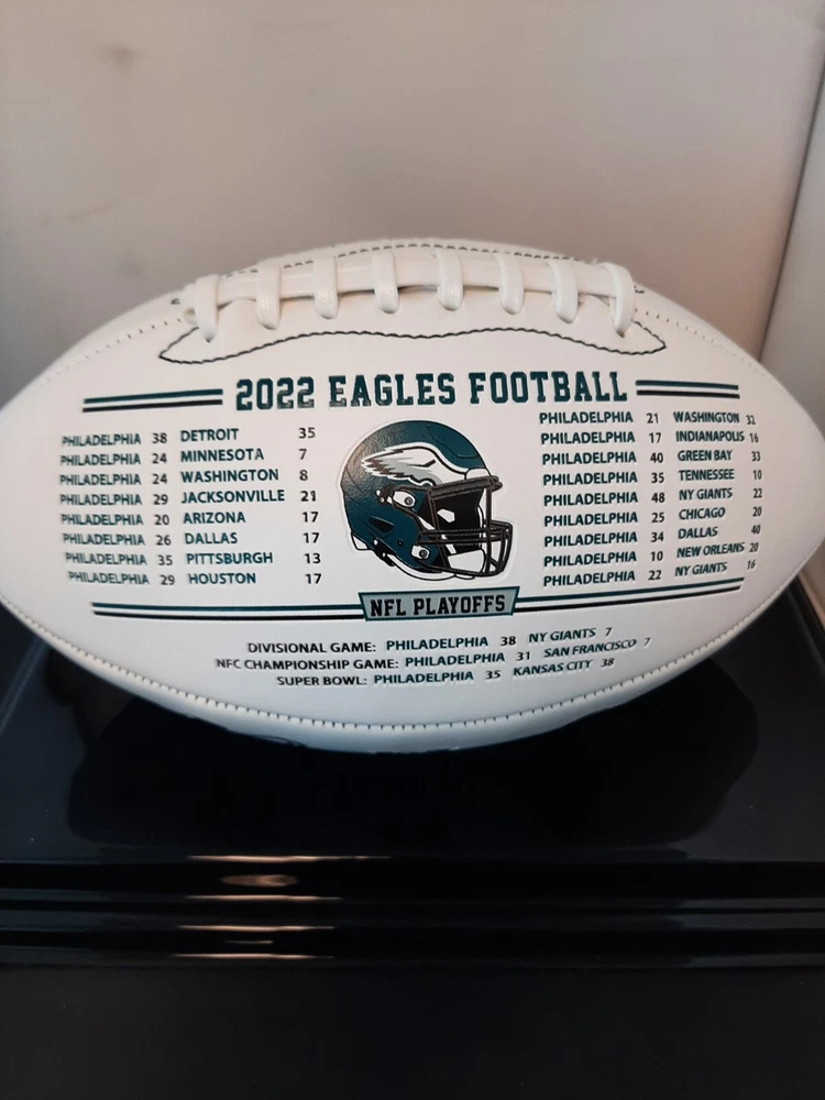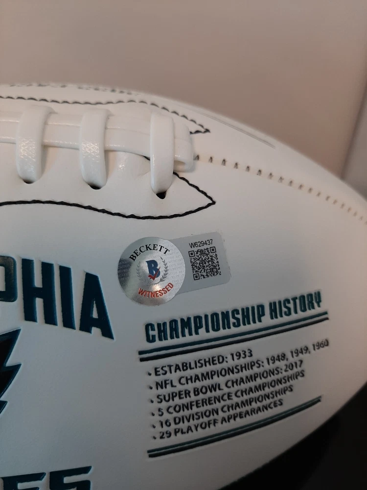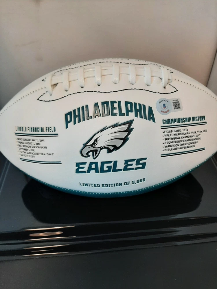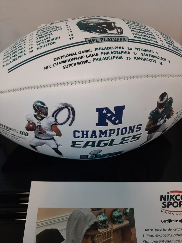 Celebrate the excitement of Super Bowl LVII with this autographed Philadelphia Eagles football featuring Jalen Hurts. This original ball is a must-have for any sports memorabilia collector and comes with authentication from Beckett Authentication Services (BAS). The football is perfect for displaying in your collection or as a gift for an avid Philadelphia Eagles fan. Get your hands on this one-of-a-kind product and show off your love for the team. Whether you're a die-hard fan or a collector, this autographed football is sure to be a valuable addition to your collection. Don't miss out on the opportunity to own a piece of history! This is a collector/fan "must-have" that can be passed down for generations. Autographed by Jalen Hurts Full Sized Football – ( fully licensed) Each fully embossed football Each football will come with an individually numbered certificate of authenticity Panel 1 – Eagles Logo, Stadium History, Championship History Panel 2 – 2022 Season Schedule with Opponents and Scores, Playoff Schedule with Opponents and Scores Panel 3 – NFC Champ Logo, Super Bowl Logo, Action Image of Jalen Hurts and Stats, Action Image of A.J. Brown and Stats, Eagles Logo Exclusive to Nikco Sports Signature Slightly Imperfect COA Number May Vary