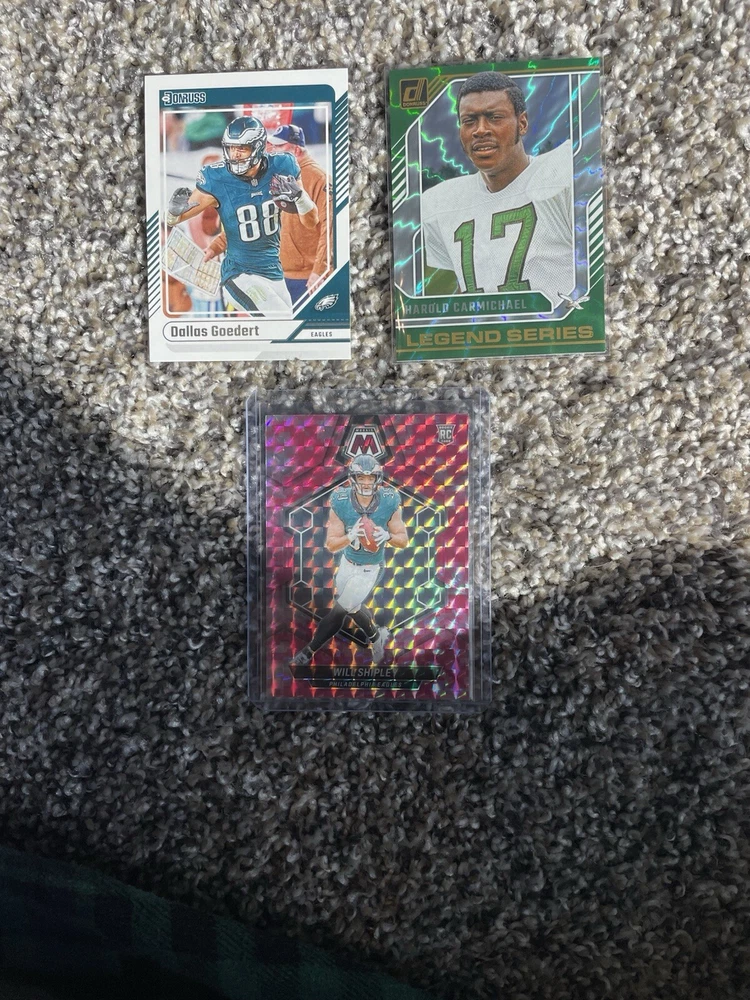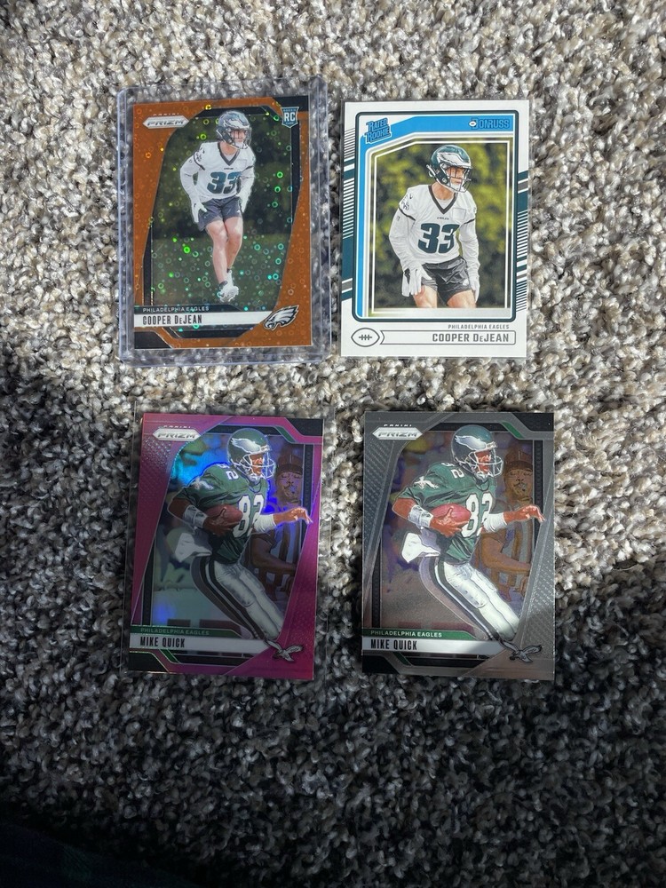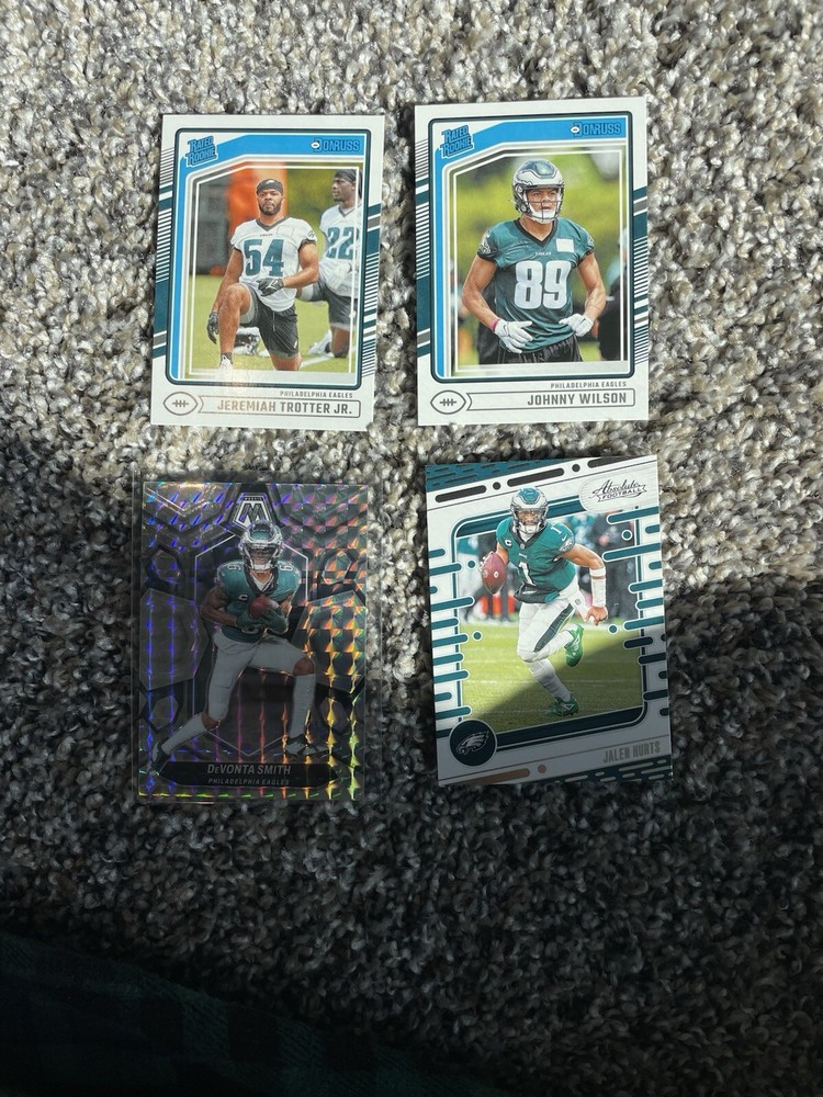 Type:Sports Trading CardFeatures:RookieVintage:NoMaterial:Card StockCard Size:StandardAutographed:NoManufacturer:PaniniPlayer/Athlete:Jalen Hurts, saquon barkley, Aaron Finch, cooper dejean, DeVonta SmithCountry of Origin:United StatesSport:FootballNumber of Cards:22Team:Philadelphia EaglesLanguage:EnglishLeague:National Football League (NFL)Original/Licensed Reprint:Original