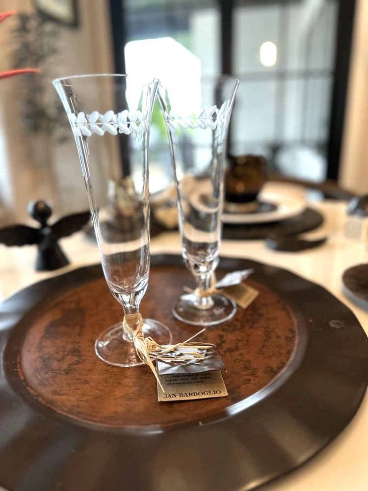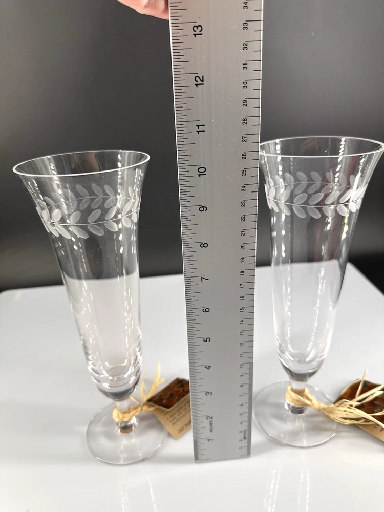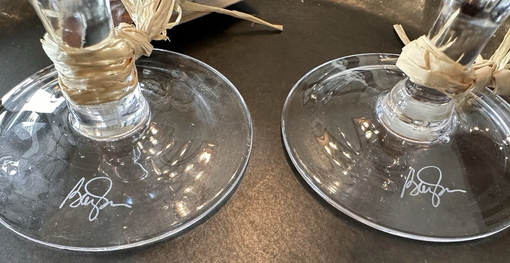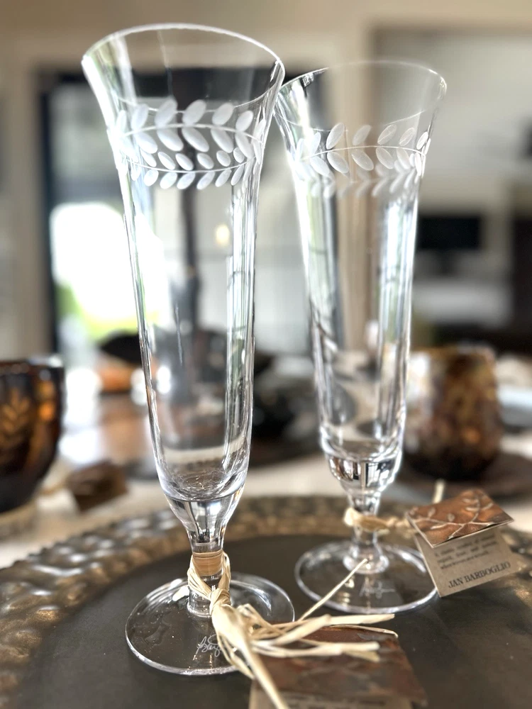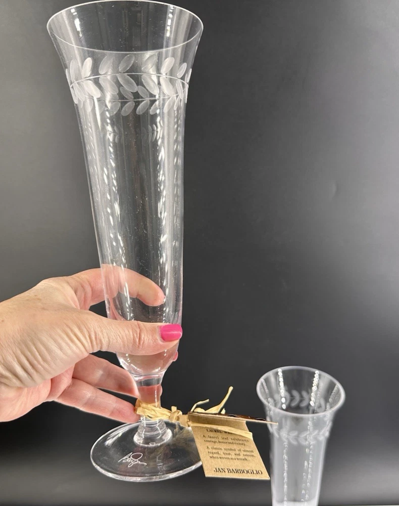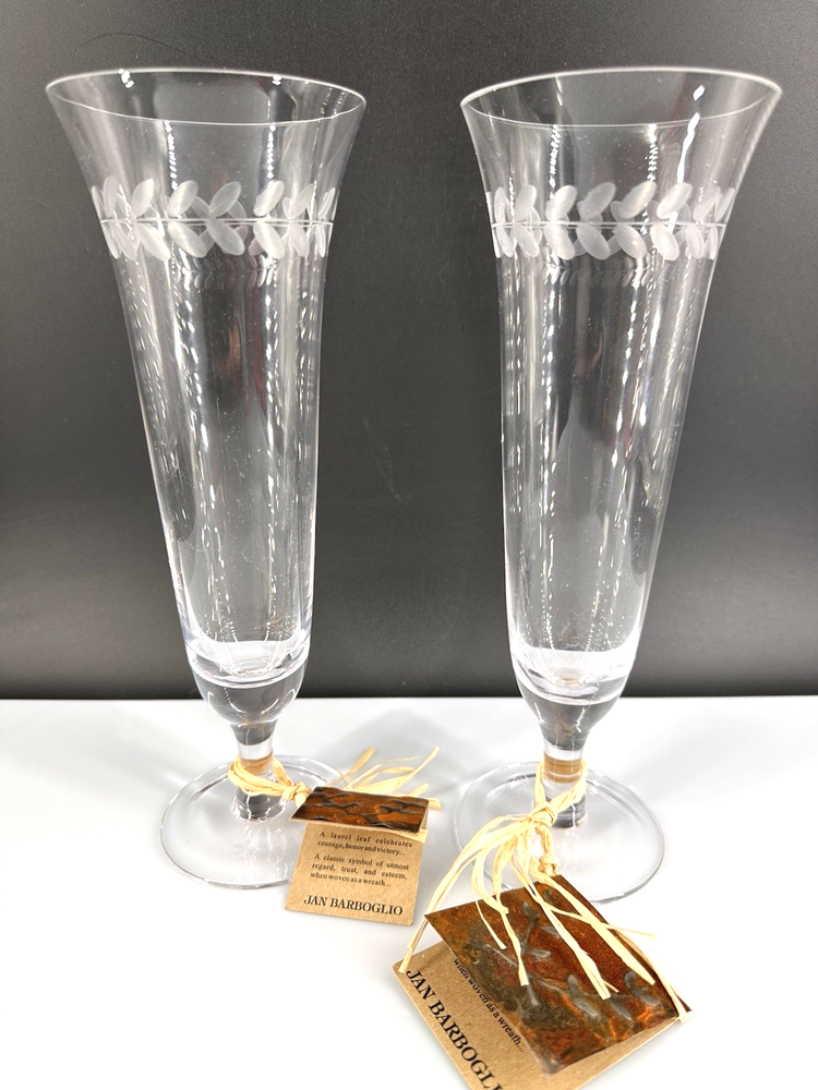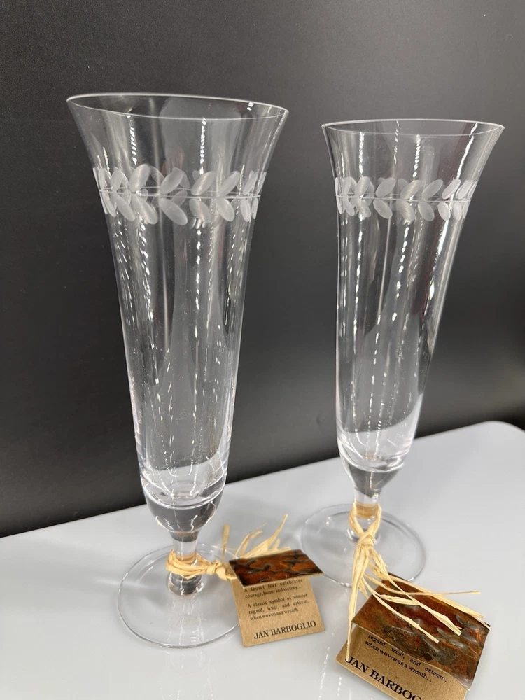 You will receive two (2) handblown etched signed Jan Barboglio flute glasses. SEE VIDEO to appreciate these stunning mouth blown The product is a set of two Jan Barboglio champagne glasses with a retired Laurel Wreath design, handblown and individually crafted. ETCHED SIGNATURE is on the bottom of stem of each piece. Both stemware glasses have original tags. The glasses have an elegant and rustic style, featuring a clear etched design signed by the artist. Made in Mexico, these artisanal pieces are a collector's delight with a timeless design that adds a touch of luxury to any home decor. Each piece is unique and original, perfect for special occasions like Christmas, Mother's Day, Father's Day, Easter, and New Years. Perfect for adding a touch of cultural inspiration and focal point to any space. You may see additional items in the background of pictures. If you are new here, these other pieces will be listed either this week or next week. So, you get a sneak peak of what is coming up next. :) YouBeYou LLC Now back to your Jan Barboglio piece............. Elevate your special moments with these exquisite, retired champagne flutes by the renowned Jan Barboglio. Standing 10 inches tall, each clear, mouth-blown glass features an elegant laurel engraving that symbolizes victory and celebration. Brand new and never used, these stunning pieces have no chips or cracks, ensuring their pristine condition. When originally purchased, they did not come with a box. Perfect for raising a toast or beautifully repurposing as charming bud vases on each side of your centerpiece, these versatile and timeless glasses add a touch of sophistication and style to any occasion or decor. Key features: Retired and no longer can purchase retail Authentic Jan Barboglio hand etched signed Hand-blown and mouth blown (see tag) glass with bubbles (not chips) Laurel wreath design Made in Mexico, collectible and decorative No chips or cracks, and is new condition Unique, handcrafted, and primitive aesthetic Perfect for home decor, gift-giving, or steware / bar collection Has tags on each glass Also can be used for bud vases. Don’t miss out on this rare, original Mexican art piece — a beautiful addition to any home, office, or collection. Buy now to own a genuine Jan Barboglio sculpture that embodies Mexican craftsmanship and cultural history! Feel free to check my Ebay store for the ones currently listed or if you love Barboglio's work and are a collector of her iron, you may want to save (by clicking on the heart) my store to see what is coming up next! I have a huge collection of Jan Barboglio’s ironwork and I post approximately 2-4 items a week. If you are a collector of her work, like many do, or just love her style, please feel free to look at other pieces of her ironwork within my Ebay store. I have a category dedicated for Jan Barboglio items. You can click here to see what I have in my shop currently: VTG JAN BARBOGLIO, Iron, Metal You may want to save my Ebay store to see the ones that are coming up next week! Here is my store name and link; YouBeYou LLC ABOUT JAN BARBOGLIO......... In all of Barboglio's iron/metal pieces you will see brown or black in the piece and this is the finishing process that adds to its distinct iron metal beauty. Each of the artist piece is slightly different in shading texture, color, irregularities, and imperfections - because they are hand individually casted. The talent that goes into these pieces is just remarkable -- talent of combining materials is what makes each object of Jan Barboglio's original and distinctive and has become her trademark. She uses old wood, honed and combined with iron, glass, crystal, and stone mixed with silver and etched cut glass guarantees each object's authenticity. Her pieces are known to be aesthetically warm, primitively handsome and are TRUE WORKS OF ART. Of HIGH QUALITY and always sensuous to the touch, her works have become highly COLLECTABLE. These iron pieces handmade by Jan Barboglio have a long history in Mexico and Latin American countries. Each piece is hand worked. It is individually cast or wrought, hammered, sanded and hand finished. Slight irregularities, imperfections and variations of shading and texture are characteristics of the material and the old world finishing process that adds to its distinct beauty. Each piece is slightly different. JAN BARBOGLIO After many years designing clothing with her sister in their Barboglio Cristina & Jan Collection, Jan Barboglio began sculpting accessories and furniture for her own home. Her childhood, spent in north central Mexico, would prove to be fertile ground for inspiration, and every object created by her would carry with it the rich history and romance of old Mexico. Barboglio’s initial designs of wax grabbers were for her silver, bronze and iron candelabra. Altar pieces and house blessing crosses were integrated into her own home furnishings. Her love of entertainment would later result in her own iron chargers, platters and chafing dishes. Leather goods and saddle stools began to fill her home. All of these influences are evident in her Jan Barboglio Collection of today. If you have any questions even after you have purchased the item --- I am here for you to answer any questions that you may have! I strive to work diligently with every buyer to ensure they are a satisfied buyer, so please contact me anytime. This is a pre-owned item and I take great care to accurately describe the item but please see the pictures for full details. While we do our best to list every item in detail, these are vintage and pre-owned items, and some flaws are to be expected. Please see all photos/ video as they are a large part of the description of our items. Items come from a smoke-free environment. Each item is described in accurate detail with multiple measurements and various photos at different angles front and back, side to side, top and bottom. I have additional similar items that I have yet
