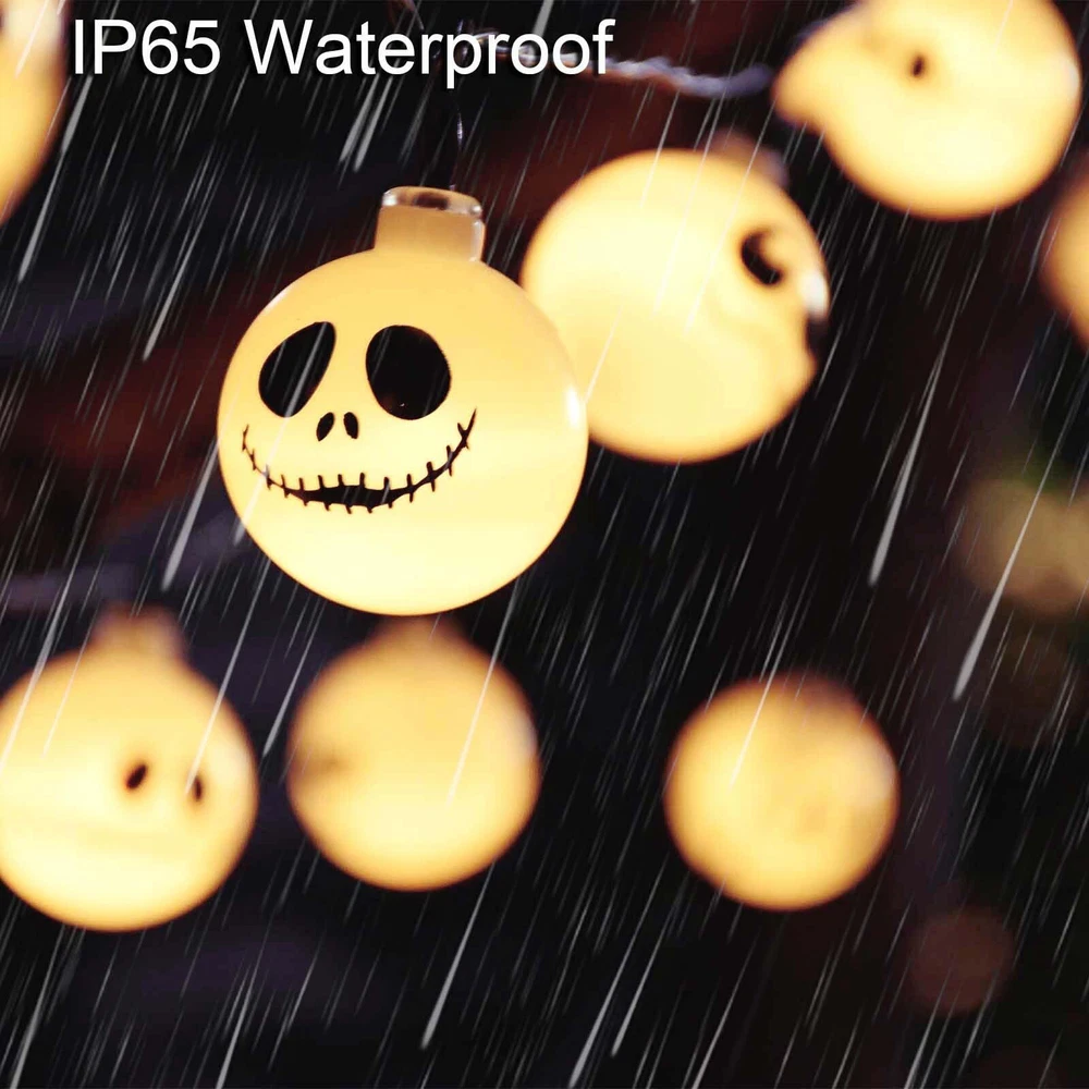 Janchs 30 LED Battery Operated Christmas Lights for Nightmare Before Christmas Decorations, Battery Outdoor Lights for Indoor Outdoor Decorations Home, Bedroom, Patio, Balcony,Christmas Party 【Rich Function】:battery powered, warm white, with Remote, 8 modes, shatterproof and waterproof, memory function, dimmable, timer. 【Unique Outdoor Halloween Decorations】The lights display four different faces for a truly fun and unique christmas yard decoration. 【Outdoor String Lights】:battery operated hanging string lights with 30 bulbs, total length: 26ft,which is enough for wrapping around as your bedroom, living room, dining room, garland, wreath , gazebo, deck, balcony, umbrella. holiday christmas halloween tree or wherever you like to light up. 【Safe & Reliable LED String Lights】:the lights are cool to the touch (even after having them on for hours at 100%). 10 brightness adjustment levels and 8 lighting modes to choose. 【Easy to install 】:no socket is required, no matter how far you are, you can install the battery string lights wherever you want, and hanging wherever you want. 【IP65 waterproof】:Fully Weatherproof, regardless of heavy snow, hot sunny weather, This product is designed with four different faces. It will be the focal point of your spooky garden decor. 【Widely Use for Any Occasions】: great for xmas tree garland wreath garden patio Indoor outdoor christmas decorations. could be used for halloween, christmas or a outdoor party.
