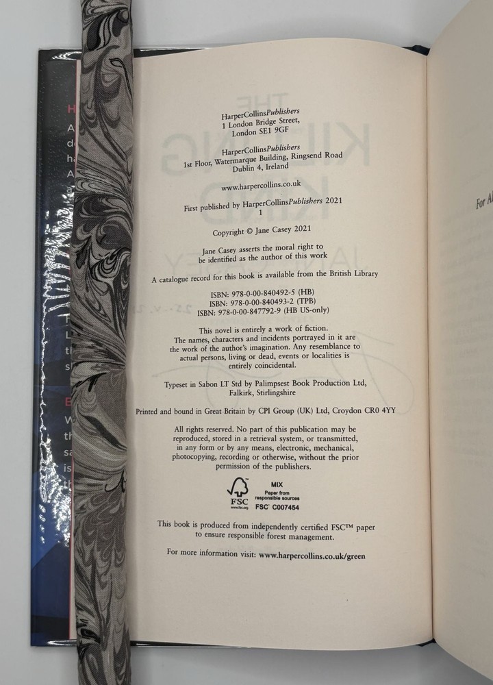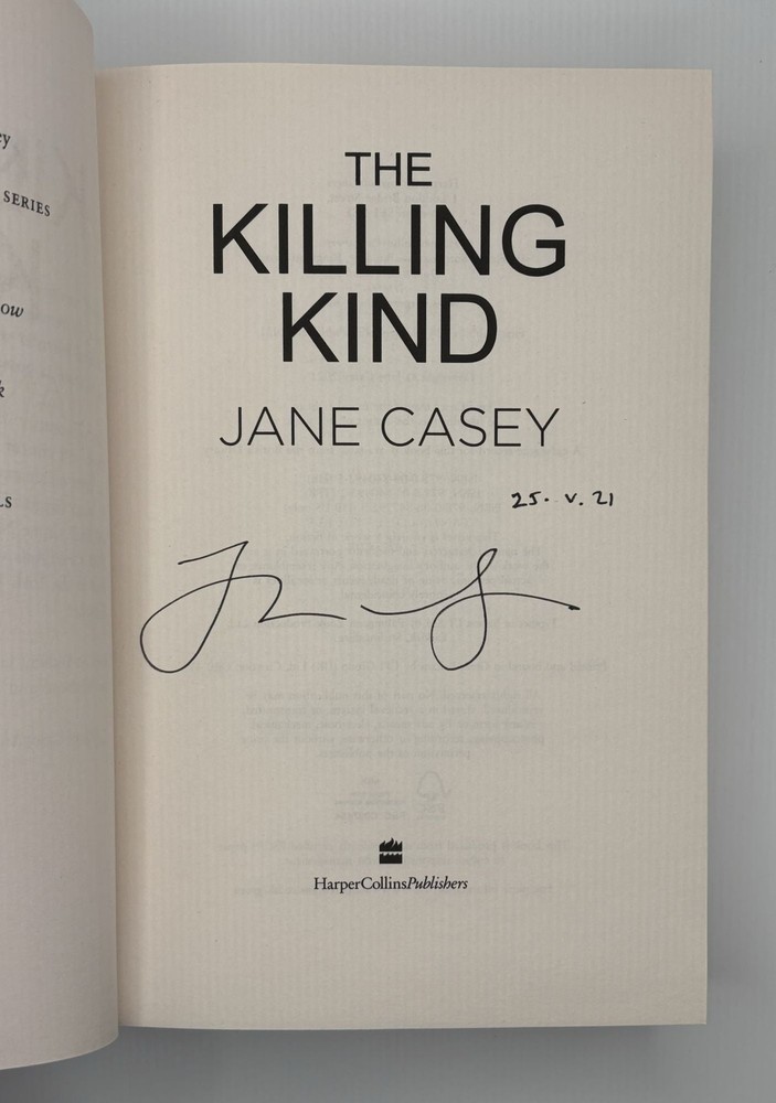 THE KILLING MIND [Signed] Author: Casey, Jane Title: THE KILLING MIND [Signed] Publication: London, UK: HarperCollins, 2021 Edition: First UK Edition, First Printing Description: Octavo, 474 pages. In Very Good condition with Near Fine condition dust jacket. Spine is black and blue with white and red lettering and a red umbrella motif. Dust jacket protected by mylar covering, price uncut: "£12.99" on front flap. Boards have mild general wear along spine head and tail. Signed flat and dated "25.v.21" by James Casey on title page. Shelved in hallway. Seller ID: 1388192 Subject: Literature Welcome to the eBay store of Second Story Books! DC's Oldest Rare and Used Bookstore, Second Story Books operates two open shops in the Washington D.C. metropolitan area. We have an extensive internet presence and provide accredited appraisals member ASA. This listing was created by Bibliopolis.