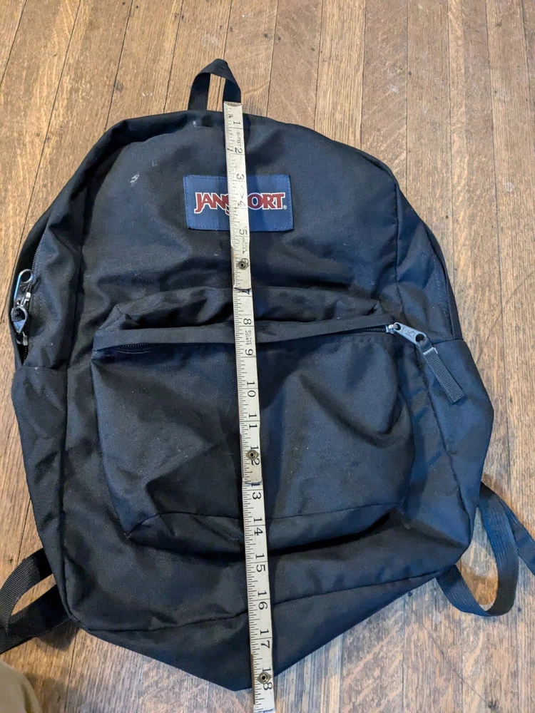 This is in good condition. It does need to be cleaned up a little bit. Perhaps it can be thrown through the washer even. Please ask if you have any questions. I have the measurements and the photos as well. This JanSport backpack is a medium-sized, solid navy blue with black accents. It features a zip closure and adjustable straps, making it perfect for travel or casual use. The backpack is made of durable polyester canvas material and has a fabric lining. It's a great choice for anyone needing a reliable and stylish school backpack. The unisex design makes it suitable for both men and women. The JanSport brand is known for its quality and this backpack lives up to that standard. Made in the United States, it's a practical and fashionable choice for anyone looking for a reliable backpack.