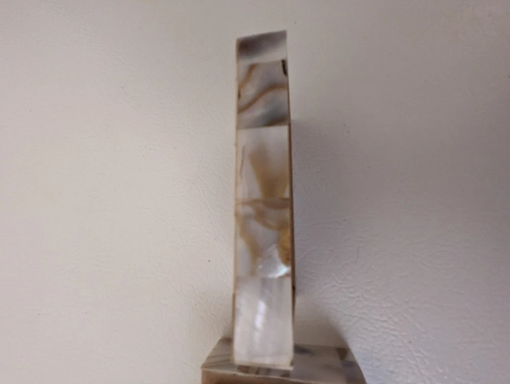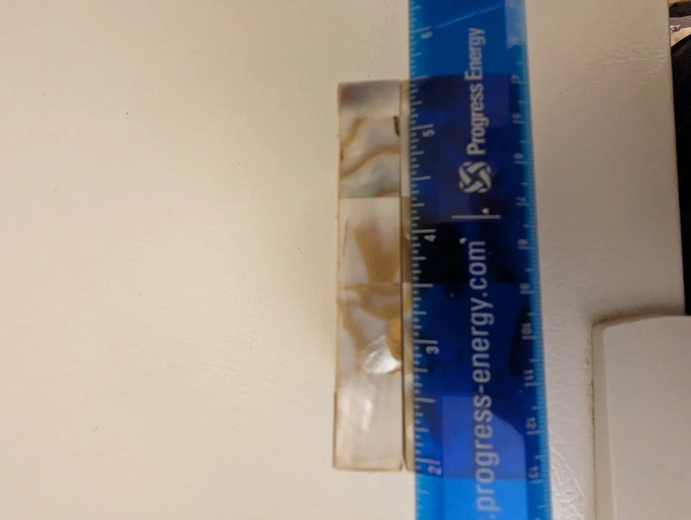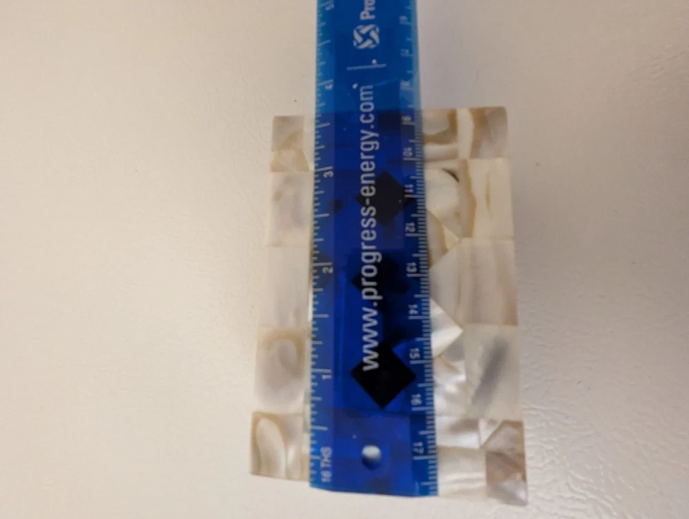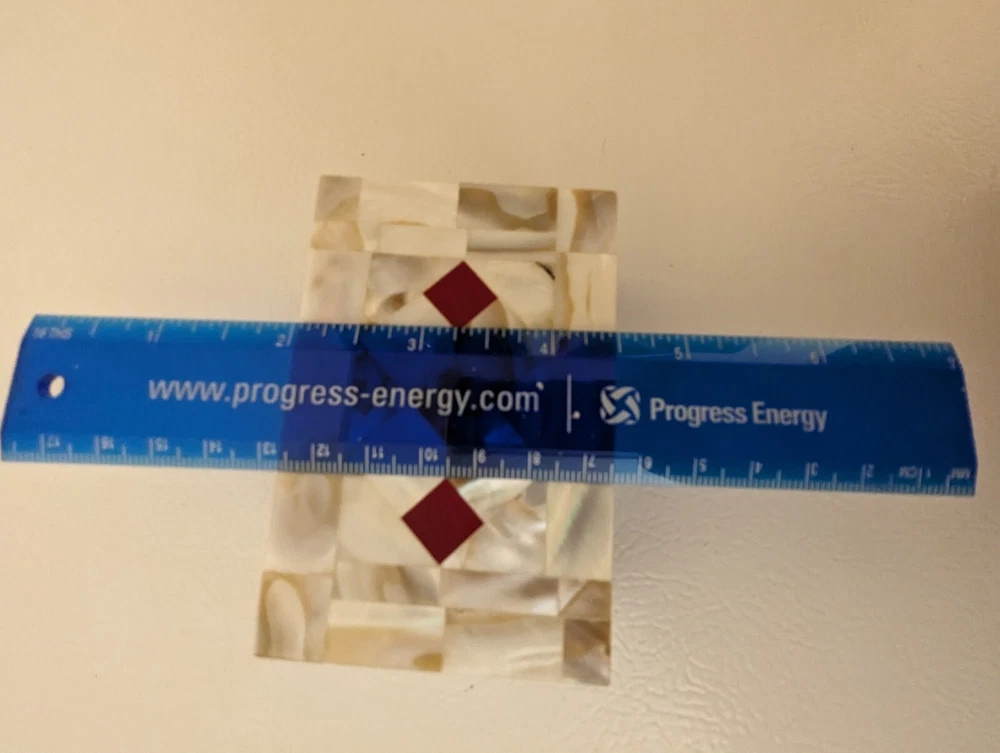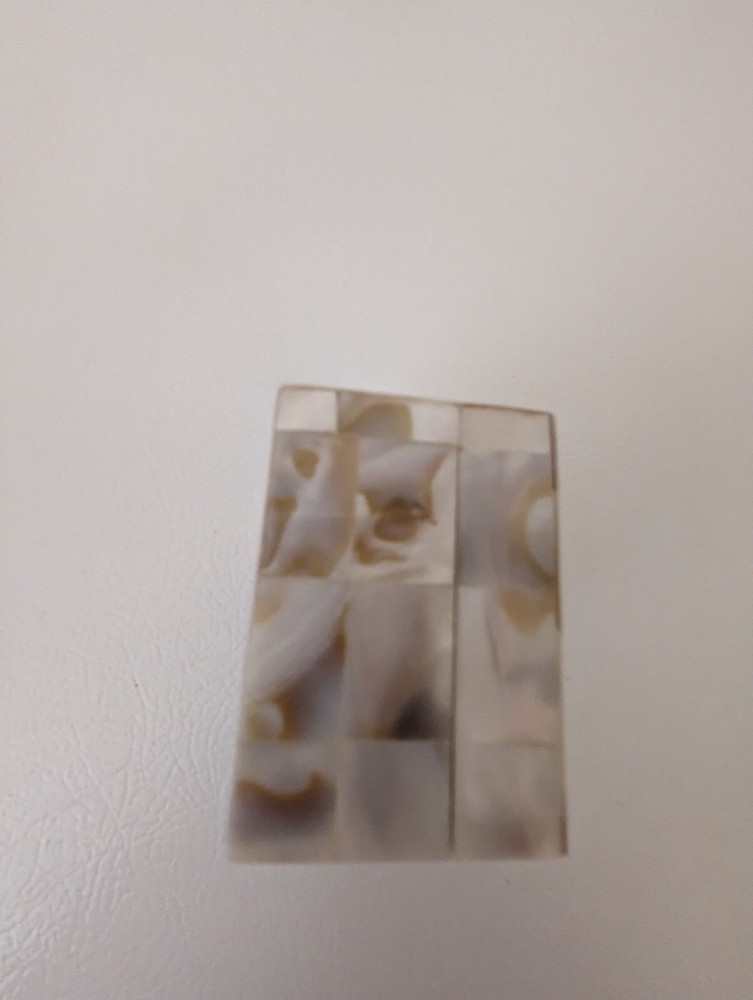 Mother of pearl/wood trinket box made in Japan. 3 3/4" x 2 1/2" in used condition. Nice diamond design on lid and inside of box is in excellent condition. Slight flaws to mother of pearl on back of lid (pictures 5 and 9), please see pictures. Would make a good tooth box for a child to present to the Tooth Fairy. Questions, please don't hesitate to ask. Thank you.