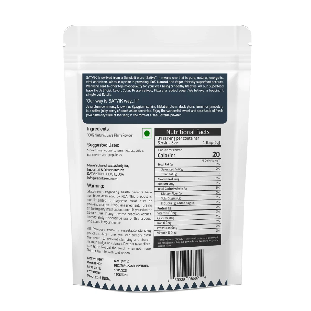 Enjoy the wonderful sweet & sour taste of fresh Java Plum any time of the year, in the form of shelf stable powder. JAVA PLUM commonly known as Syzygium cumini, Malabar Plum, Black Plum, Jamun or Jambolan, is a native juicy berry of South Asian countries. 100% Natural Vegan Gluten-free Non-GMO Halal Allergen Free No Artificial flavor, color or preservatives added No added Sugar Ingredients: 100% Natural Java Plum Powder Suggested Use: Smoothies, Yogurt, Jams, Jellies, Juice, Ice cream & Popsicles Net Wt.: 6 oz. It comes in resealable stand-up pouch. After use you can simply close the pouch to prevent clumping and store it in your fridge or cabinet. Protect from direct sun light and do not handle with wet spoon. Java Plum Jamun Fruit Powder, 100% Natural, 6 oz, No Added Sugar-SATVIKZONE Enjoy the wonderful sweet & sour taste of fresh Java Plum any time of the year, in the form of shelf stable powder. JAVA PLUM commonly known as Syzygium cumini, Malabar Plum, Black Plum, Jamun or Jambolan, is a native juicy berry of South Asian countries.100% NaturalVeganGluten-freeNon-GMOHalalAllergen FreeNo Artificial flavor, color or preservatives addedNo added SugarIngredients: 100% Natural Java Plum PowderSuggested Use: Smoothies, Yogurt, Jams, Jellies, Juice, Ice cream & PopsiclesNet Wt.: 6 oz.It comes in resealable stand-up pouch. After use you can simply close the pouch to prevent clumping and store it in your fridge or cabinet. Protect from direct sun light and do not handle with wet spoon. Java Plum Jamun Fruit Powder, 100% Natural, 6 oz, No Added Sugar-SATVIKZONE Enjoy the wonderful sweet & sour taste of fresh Java Plum any time of the year, in the form of shelf stable powder. JAVA PLUM commonly known as Syzygium cumini, Malabar Plum, Black Plum, Jamun or Jambolan, is a native juicy berry of South Asian countries. 100% Natural Vegan Gluten-free Non-GMO Halal Allergen Free No Artificial flavor, color or preservatives added No added Sugar Ingredients: 100% Natural Java Plum Powder Suggested Use: Smoothies, Yogurt, Jams, Jellies, Juice, Ice cream & Popsicles Net Wt.: 6 oz. It comes in resealable stand-up pouch. After use you can simply close the pouch to prevent clumping and store it in your fridge or cabinet. Protect from direct sun light and do not handle with wet spoon. × × × × × × × × × Buy now and save! Shipping info Click the Shipping & Payments tab above the listing description for more info Click the Shipping & Payments tab above the listing description for more info! Additional delivery notes PICK UP OPTION Sorry, our items are NOT available for pick-up. PAYMENT Immediate payment is required upon selecting "Buy It Now" or upon checking out through the cart. We accept payment via U.S. PayPal accounts and all Major Credit Cards, Debit Cards & Google Pay. We are legally required to collect sales tax in those states and localities where we maintain a physical presence (nexus). The applicable amount of sales tax charged to an order will be calculated based on the shipment destination's state and local sales tax laws. Thank you for shopping with us on eBay! Additional Information No additional information at this time Ask seller a question You might also like Pineapple Fruit Powder, 100% Natural, 6 oz, No Added Sugar-SATVIKZONE Activated Charcoal with Tea Tree Oil, 4.2oz, Handmade Soap Bar–SATVIKZONE Mango Fruit Powder, 100% Natural, 6 oz, No Added Sugar-SATVIKZONE Sugarcane Premix Fruit Powder, 100% Natural, 6 oz, No Added Sugar-SATVIKZONE Contact To contact our Customer Service Team, simply click the button here and our Customer Service team will be happy to assist. Ask seller a question © Satvikzone Shipping & Payments Click the Shipping & Payments tab above the listing description for more info Payment Accepted Payment Methods Immediate payment is required upon selecting "Buy It Now" or upon checking out through the cart. We accept payment via U.S. PayPal accounts and all Major Credit Cards, Debit Cards & Google Pay. We are legally required to collect sales tax in those states and localities where we maintain a physical presence (nexus). The applicable amount of sales tax charged to an order will be calculated based on the shipment destination's state and local sales tax laws. Thank you for shopping with us on eBay! Returns Returns are accepted Items must be returned within 30 days of the auction ending Buyer will pay for return shipping. eBay integration by