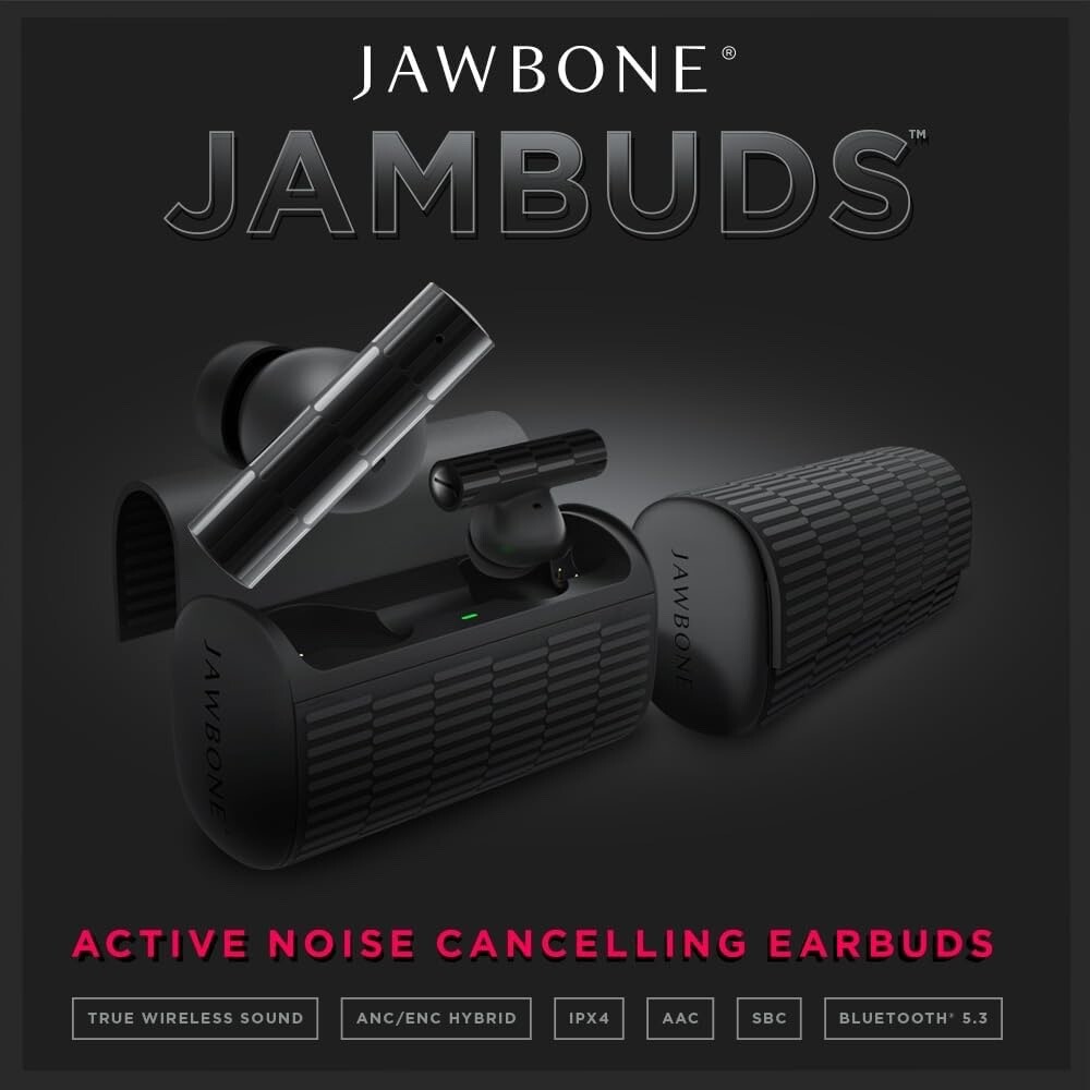 SUPERIOR SOUND PERFORMANCE - Enjoy pure bass audio with a 10mm driver and a frequency response range of 20Hz-20kHz with Active Noise Cancellation. Whether you're jamming out to songs or taking a call, expect crystal clear sound and zero interruptions with these wireless earbuds. ORGANIC ELEGANCE - Style meets function with the Jawbone Jambuds case, inspired by traditional Japanese tatami mats. This sleek case offers six full recharges for your TWS Bluetooth earbuds and features a textured fabric body with a magnetic clasp for a secure, satisfying snap every time you open or close it. BLUETOOTH 5.3 WIDE COMPATIBILITY - Enjoy a faster, more reliable connection with our Bluetooth ear buds. Experience seamless pairing and low latency for smooth, uninterrupted audio. Whether you’re at home, work, or on the move, stay effortlessly connected to your devices. YOUR EVERYDAY COMPANION - Designed for life on the move, these headphone earbuds are comfortable enough for all-day wear and boast an IPX4 rating, making them resistant to sweat and rain. Stay aware of your surroundings, just switch to ambient mode and stay connected without missing a beat. QUICK CHARGE, LONG-LASTING PLAY - Get back to your music faster with a quick 1.5-hour charge for the case and just 1 hour for the wireless buds. The Jambuds have a 4 hours battery life and the case offers six full recharges, perfect for those on the go, ensuring you never miss a beat and always stay connected. I NSTANT MODE TOGGLE & VOICE ASSISTANT - Switch between active noise cancellation and ambient mode by holding either earbud for 2 seconds. Activate your voice assistant tap, release, then touch and hold for 2 seconds. Enjoy full control and hands-free convenience with these wireless Bluetooth buds. EFFORTLESS TAPS - Jambuds are easy to control on the left earbud, double tap to lower the volume or triple tap to replay the previous track. The right earbud allows you to increase the volume with a double tap or skip to the next track with a triple tap. Play or pause music by tapping the center, answer calls with just a couple of taps, or reject calls by touch and hold for 2 seconds on either earbud.