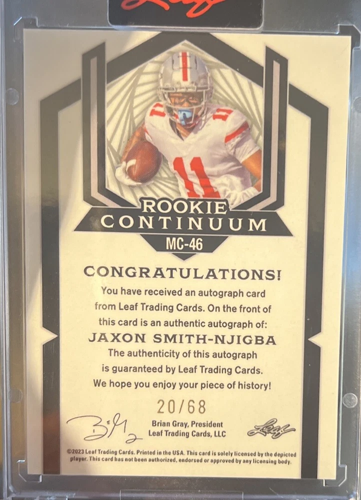 For the avid collector of sports trading cards, this Jaxon Smith-Njigba Leaf Continuum card is a must-have. Featuring an authentic autograph from the Seattle Seahawks and Ohio State Buckeyes player, this 2020 Leaf card is a rare find with a limited print run of only 68. The card is serial numbered and certified by Leaf, ensuring its authenticity as a rookie card. This Gold parallel/variety card is not only a great addition to any collection, but also an excellent investment opportunity. As a short print card, it is sure to be a sought-after item among sports trading card enthusiasts. Don't miss out on the chance to own a piece of football history with this Jaxon Smith-Njigba Leaf Continuum card.